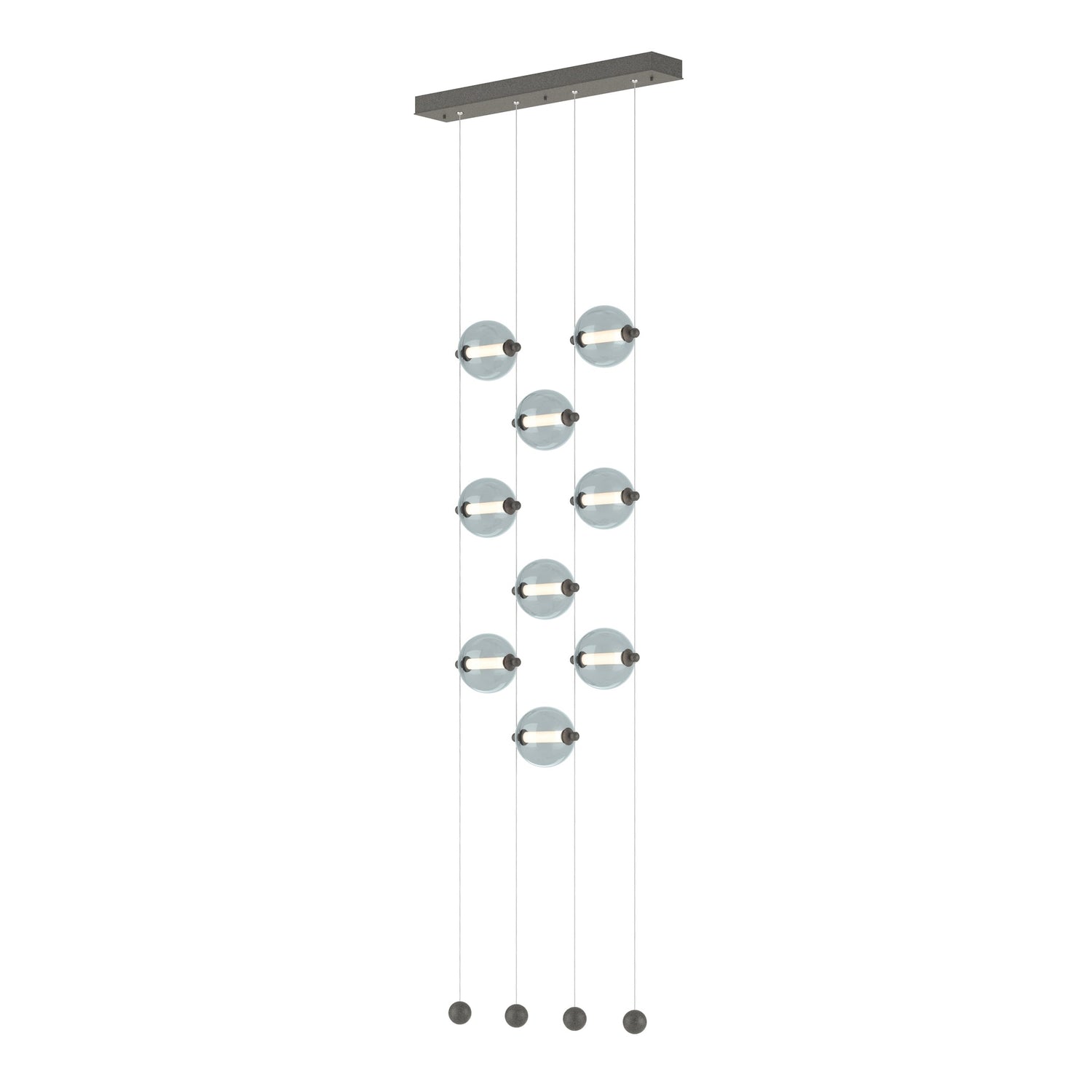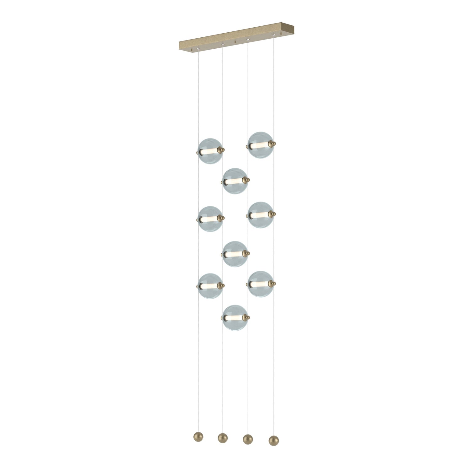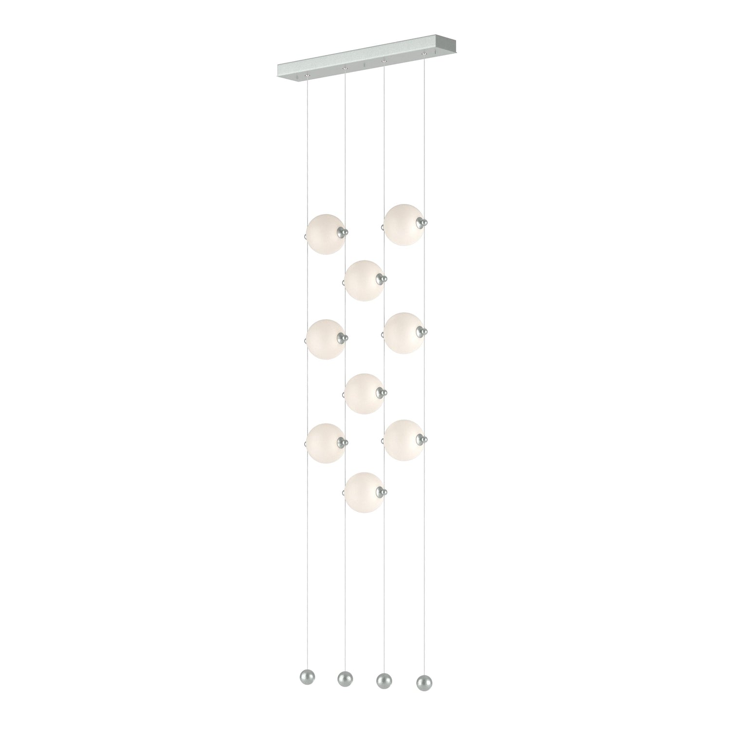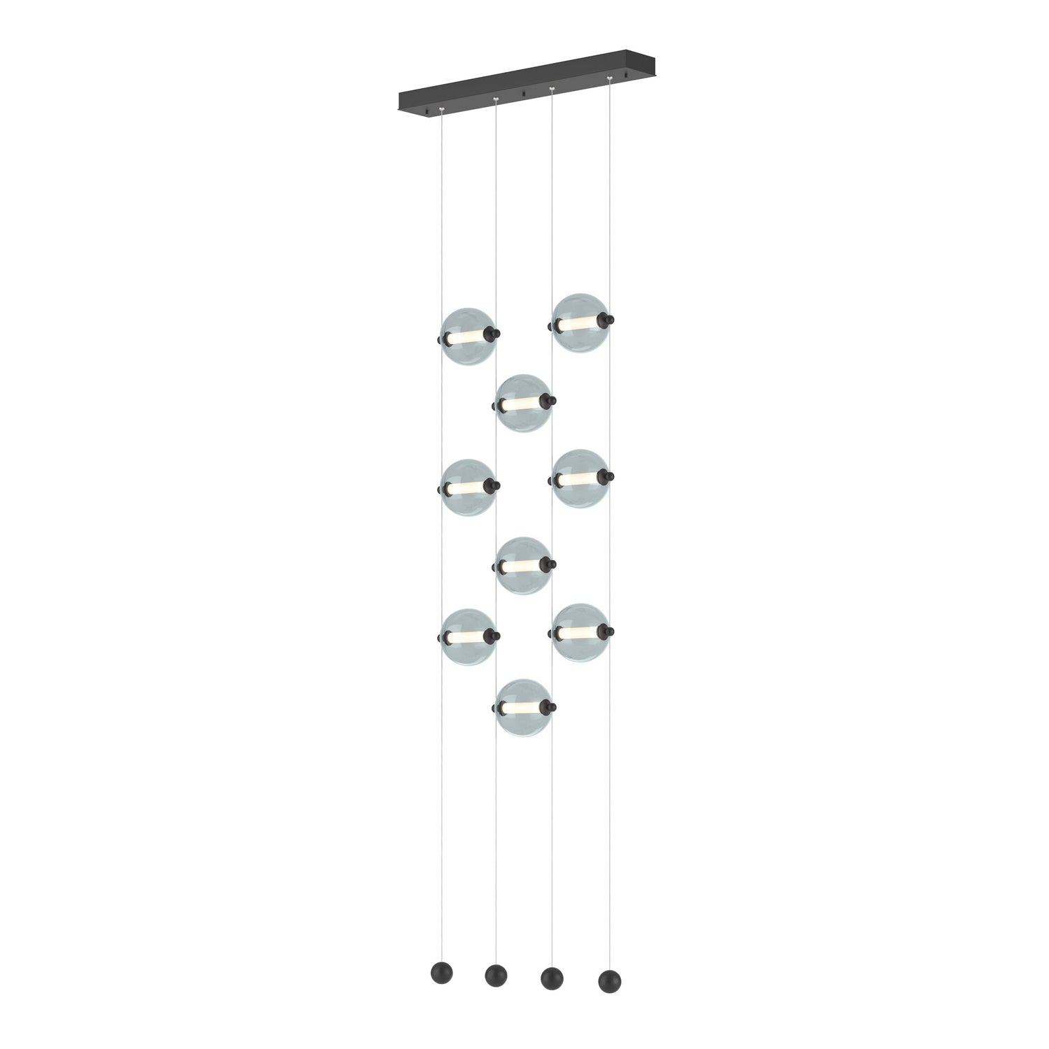 Cable hung dedicated LED pendant with nine glass globes on a single canopy. Each glass globe and LED array may be individually height adjusted from 40 to 220. Optional floor mounting plate (#905210) sold separately. Each fixture is capable up supporting up to 14 total glass globe and LED arrays with additional LED arrays sold separately.