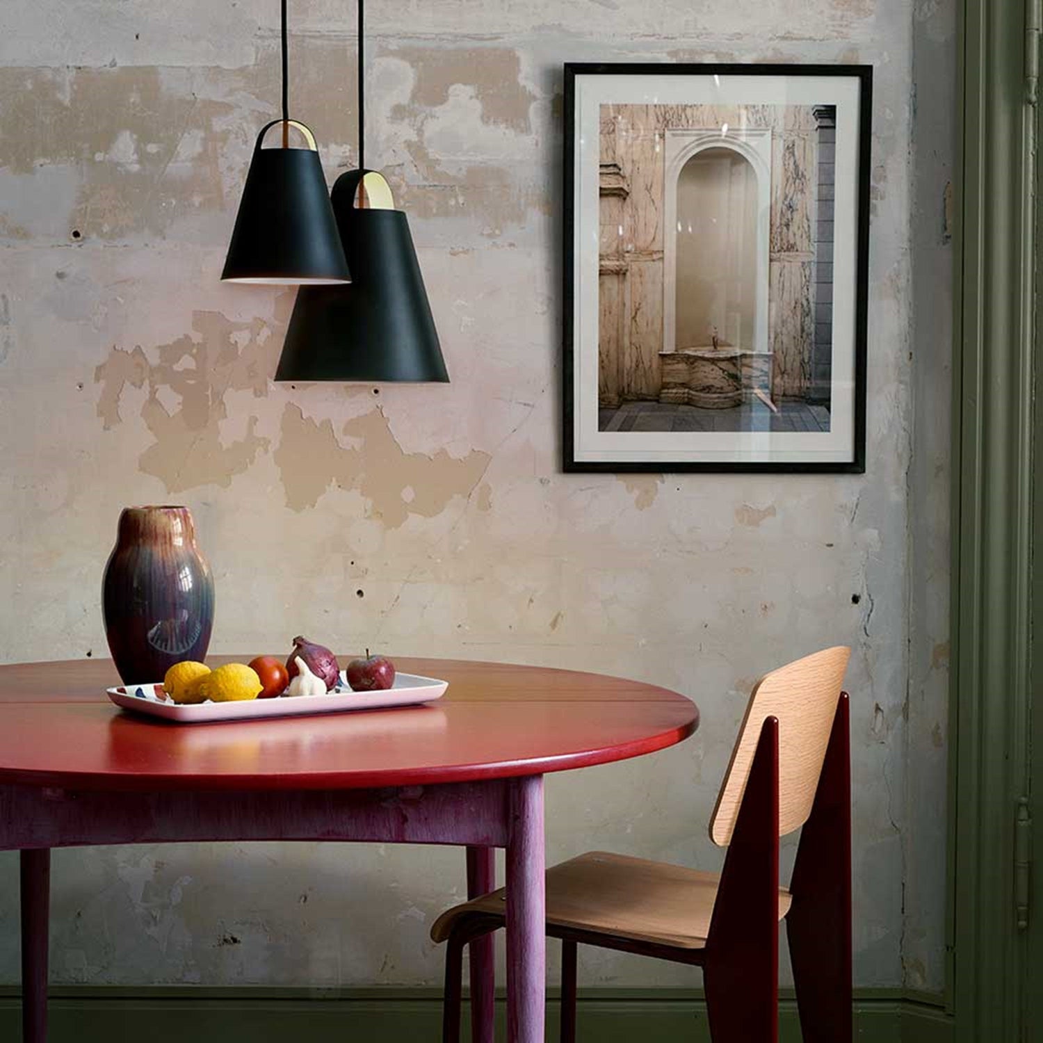 The fixture emits soft comfortable downlight. The conical shape and the mattee, white-painted inside help assure even distribution of the light. The opening in the top of the fixture provides decorative illumination of the arch above, and ensures that the fixture retains the full expression of its visual shape both when illuminated and when switched off.
