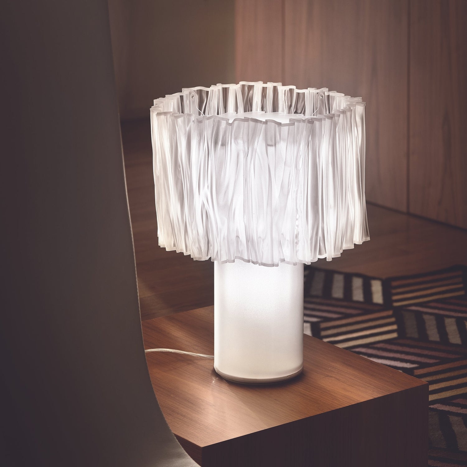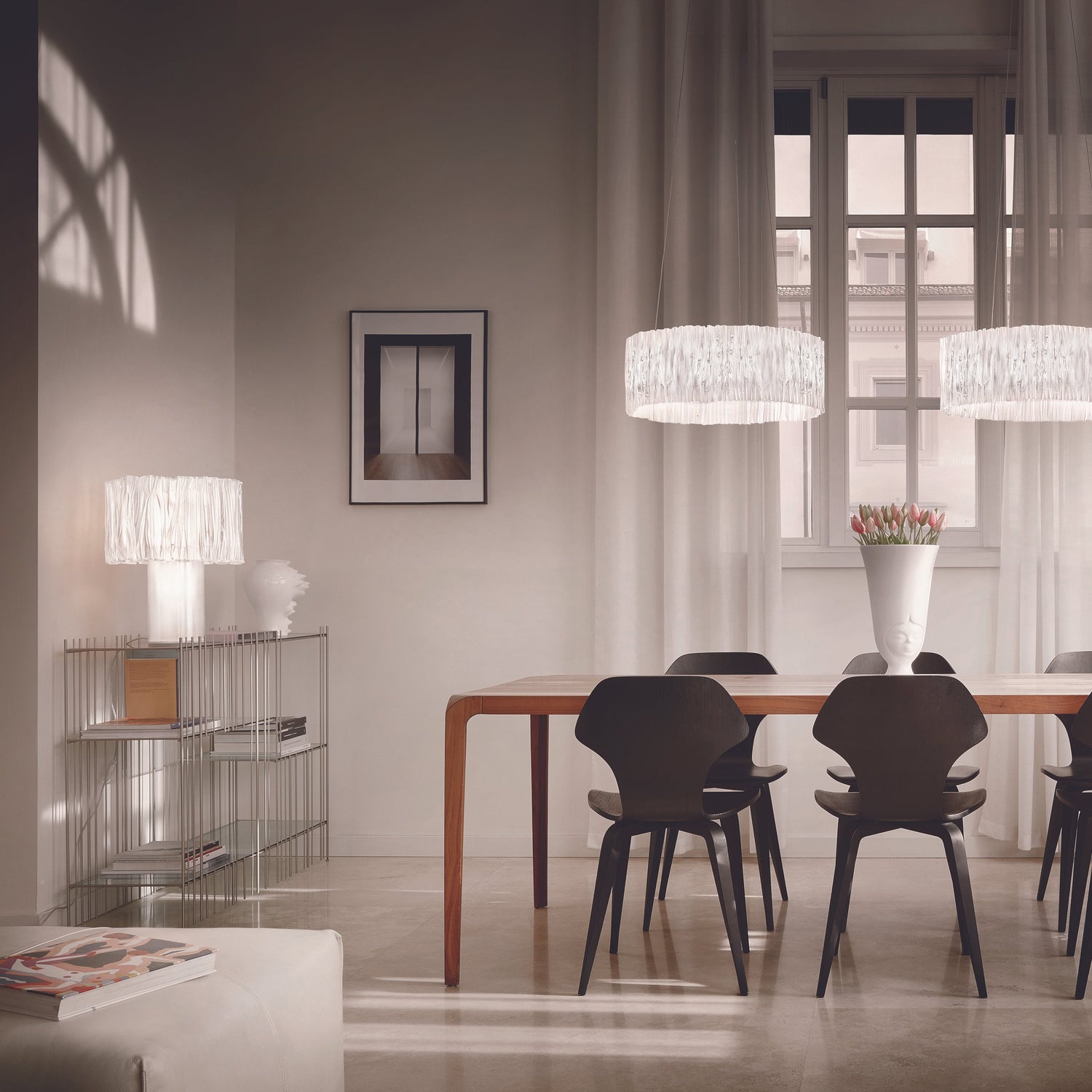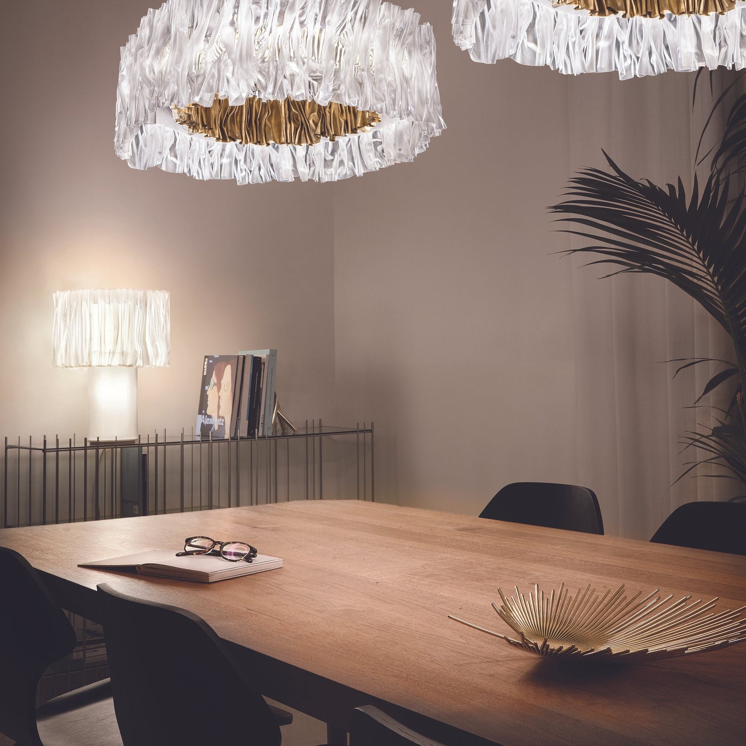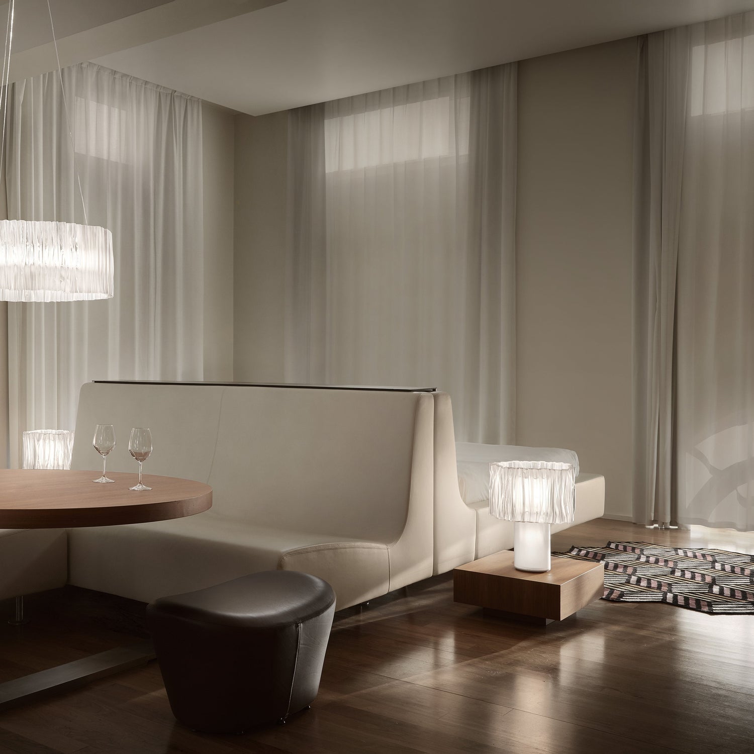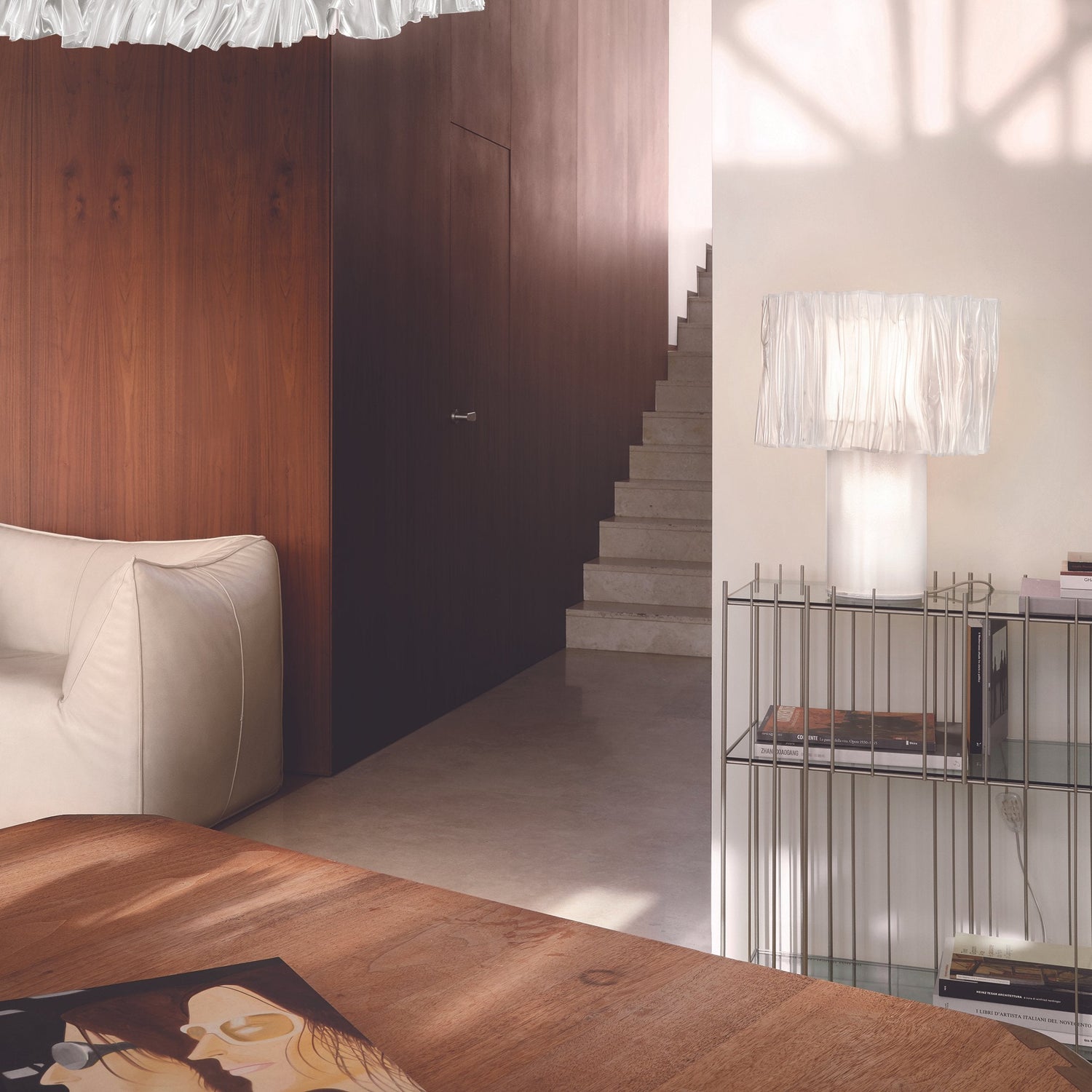 The Accord¨¦on collection represents a new narrative in contemporary design: Slamp's exclusive Lentiflex material is heated and hand molded by the women who tailor light. Every piece is one of a kind, but the lamps are identical. A thin steel plaque on the side of each lamp is inscribed with Handmade in Italy, attesting to the product's unique design. The internal structure and clasp match the fluidity of the external pliss¨¦ diffusor and prevent the accumulation of dust. The lamp has dual switches, one for the shade and another for the base. Both light sources can be used together, and cast a uniform glow and a cotton-like silhouette. The table lamp's shade and sockets have magnets to facilitate cleaning and changing the bulbs.