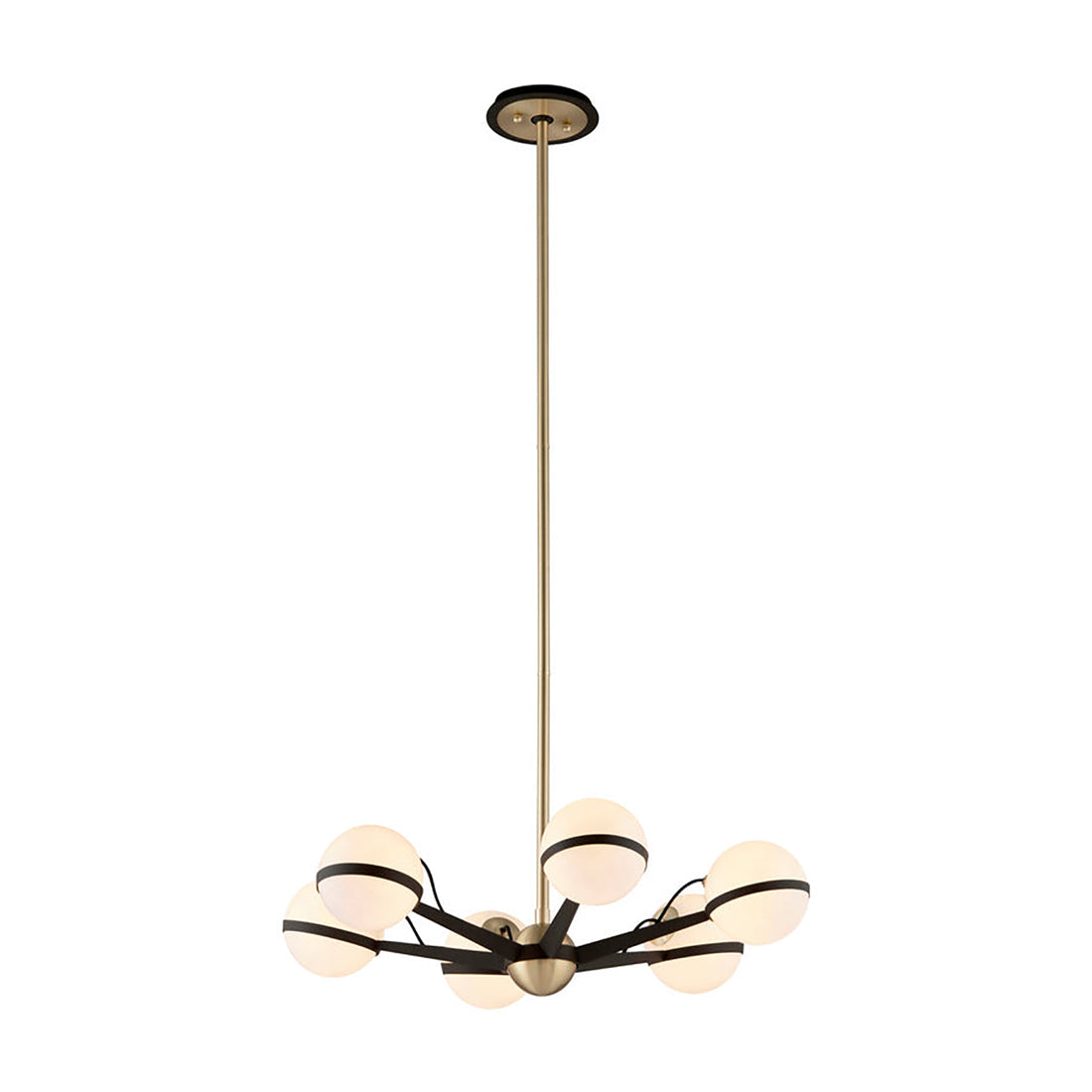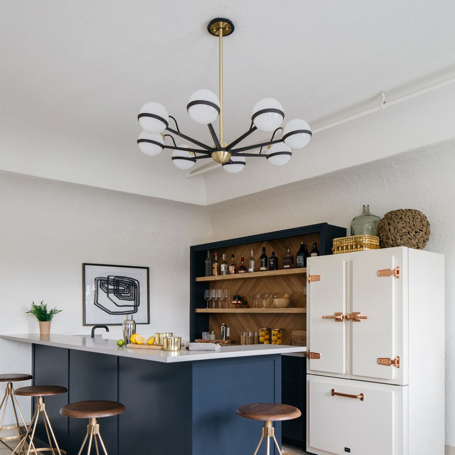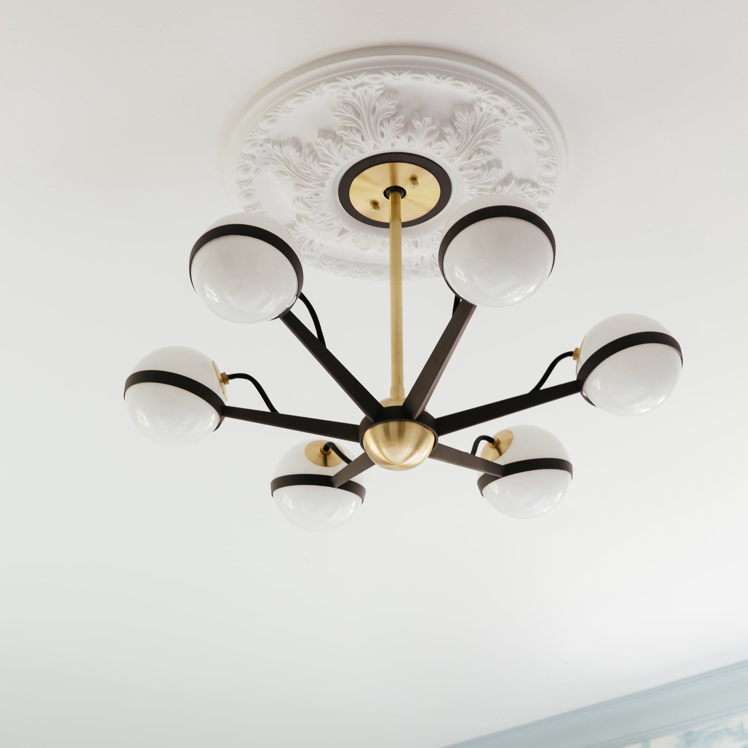 A new spin on atomic age allure, Ace's strong elements are accented by diagonal and off-center lines. Glossy orb diffusers evenly distribute the light. One of the cool details that makes it such a standout piece are the small woven cords running from the arms to the back of the diffusers, where a curved piece of Brushed Brass or Polished Nickel matches the sphere and rod at Ace's core.