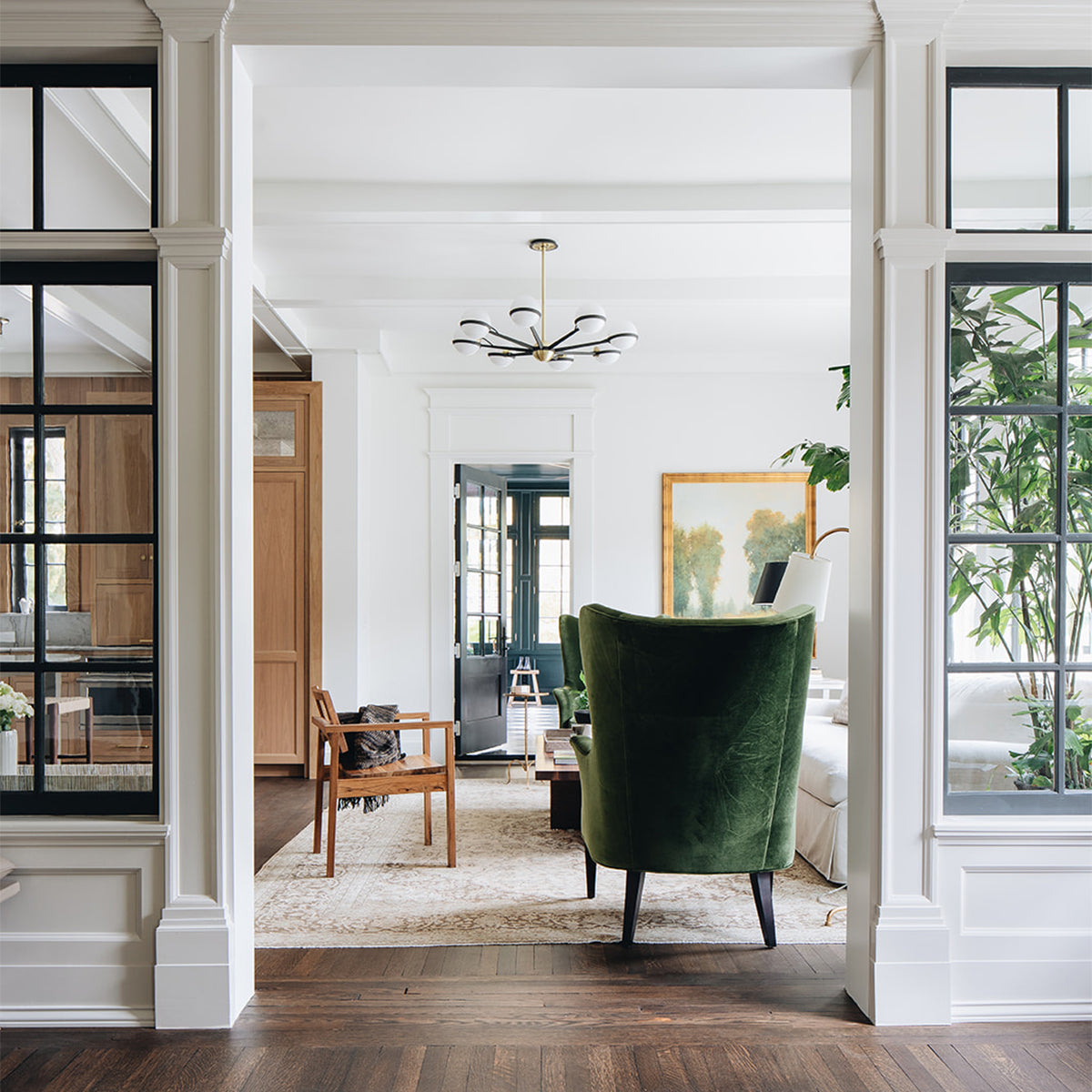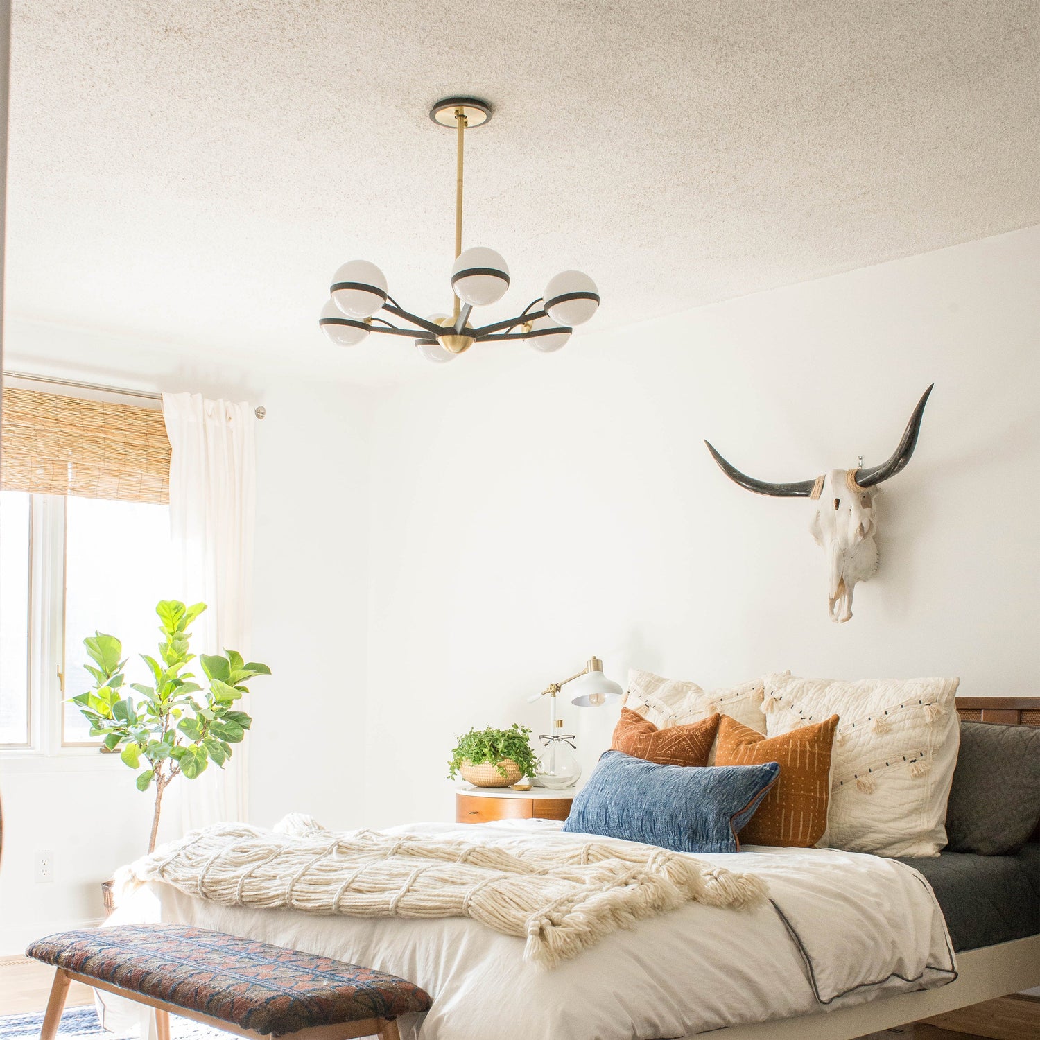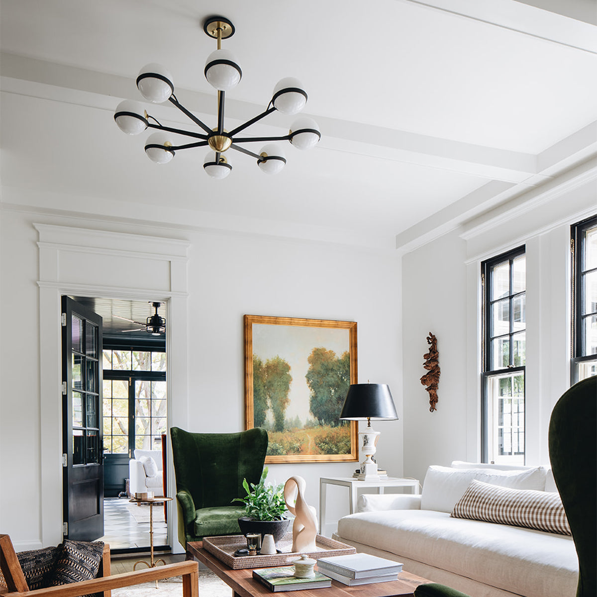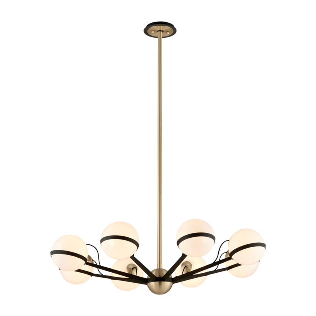 A new spin on atomic age allure, Ace's strong elements are accented by diagonal and off-center lines. Glossy orb diffusers evenly distribute the light. One of the cool details that makes it such a standout piece are the small woven cords running from the arms to the back of the diffusers, where a curved piece of Brushed Brass or Polished Nickel matches the sphere and rod at Ace's core.