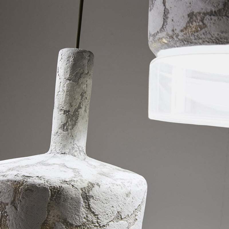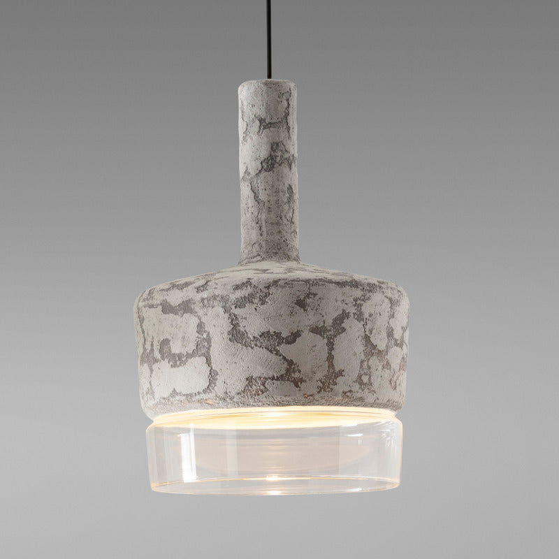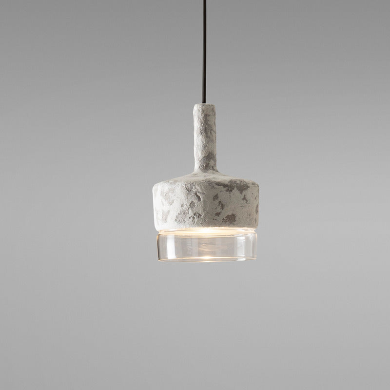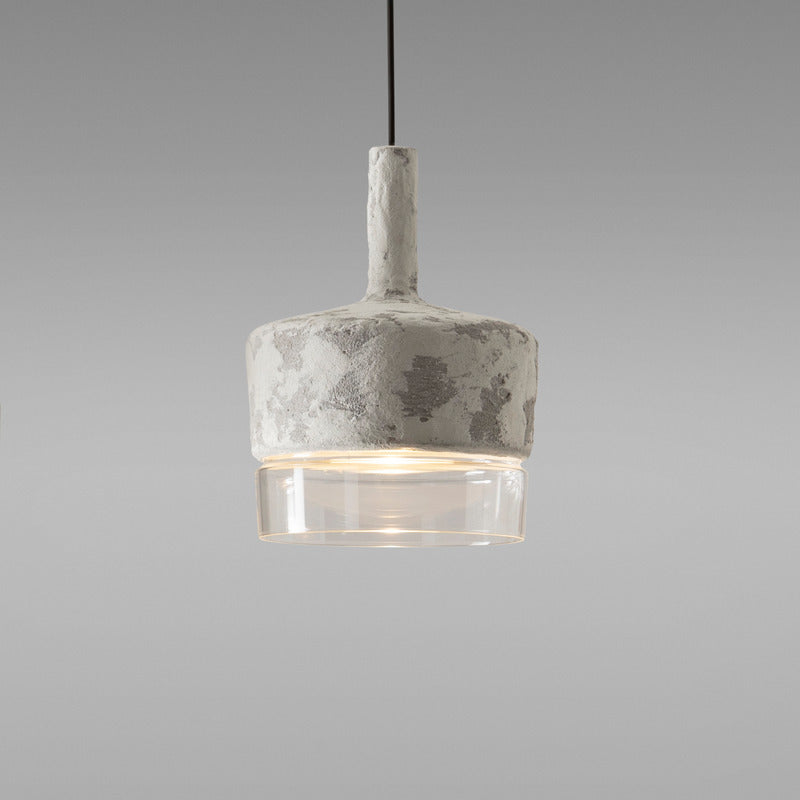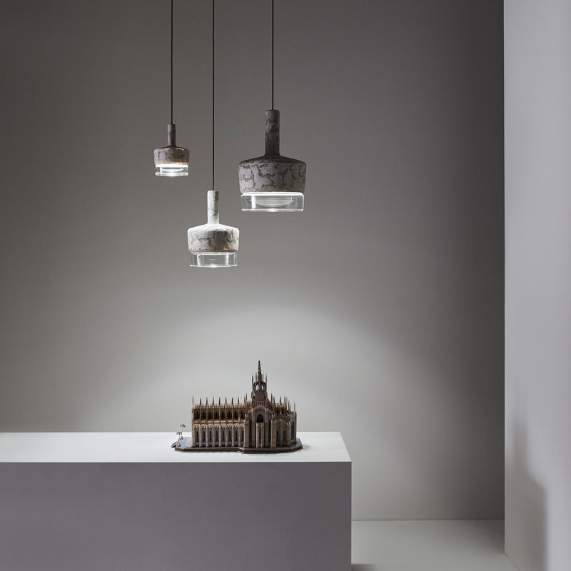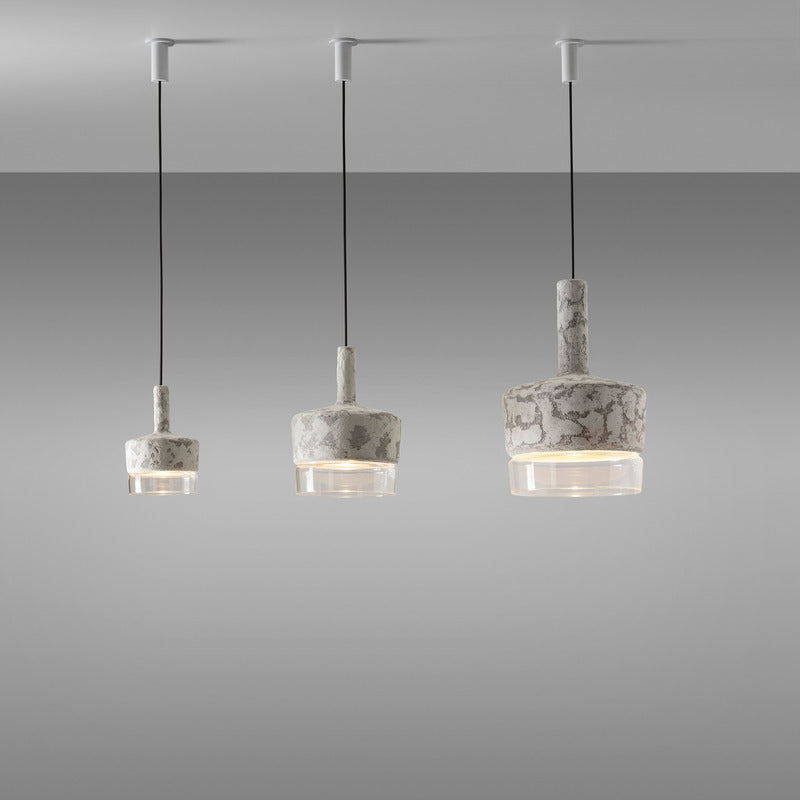 Pendant lamps with structure in cement and shade in frosted or transparent glass. Protection IP65 against water from any direction. Available in three sizes: large, medium and mini, as single element or in cluster.