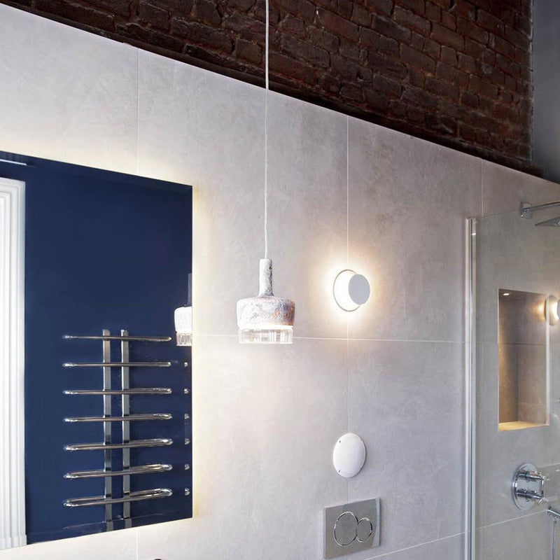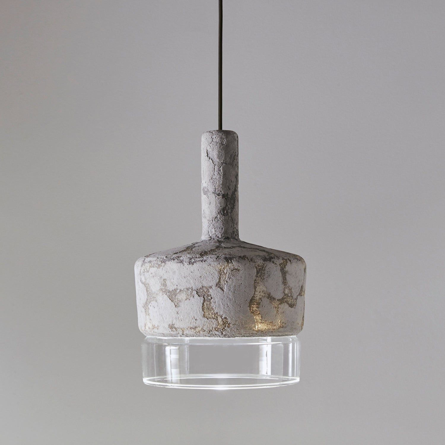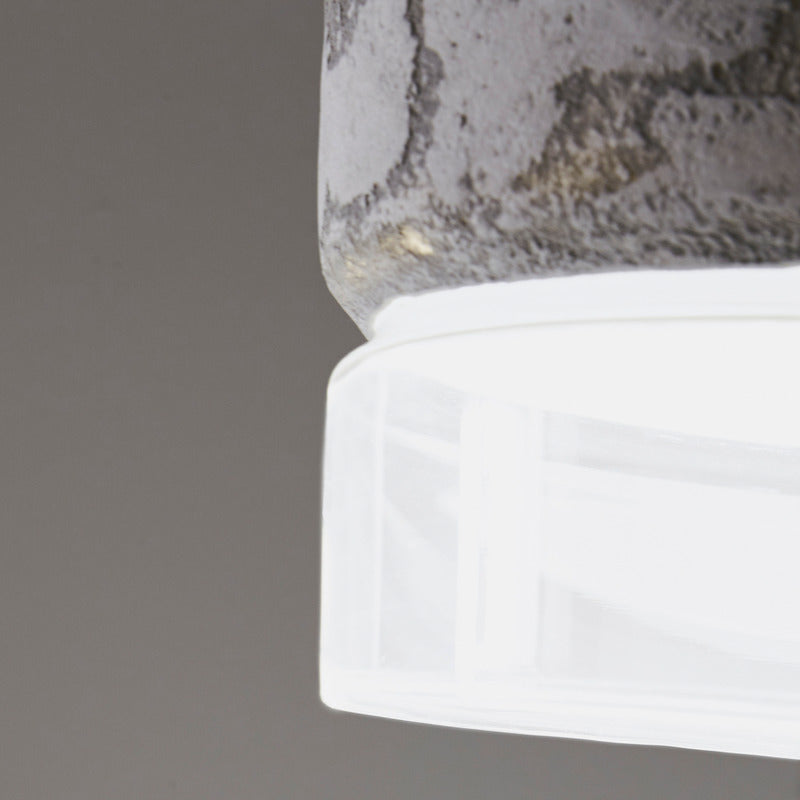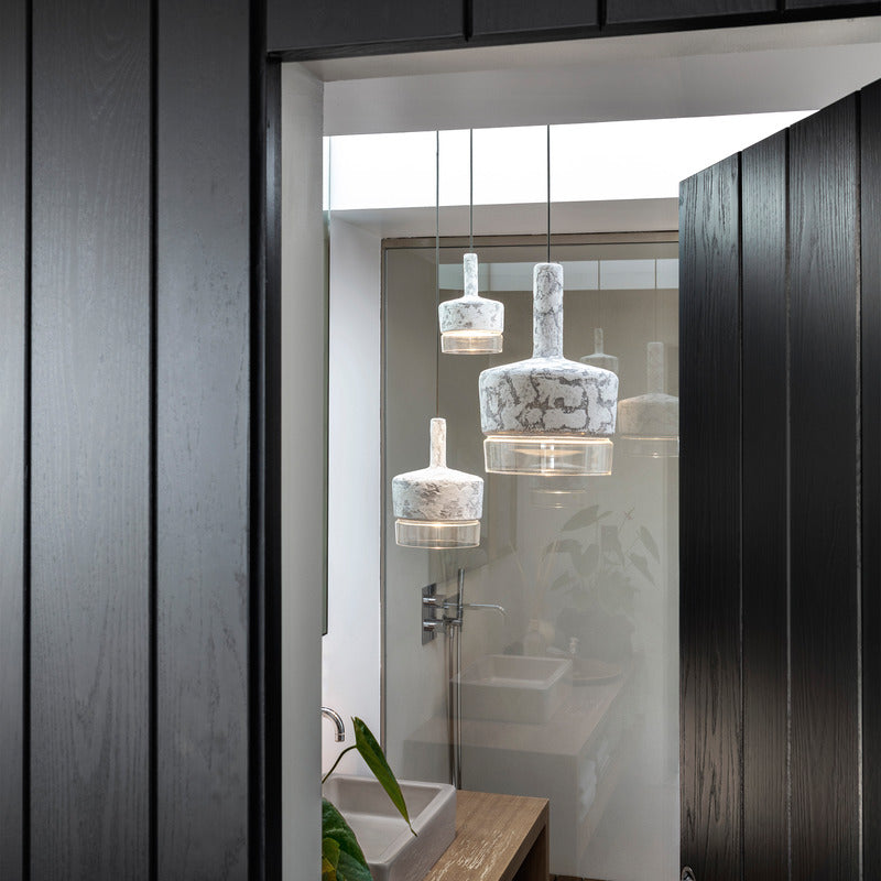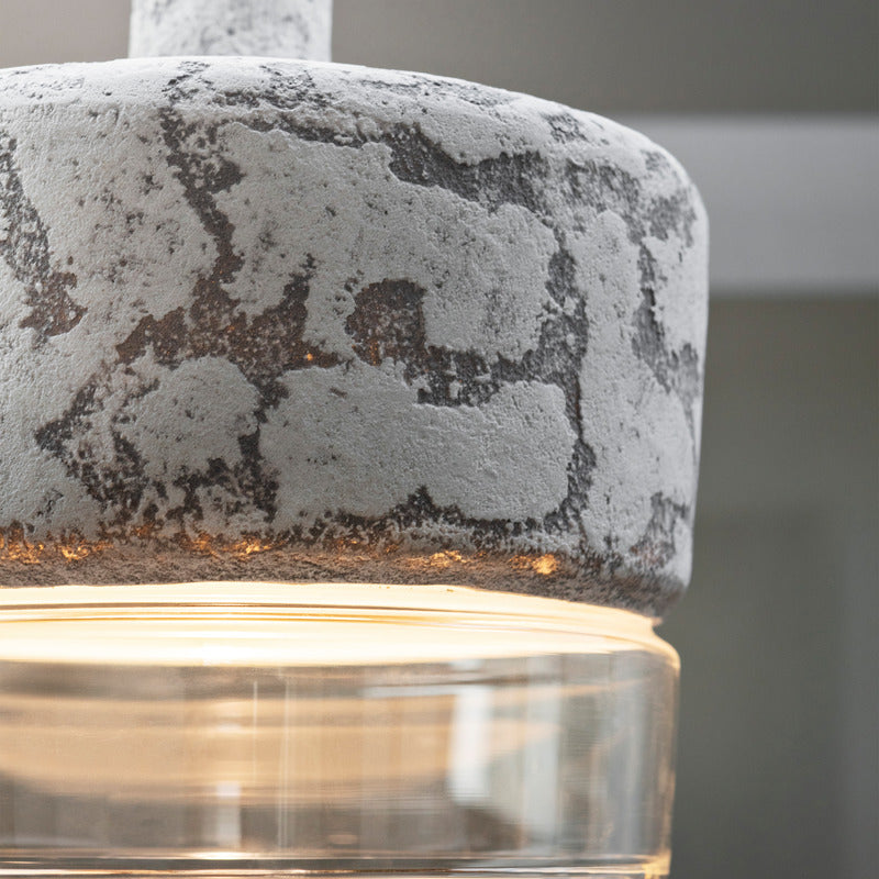 Pendant lamps with structure in cement and shade in frosted or transparent glass. Protection IP65 against water from any direction. Available in three sizes: large, medium and mini, as single element or in cluster.