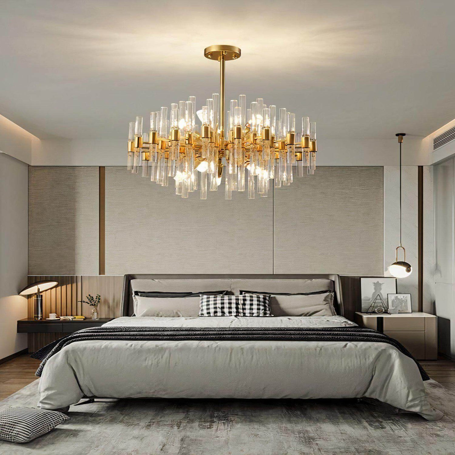 This modern luxury chandelier is an elegant statement piece for any room. The Adriana chandelier features gold and crystal elements that are fixed vertically in a proportionate and visually appealing nature. You will adore the quality of luxury this piece exudes, while adding a unique staple to your space. Coming in several sizes, you also have the option of choosing a rectangle shaped chandelier, in addition to the classic shape.