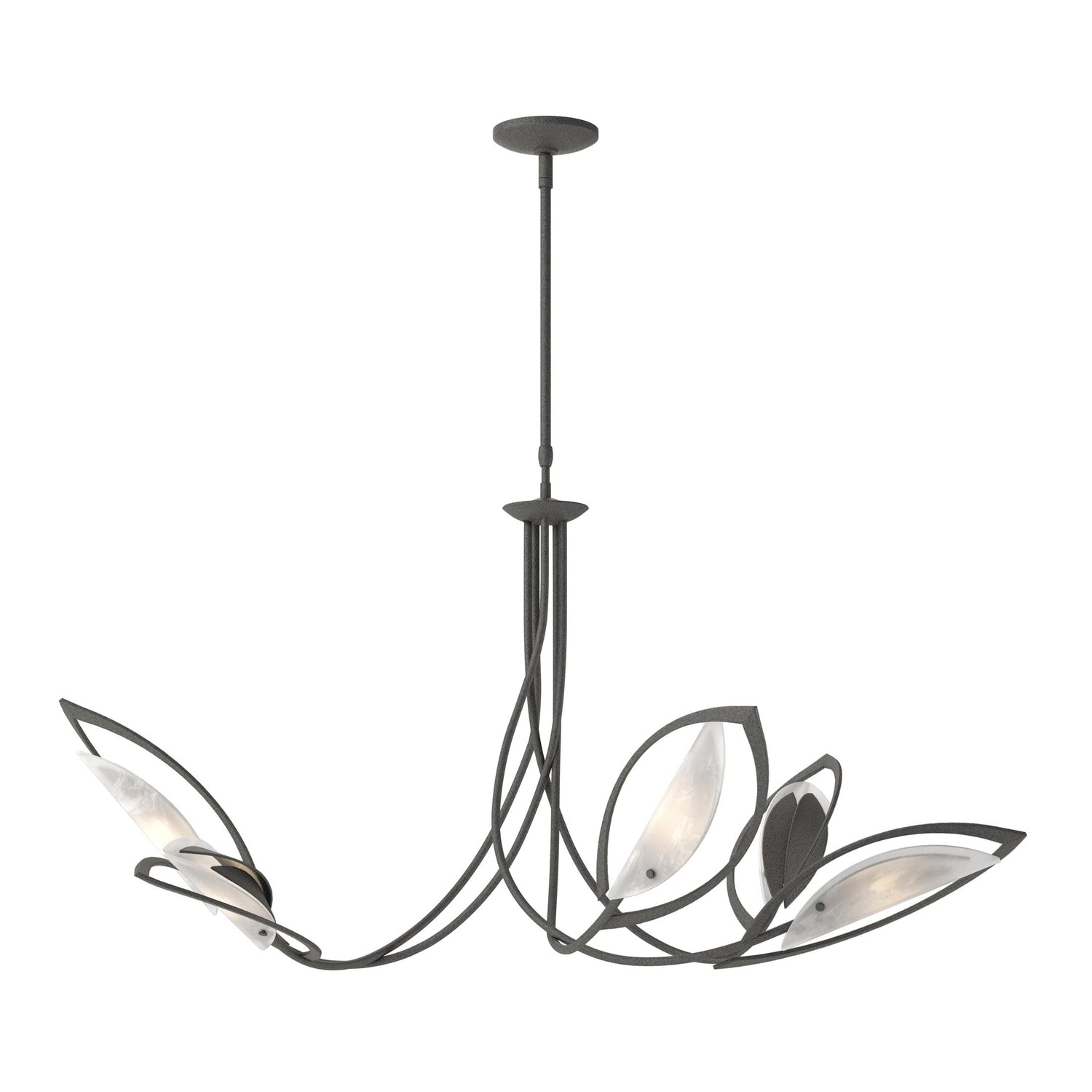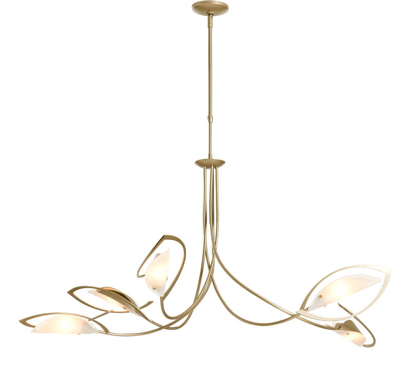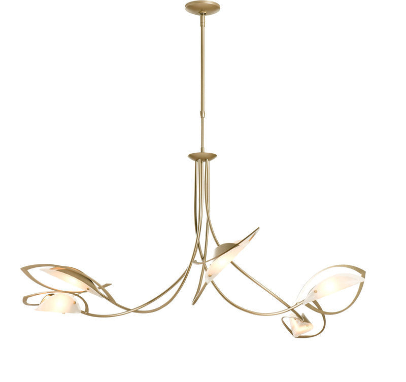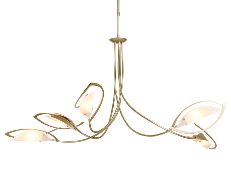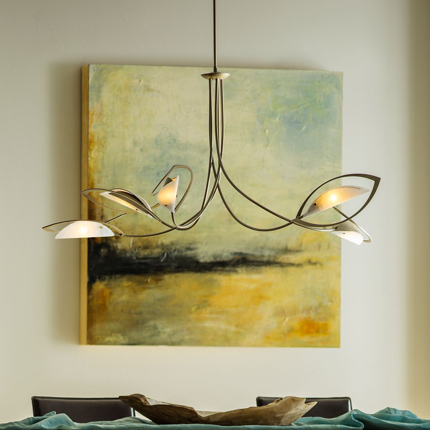 The large-scale Aerial Pendant strikes an artistic balance of materials. Leaf-like steel forms are complimented by art glass¡ªcreated through heating and draping over contoured forms. Asymmetrical and organic design lends itself to the botanical feel of the fixture.