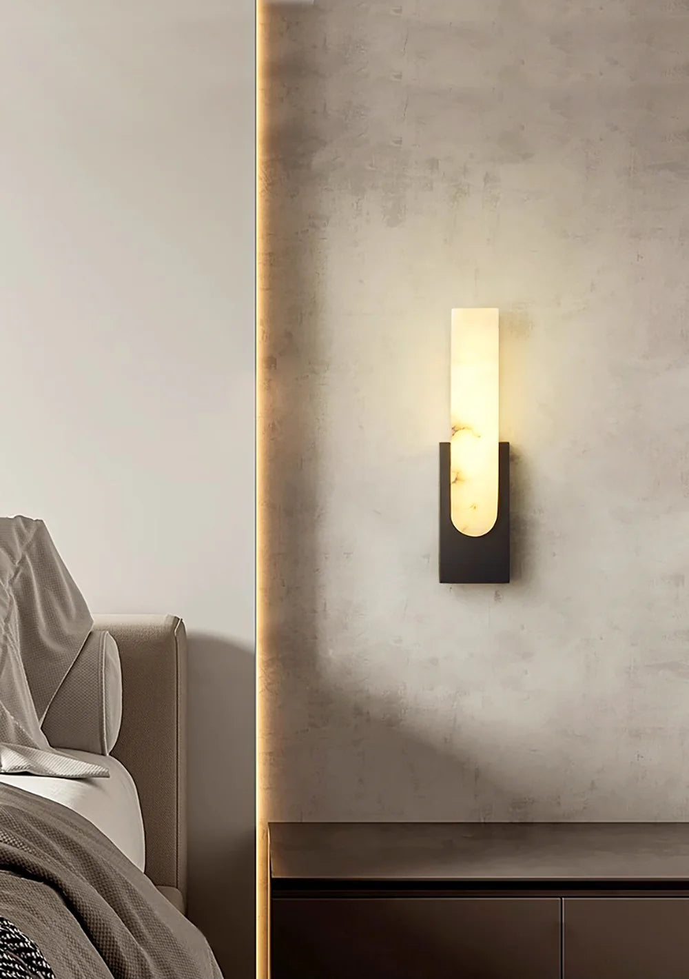 Brighten up your living space with the Alabaster Agatha Wall Sconce. This modern lamp features a unique Alabaster base that showcases the natural marble and its one-of-a-kind texture. With its metal base, this sconce offers both purity and warmth, making it a stylish and illuminating addition to any room.