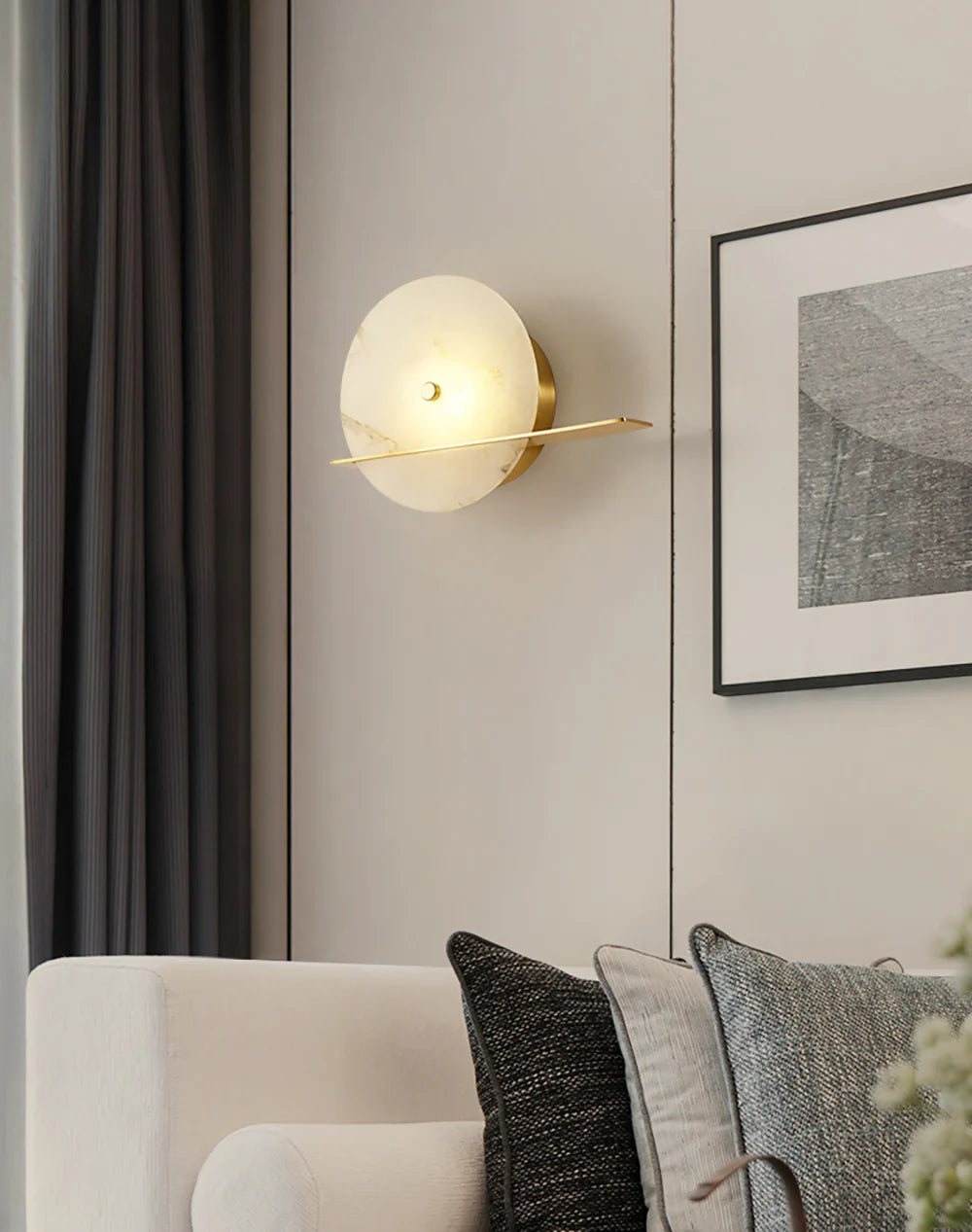 Illuminate your space with this Alabaster Modern Round Wall Sconce. With its postmodern creativity and natural marble shade combined with a brass finish, this elegant wall light adds a touch of simple, yet classy design to any room. Perfect for enhancing the modern minimalist style in any area.