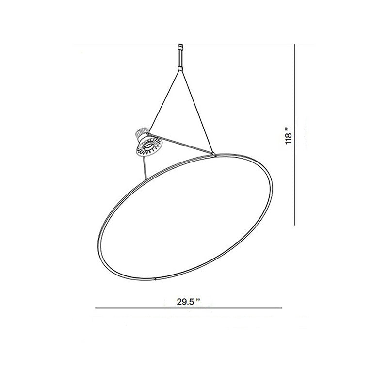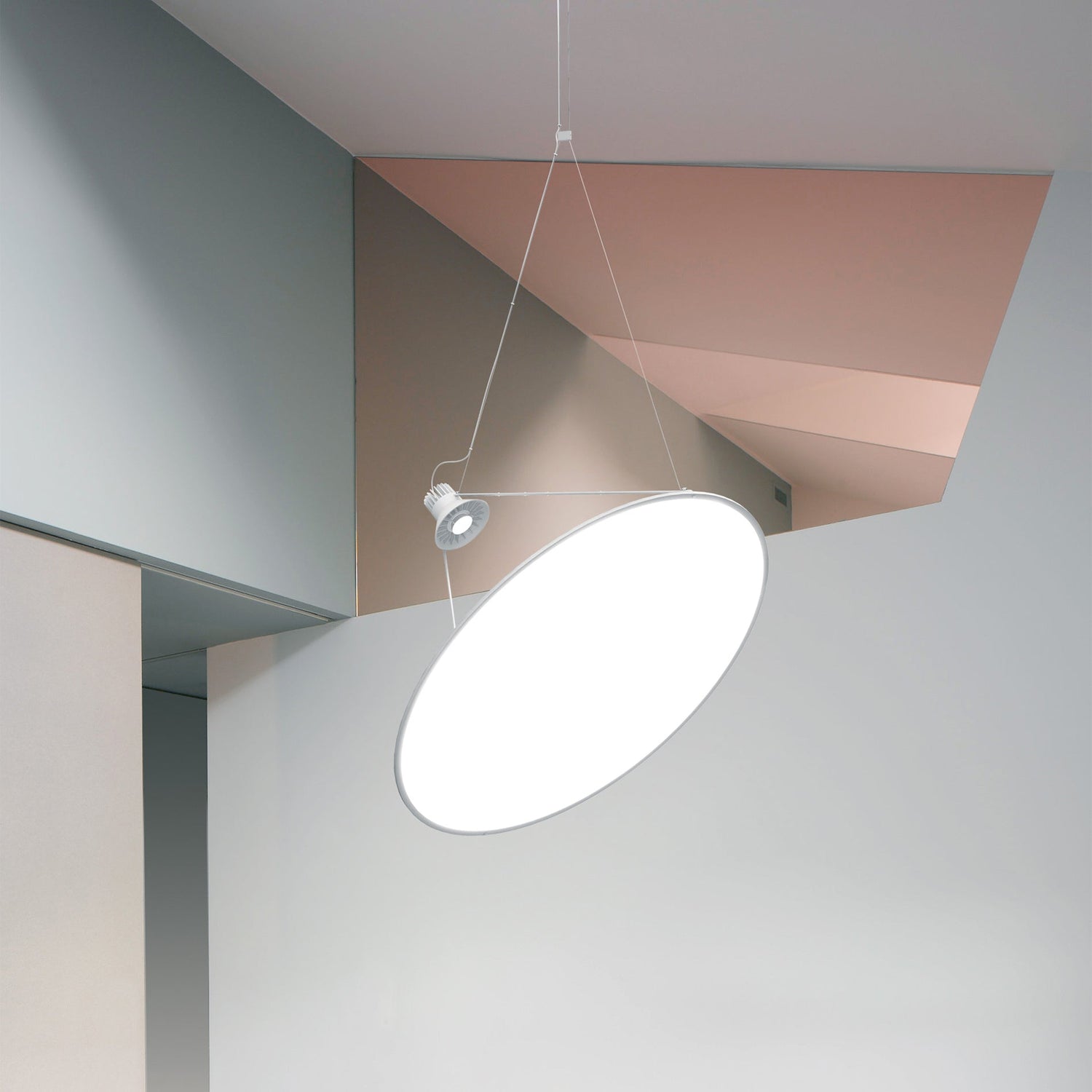 The Amisol project is about making a pendant light that occupies a large physical space with a minimal physical volume, for easy orientation in space. A translucent white fi lm or a metallized mirror membrane is stretched inside a circular aluminum profile. Like a solar sail, an incredibly powerful light source projects a beam of light onto the large, almost weightless disk, either diffusing or reflecting the light. Thin rods connect the two main elements together. By altering the length and the connecting points of the two supporting wires the rotation of the disk can be set in any angle.