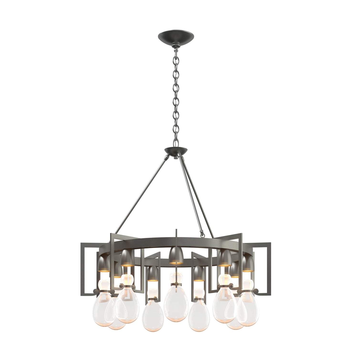 Gracefully held in place by detailed steel cuffs and a large circular frame, six hand-blown hourglass vessels capture pools of downward light. The glass elements speak to the apothecary jars of an earlier time, while the metalwork reflects clean contemporary lines. The round Apothecary Chandelier is a part of Hubbardton Forge's Apothecary Collection, blending simplicity in form with richness in materials and finish¡ªeasily adaptable to a wide range of styles.