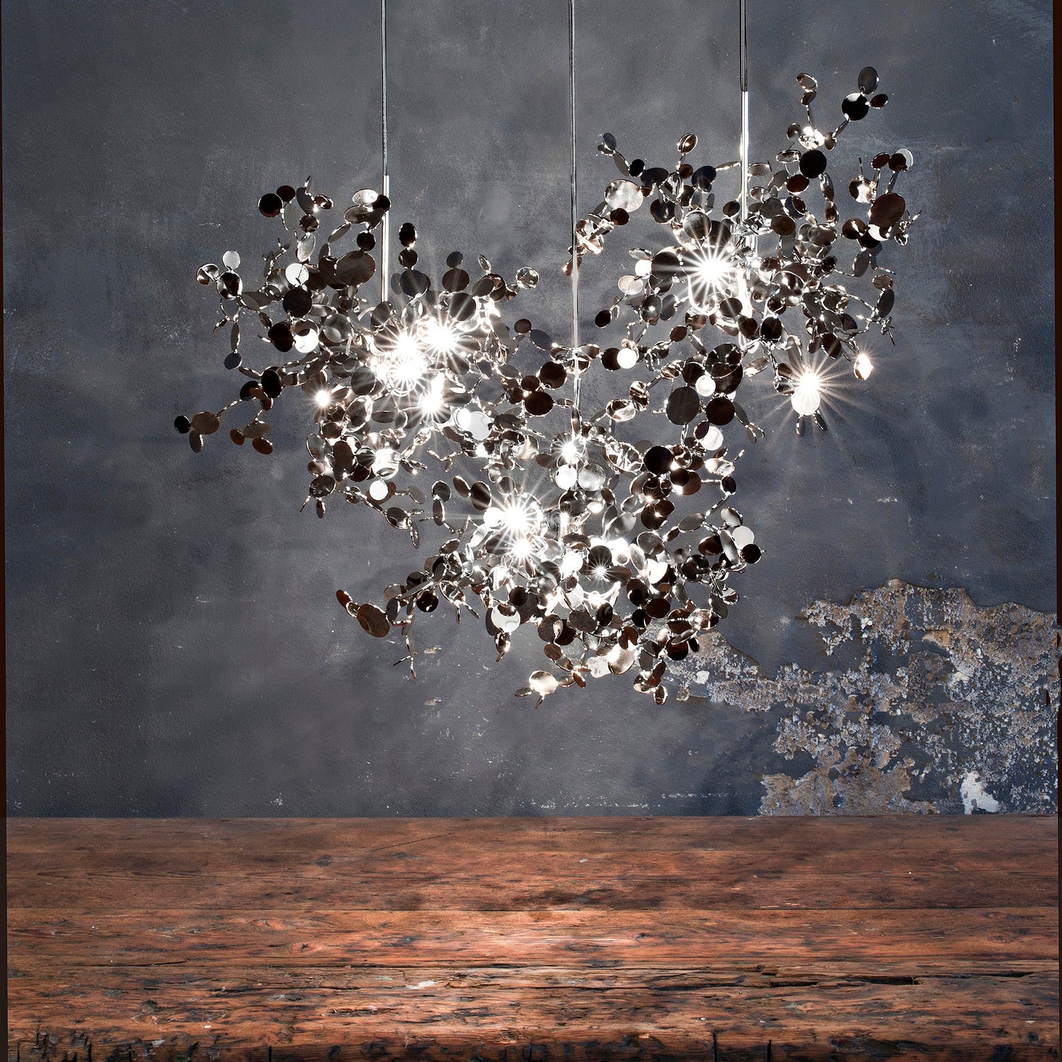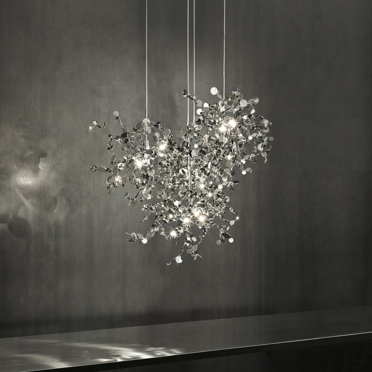With this new suspension light, designer Dodo Arslan creates a shimmering, silver cloud. argent consists of metal discs that have been meticulously shaped by hand by Terzani craftsmen into clusters. Once lit, the multiple, angled surfaces of the discs emanate a soft, shimmering, white glow.