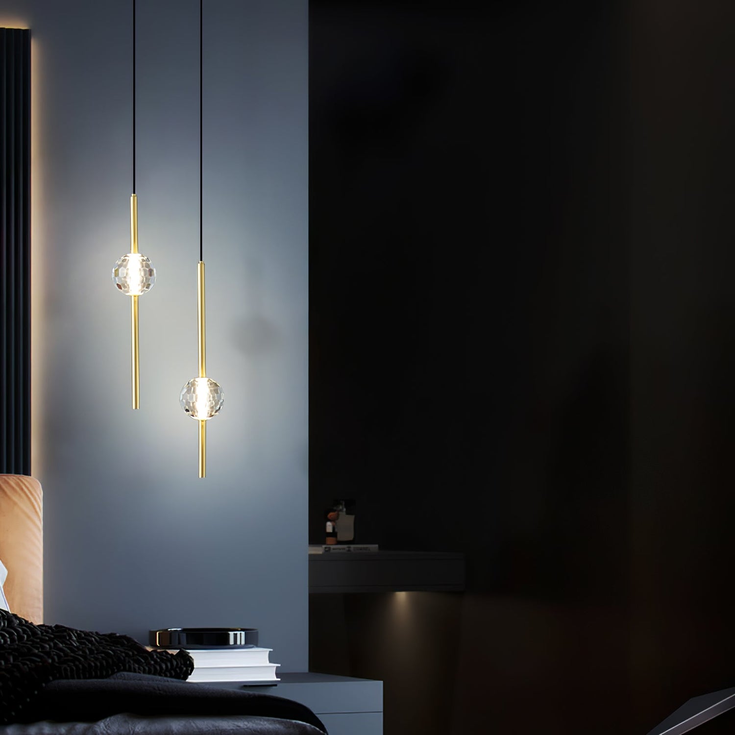 Brass and gold finish highlighting the bright LED module in this modern mini-pendant light, part of the Ari collection. Embrace modern design with the Ari collection of LED mini-pendants. this classy piece boasts a suspended gold finish rod, resembling a contemporary wind chime. The rod houses one clear-seeded glass orb to diffuse the bright light throughout your space. An integrated LED module defines the fixture, able to light up any room. A fantastic addition to any contemporary living room.