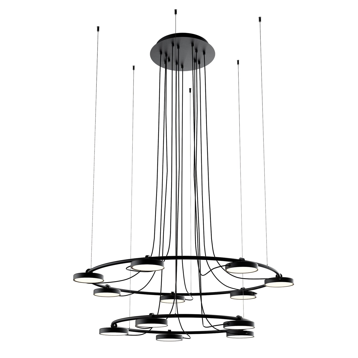 Metallic suspension lamp with circular, adjustable heads and acrylic diffusers. The heads rotate up to 106 degree. The lamp can be mounted with all heads facing up or all heads facing down. Dimmable 0-10V. Composition aro R40.1M1L luminaires are dimmable independently (two circuits) and can be mounted with heads facing up or down.