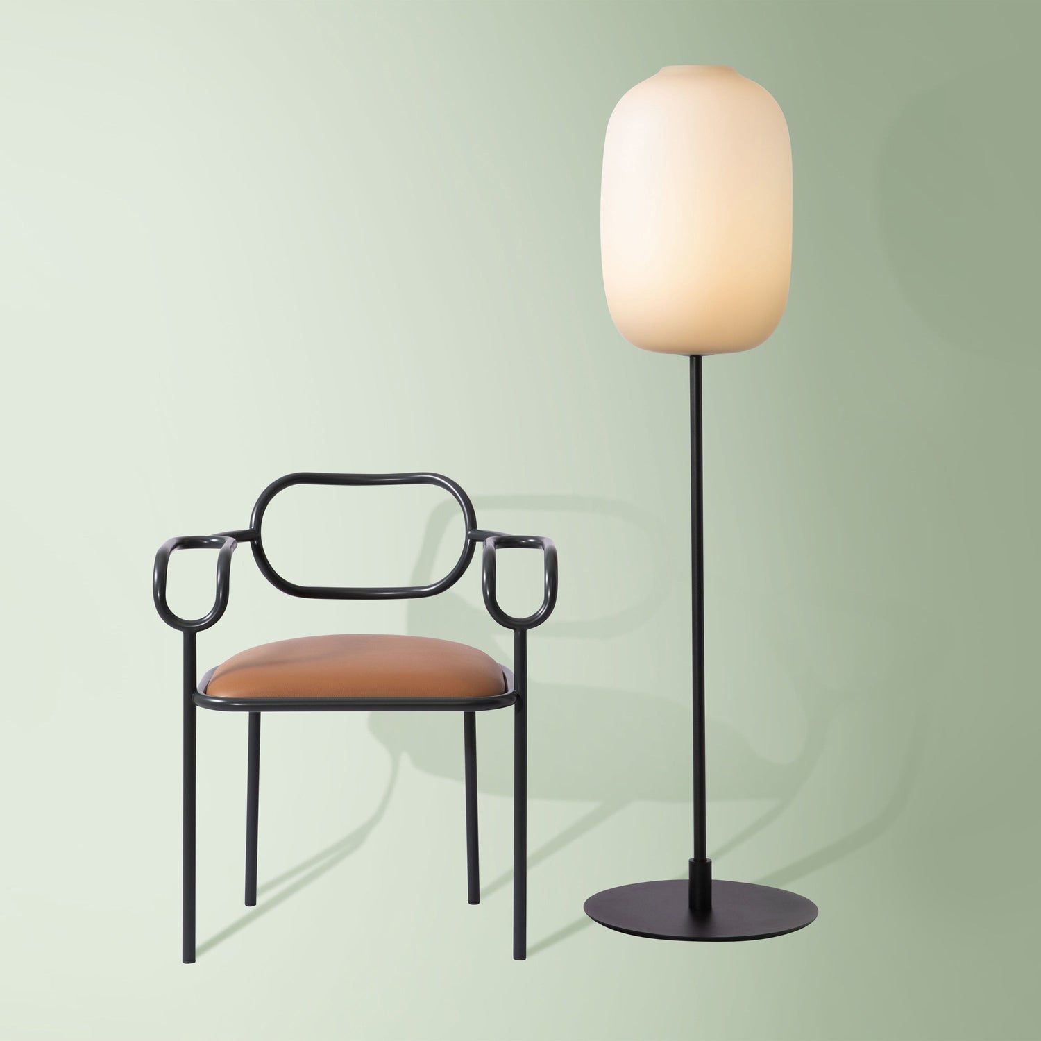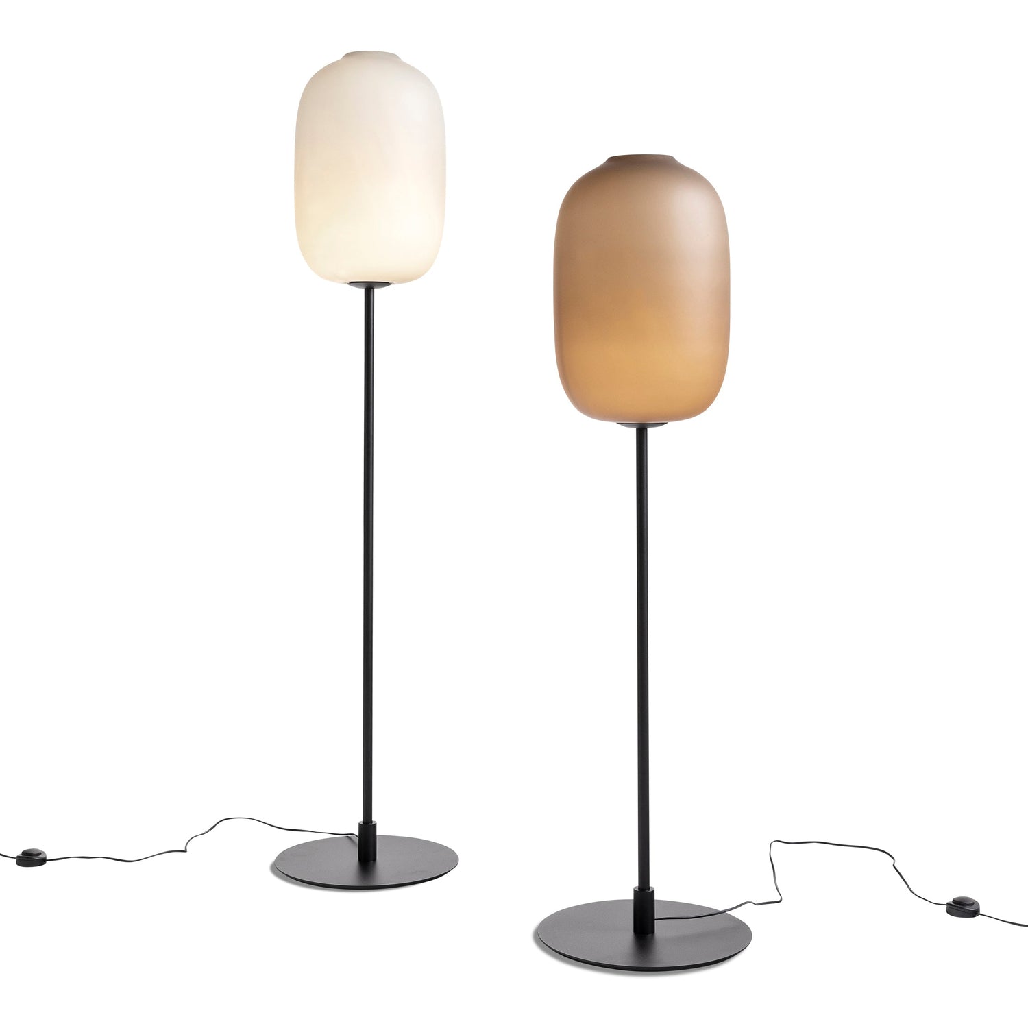 The Arya collection includes floor lamps, table lamps and hanging lamps: for all the lines, the lamp shades are made of pasta-colored glass that has been mouth-blown into a mold. The hues of the matte-finish glass include: white, smoke, air force blue, and chocolate. The metallic parts of the lamps are black, in all designs in the collection.
