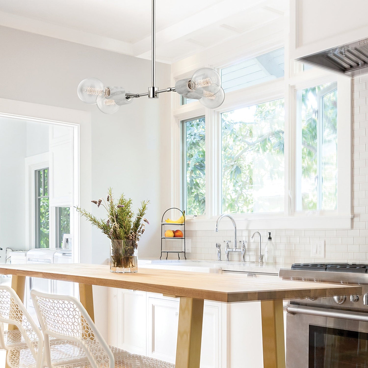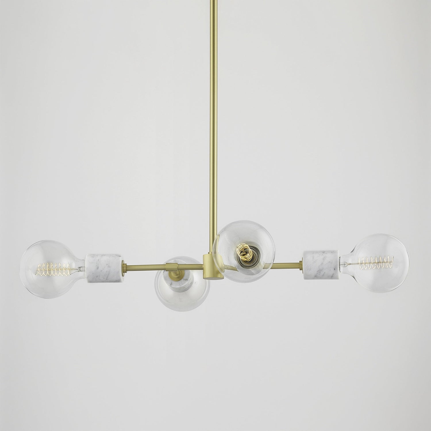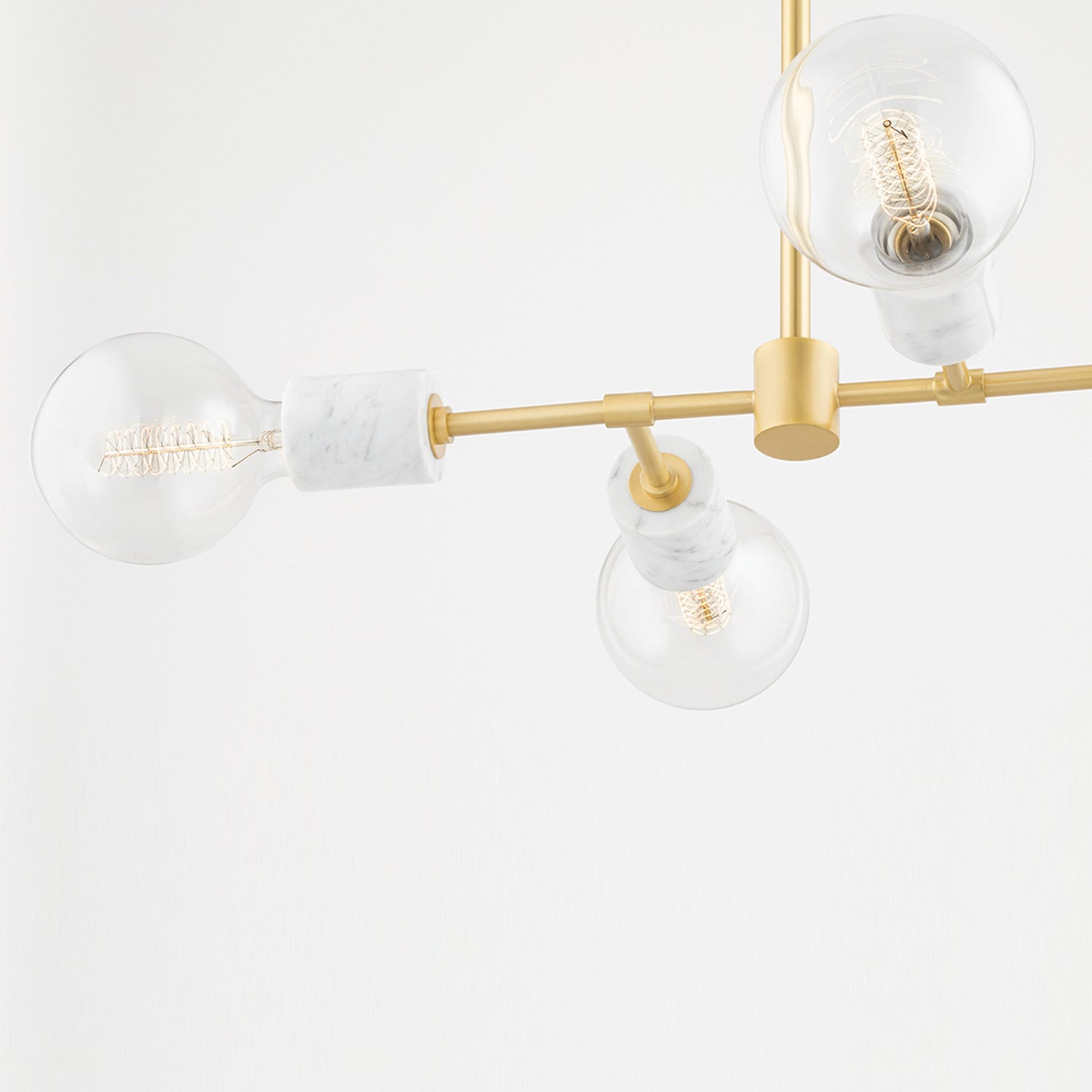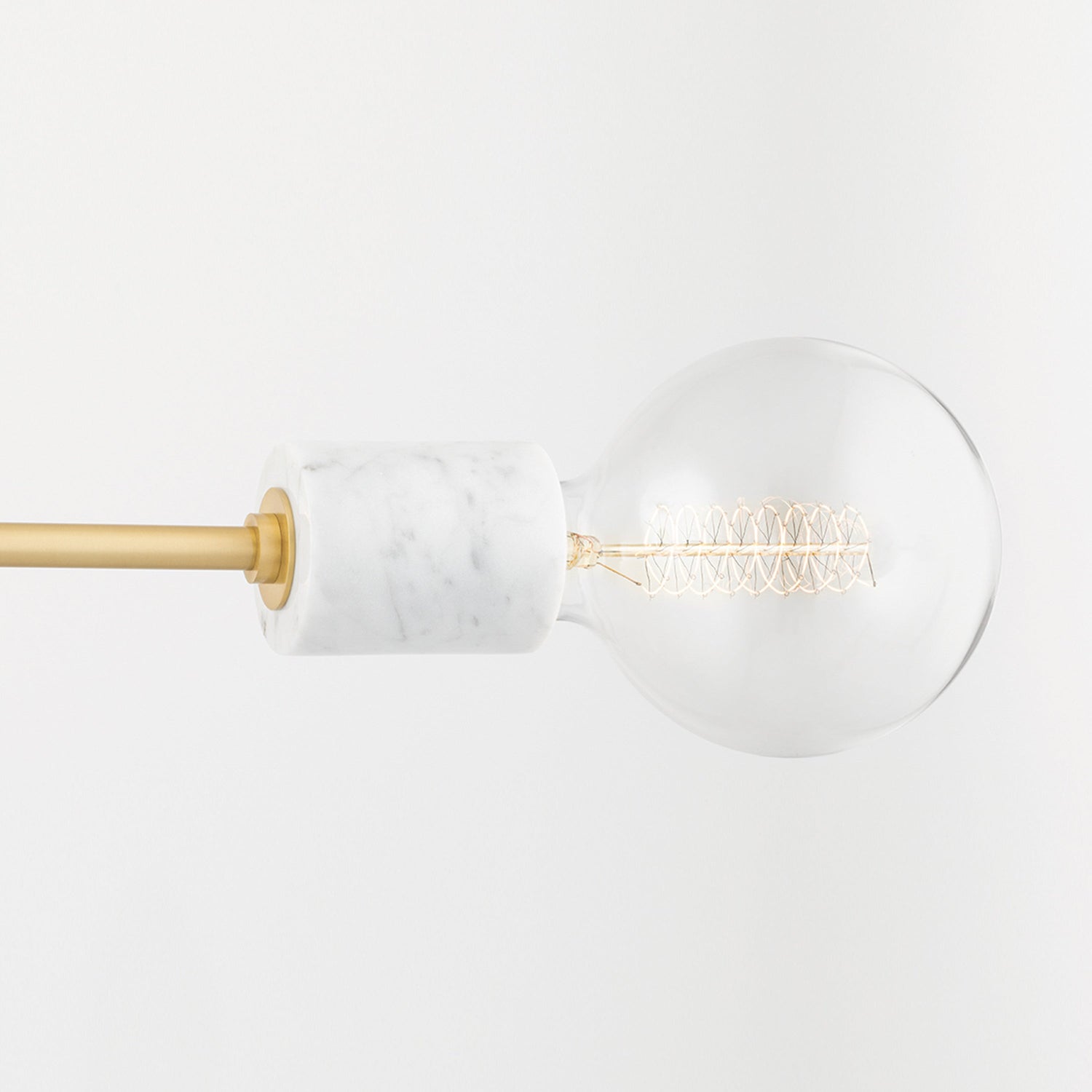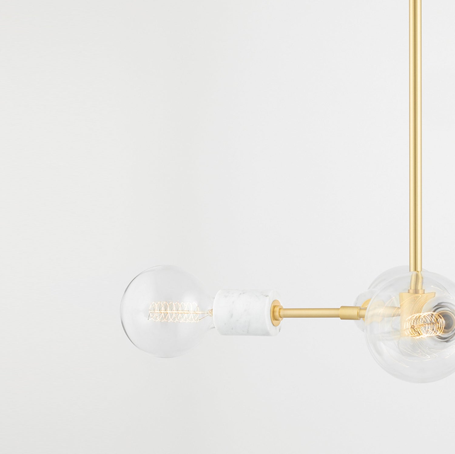 Asime mixes metal with marble for a look that is as simple as it is chic. Polished metal arms and accents pair with marble bulb bases holding incandescent globe bulbs. This fixture gives off a clear, bright glow that is sure to add shine and style to any space.
