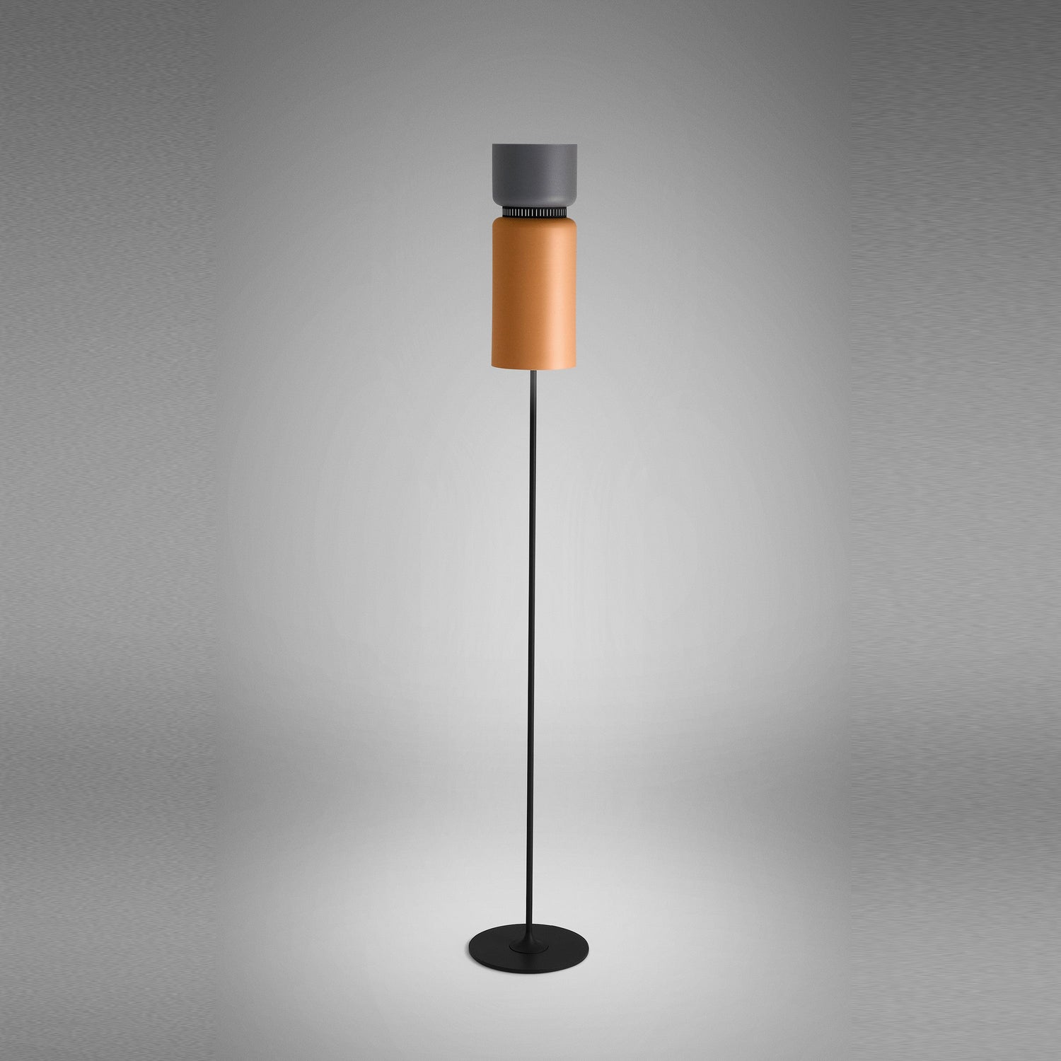 Floor lamp with a dual aluminum shade and indirect (F17) and direct (F40) light. Available in several mattee lacquer finishes, providing multiple variations: grey, snow, lemon, mango, clear turquoise, and aqua, and now featuring new finishes like merlot, rose, sea, river and limestone.