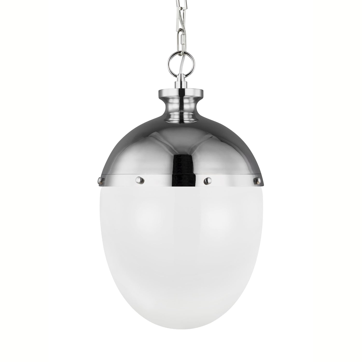 The Thomas O'Brien Aubry Pendant features hand-blown, white milk glass in a new oval shape with banded detail and knurled screws on its metal upper shade. Its great scale, balanced metal-to-glass ratio and square chain detail help Arlett make a statement in any room. Aubry is available in burnished brass, polished nickel or midnight black with burnished brass accent finishes.