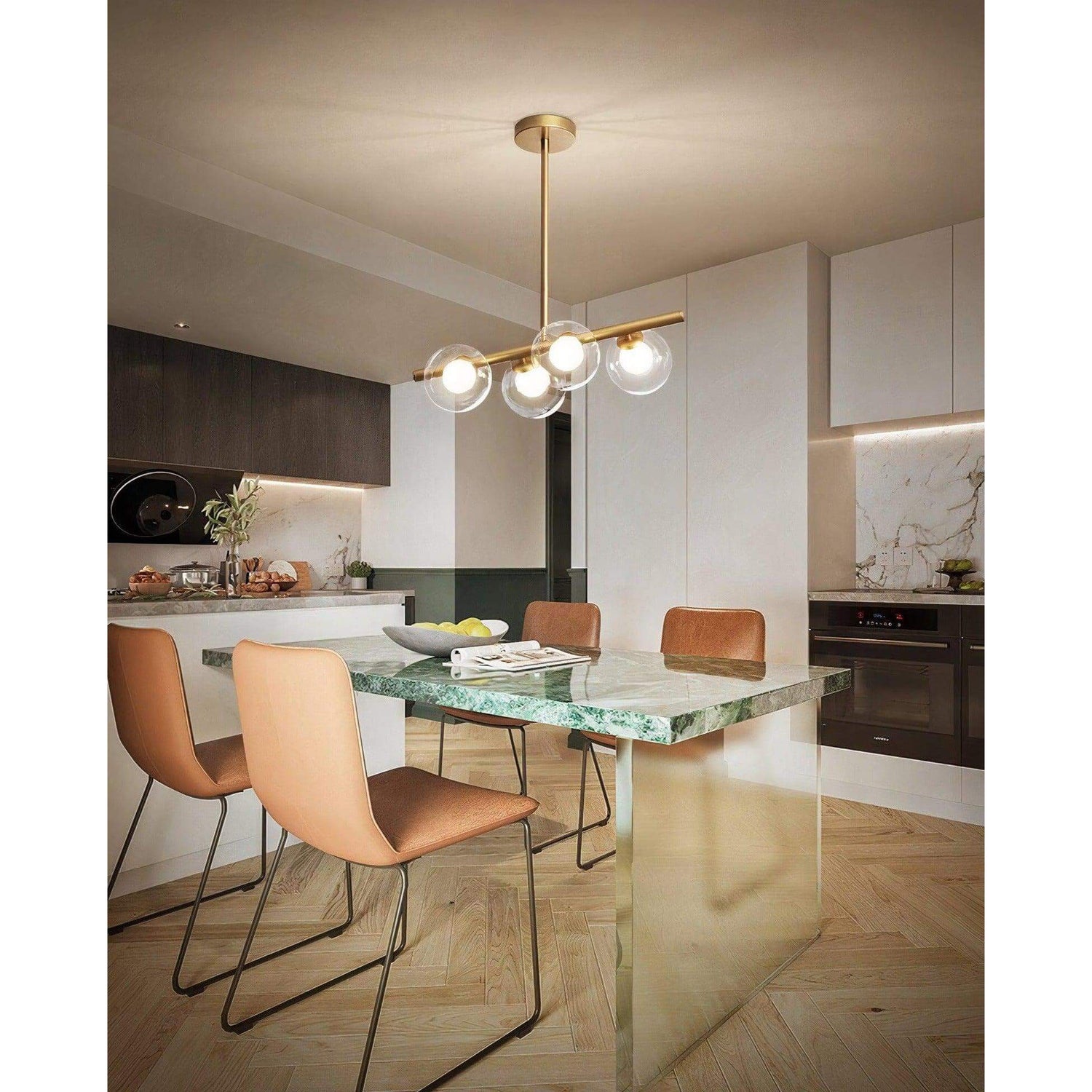 The Audree chandelier, a Siena exclusive, features an iron bar that holds spherical, transparent bulb domes. This modern fixture is certain to bring a contemporary element to any space, providing bright light and a bold but simplistic approach to lighting decor. Available in black or gold, and with different lighting and size options.