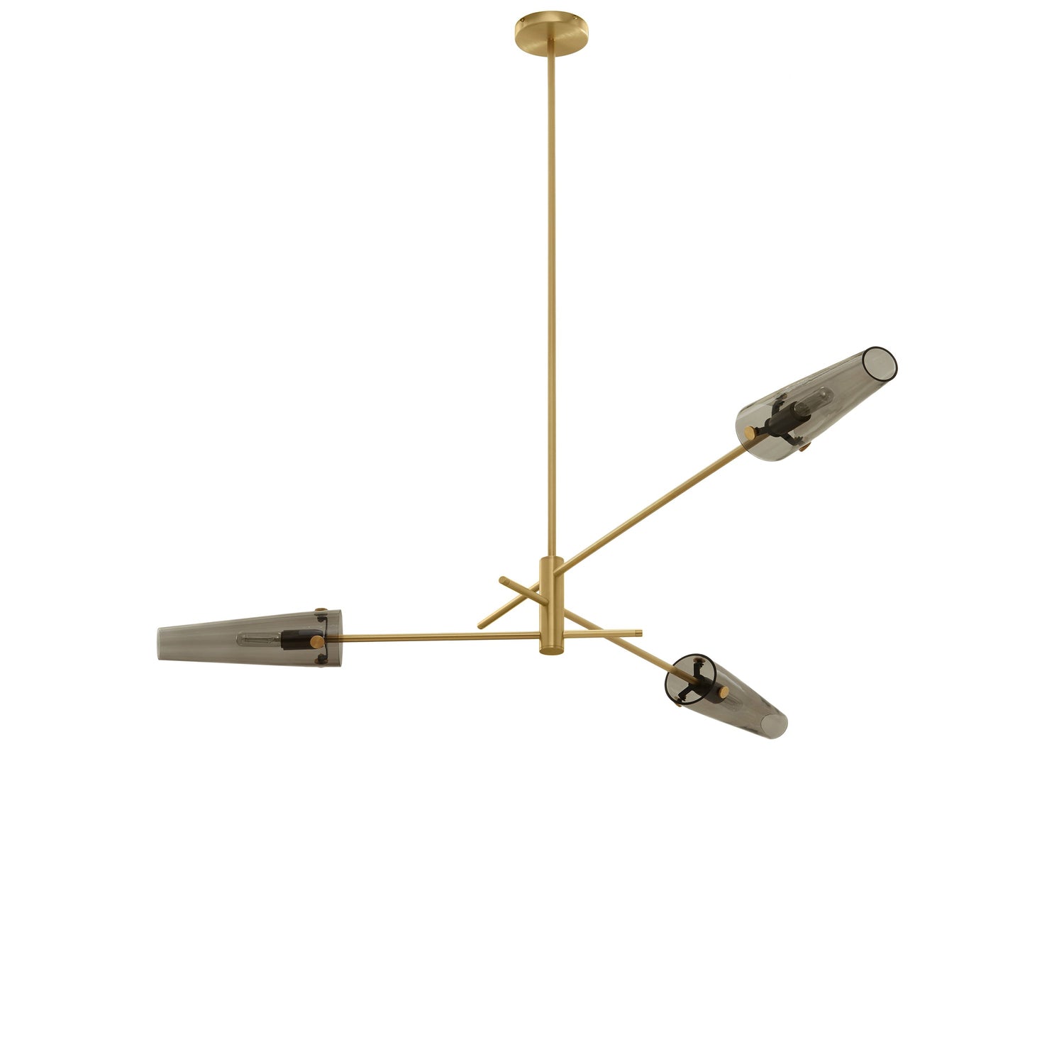 A modern decorative pendant, inspired by antique street lamps that blends linear form with decorative details to deliver a unique combination that is a great centerpiece to an interior. Finished in satin brass or bronze with conical smoked glass shades.