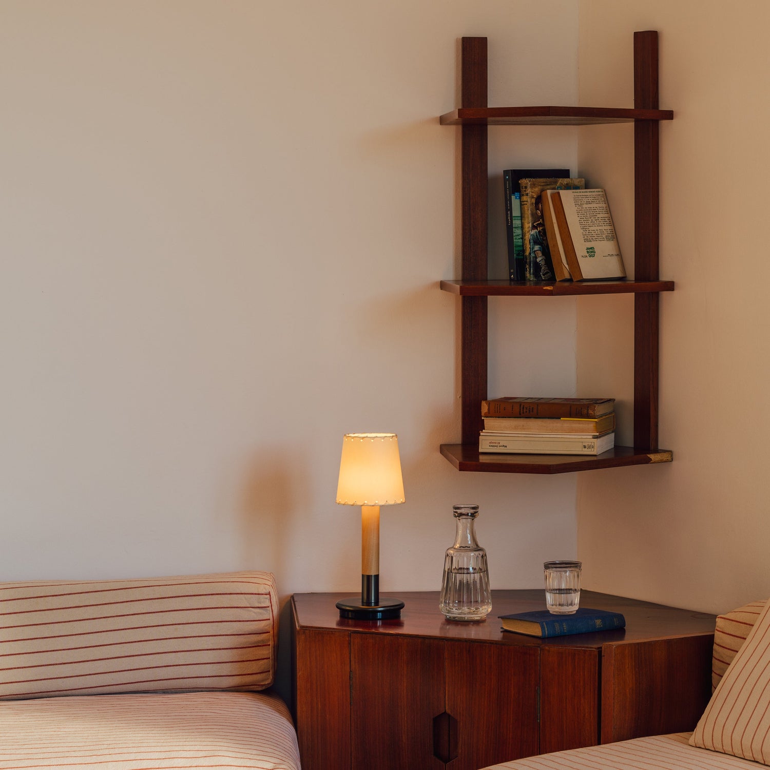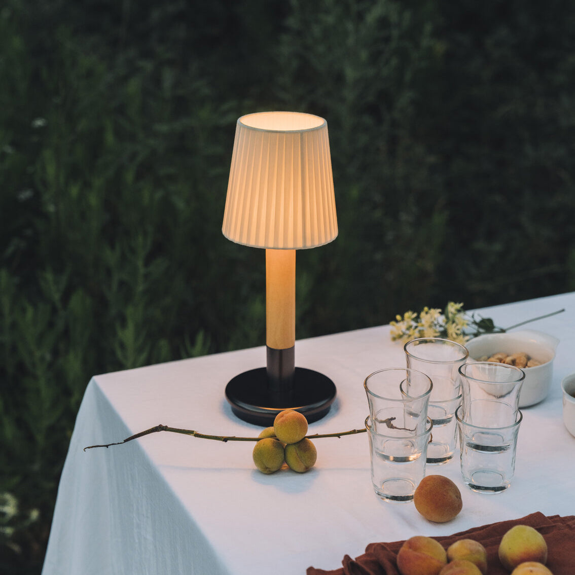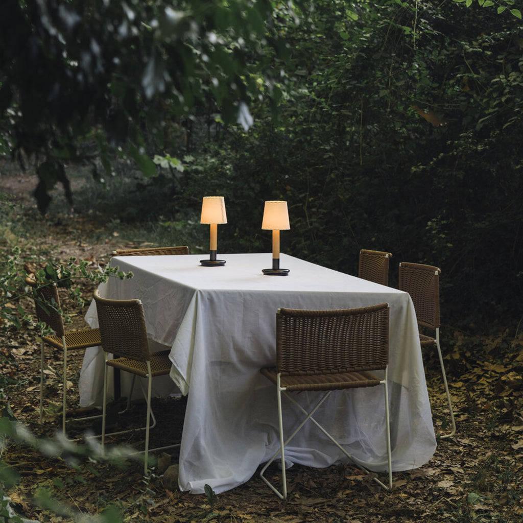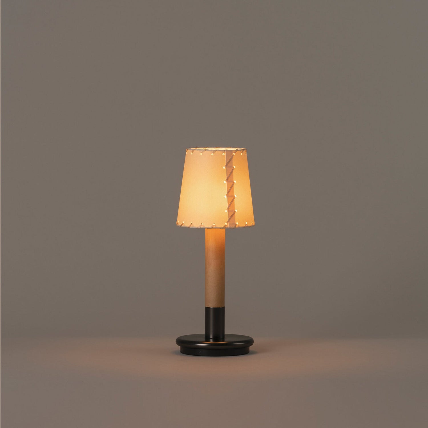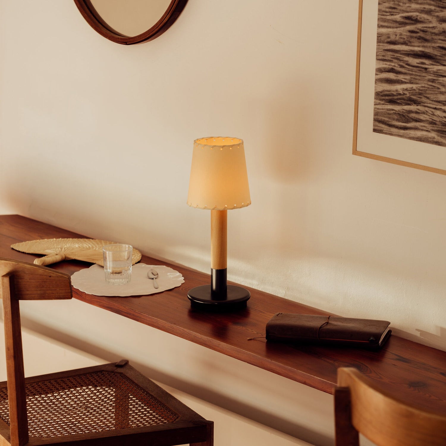 The Basica family has a new member, Basica Minima Bateria. An adaptation that proves itself portable, light, and practical. Like its original version, the cylindrical structure is made of birch wood and has two options of shade: pleated natural parchment and ribbon stitched, both hand-assembled. The portability of Basica Minima Bateria is given in its circular base, finished in graphite, which by slightly pressing on it turns the lamps on and off.