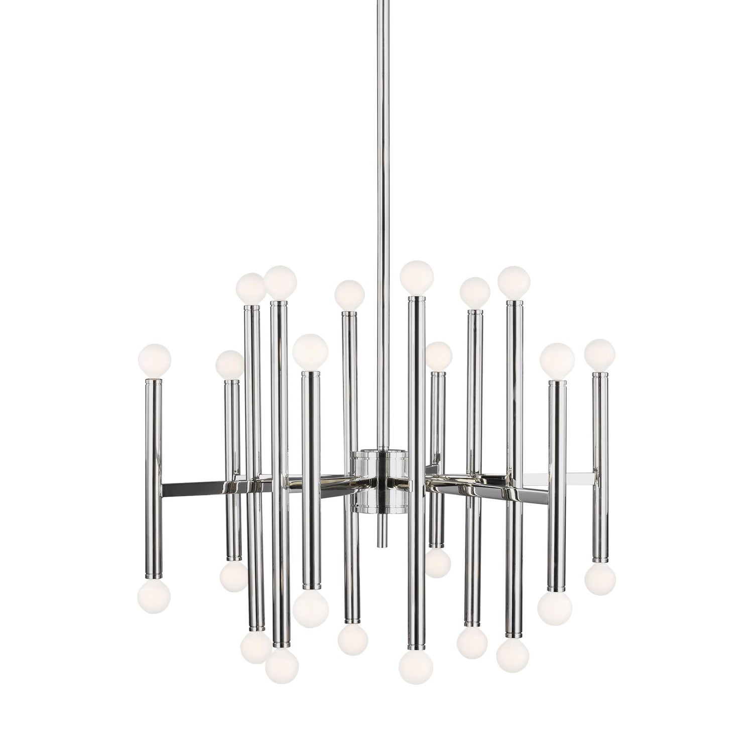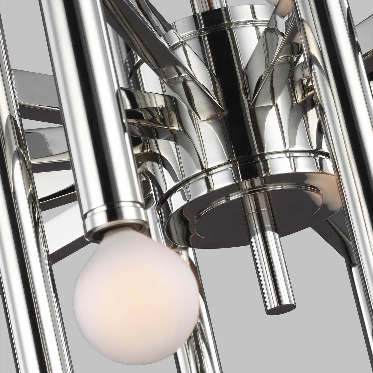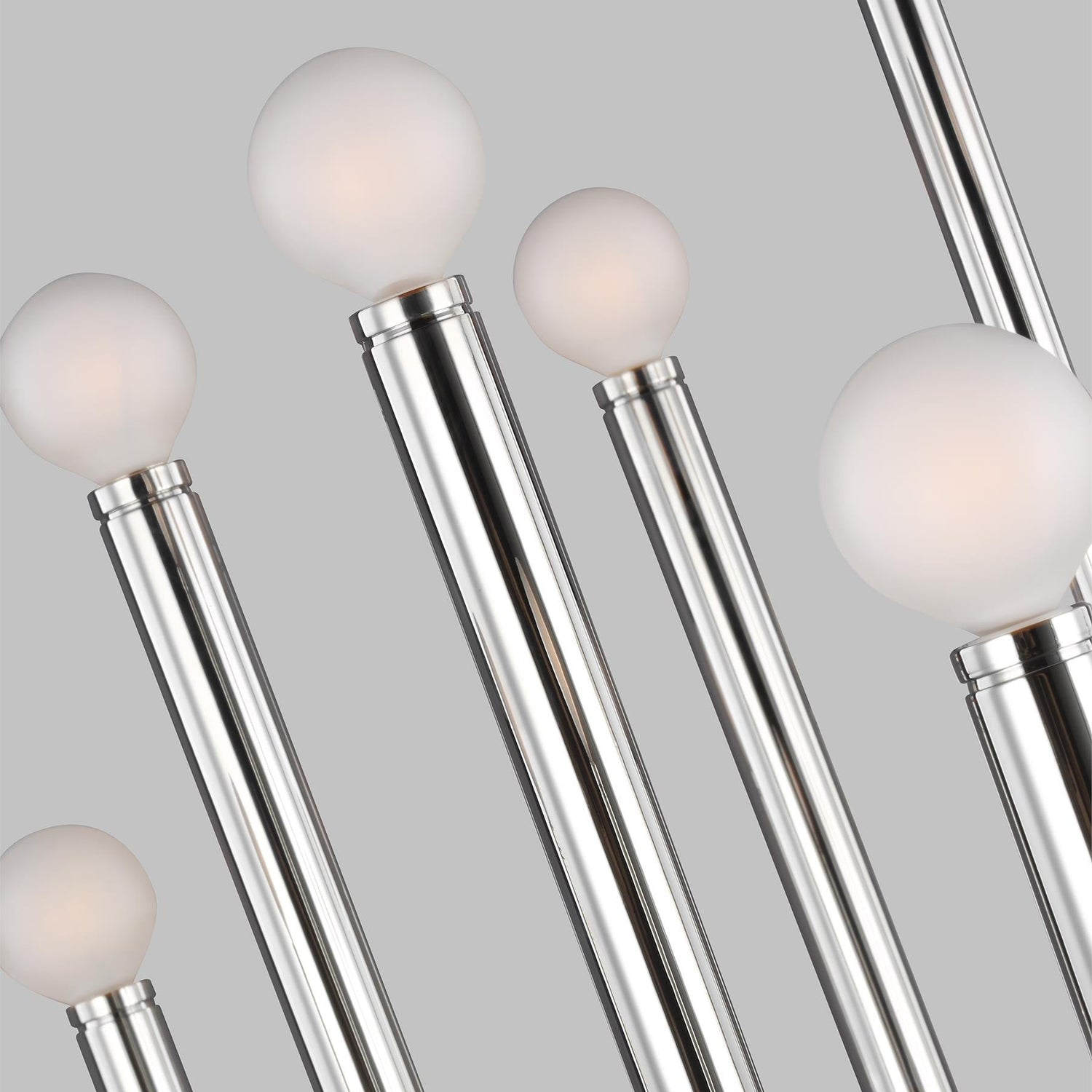 The Thomas O'Brien Beckham Modern Chandelier in burnished brass or polished nickel offers a chic, Art Deco-inspired look featuring an array of tall cylindrical arms of varying height, extending out from a central point and bearing lights on both ends. Available in two sizes finished in Burnished Brass or Polished Nickel. Includes one 6 inch and four 12 inch down rods.