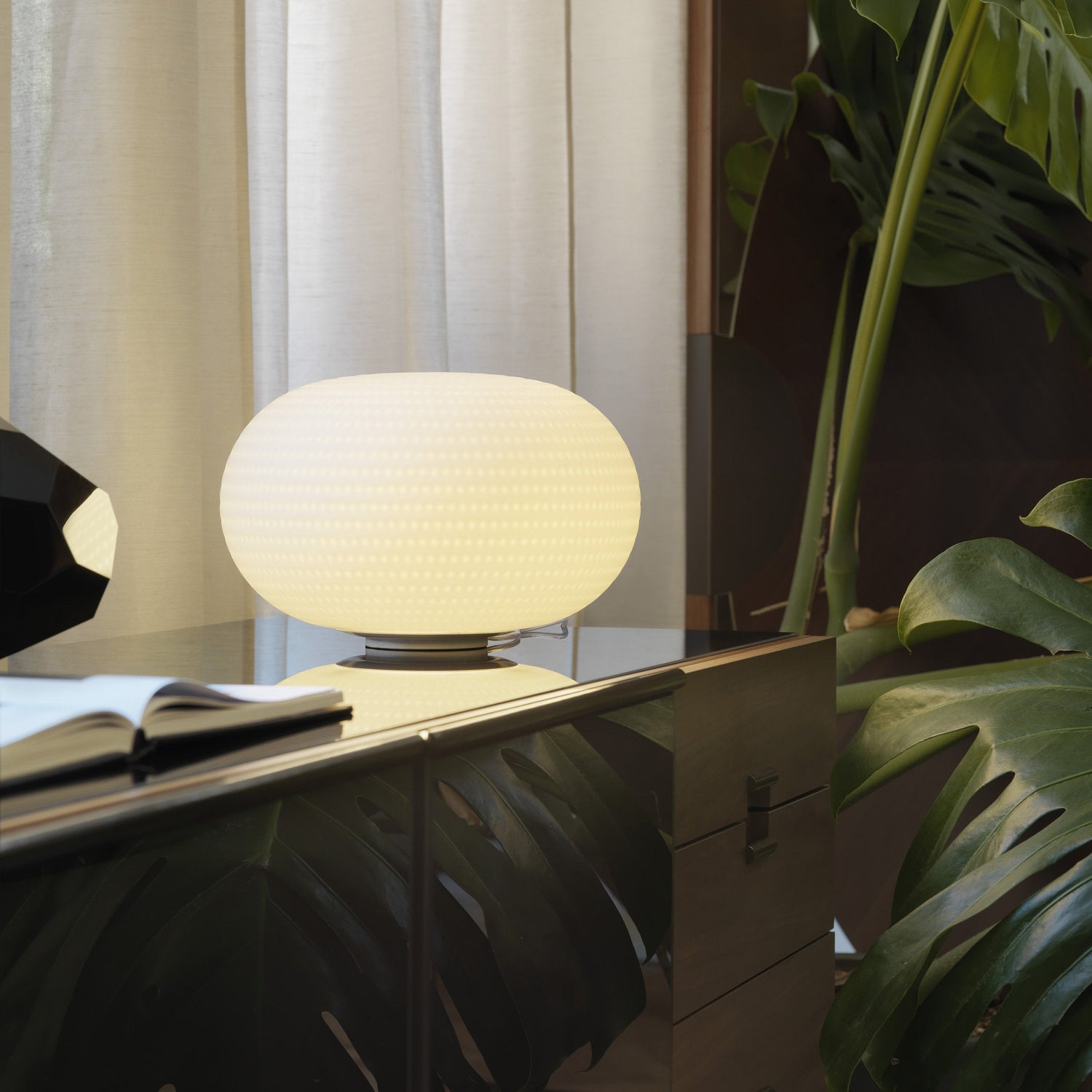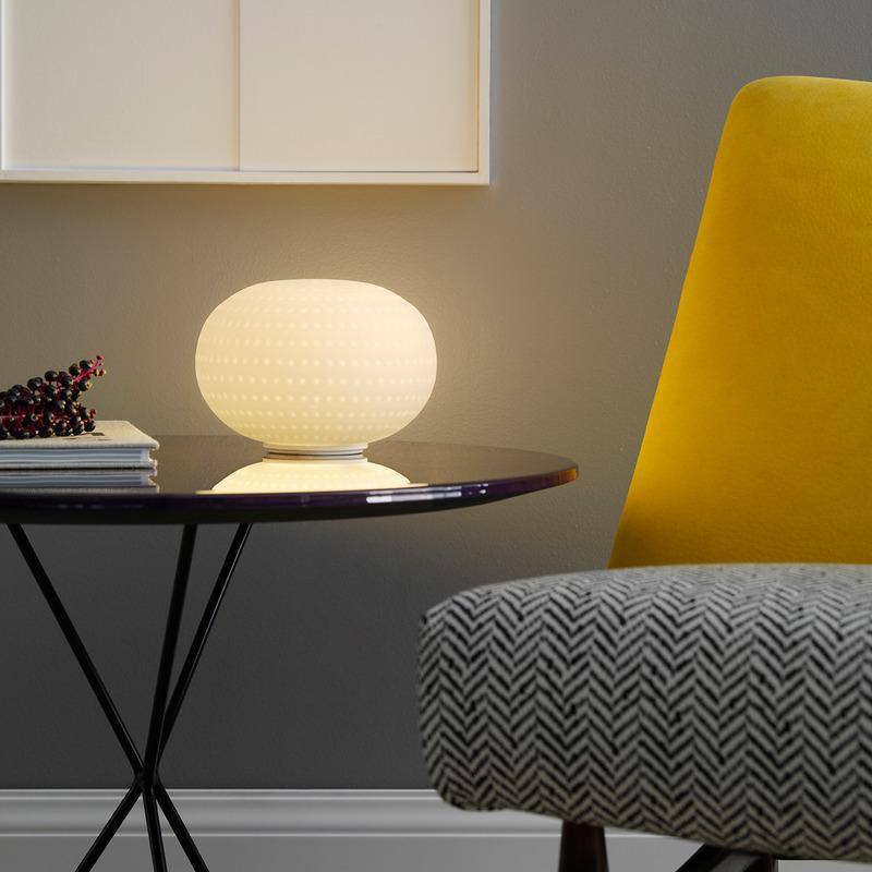 Bianca is a family of lamps with diffuser in blown glass. Its beautifully balanced shape is enriched and made unique by an orderly series of delicate, light grooves that, on the white volume of the glass, look like tiny prints on fresh snow.