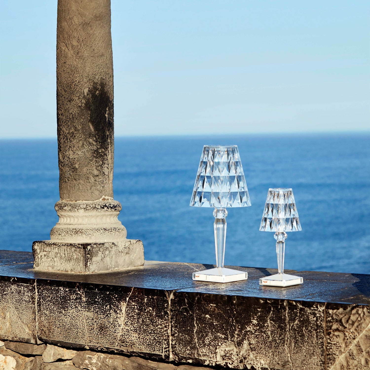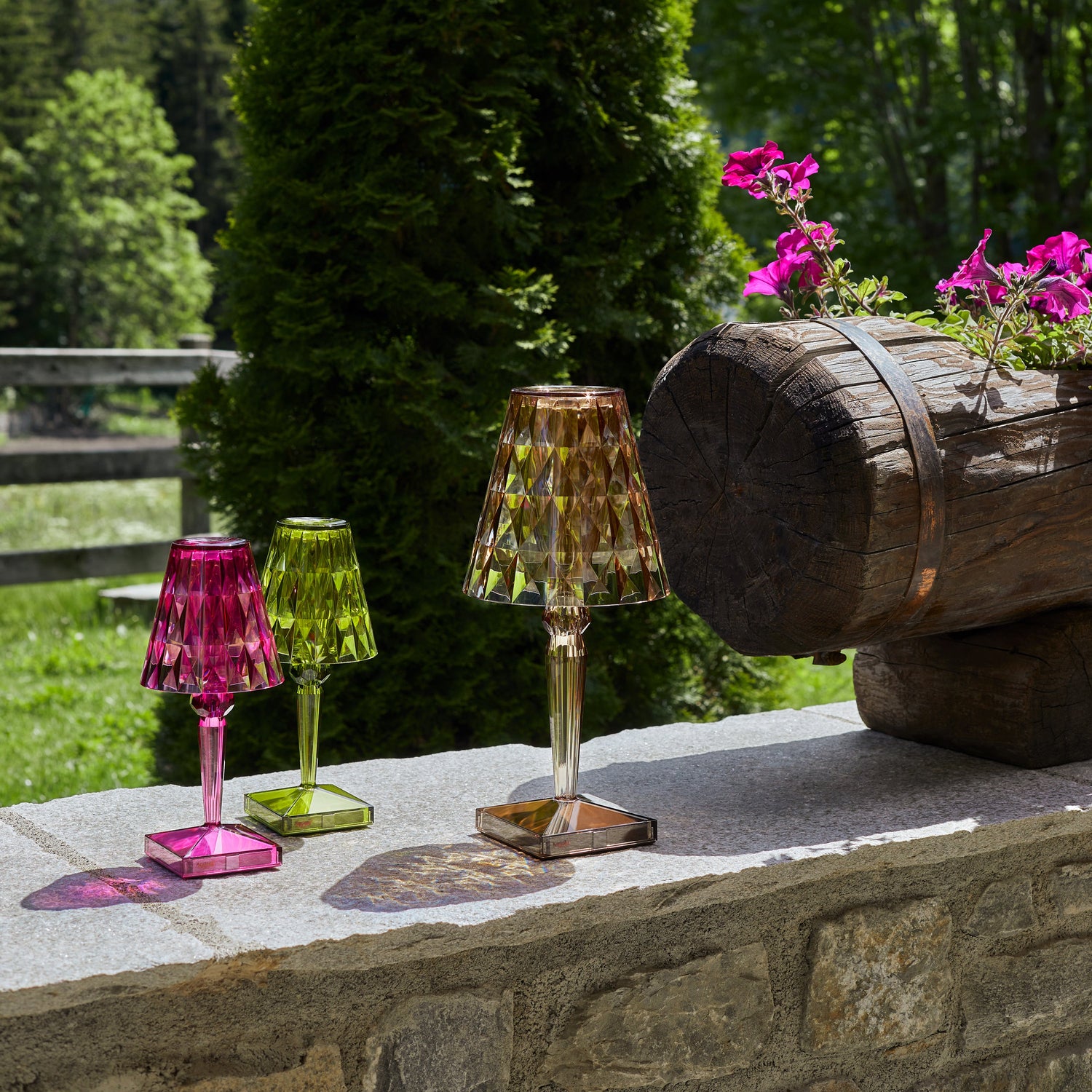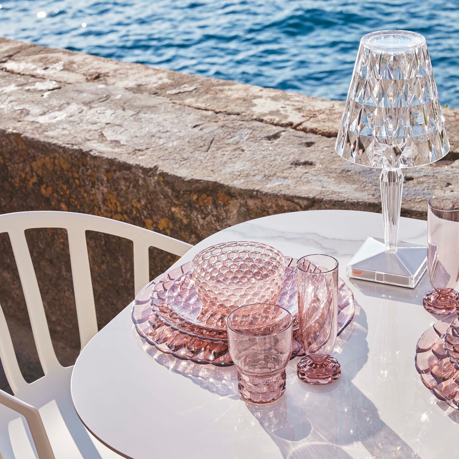 Chic, flirty, and a little bit quirky, the Big Battery Table Lamp from Kartell brings jewel-like beauty to personal and commercial spaces alike. A maxi version of the classic lamp, this luminary is 100% rechargeable thanks to a simple electrical plug which offers up to 8 hours of power, making this design portable perfection. Ideal for use in living rooms, patio dining areas, or cafes and open air restaurants, the brilliant colored PMMA construction and intricate, shimmering pattern guarantee an enhanced ambiance and elevated entertainment space.