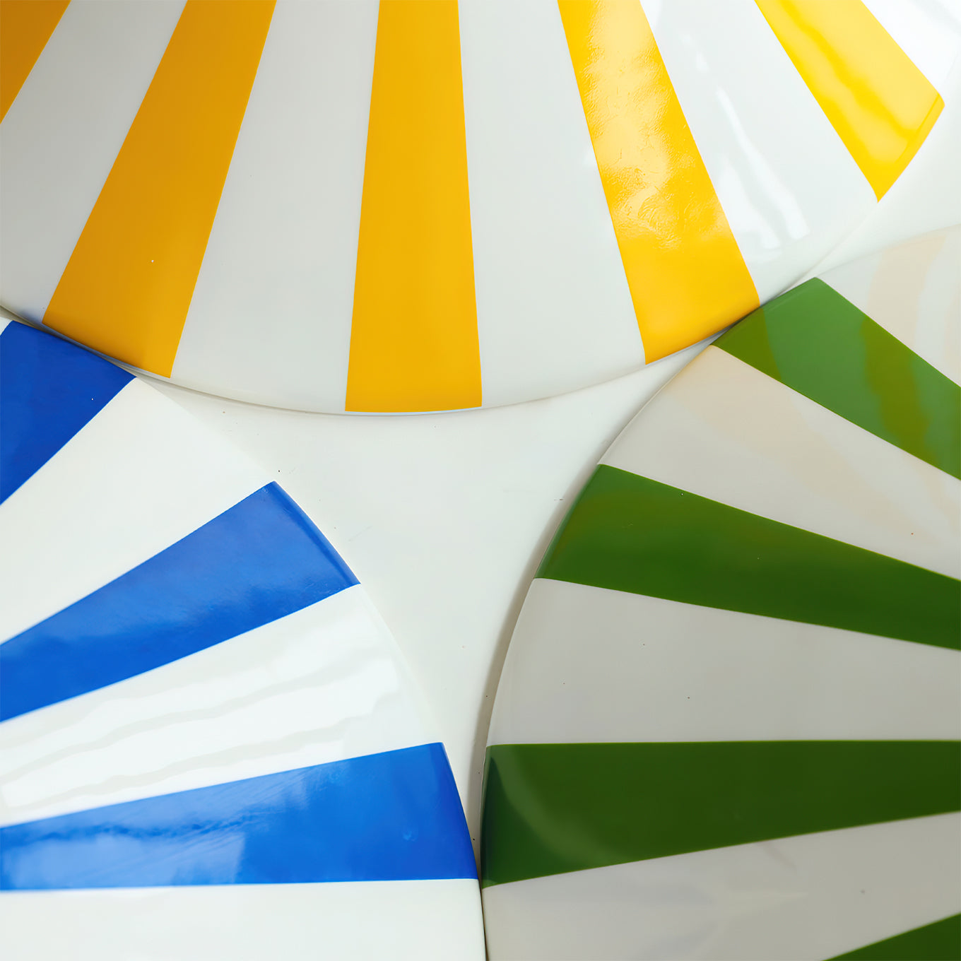 Bobine Pendant Light dekorfine features a playful yet elegant design with a cone-shaped glass shade adorned in vibrant yellow and white stripes. Accented by a polished brass fixture and suspended from a twisted cord, it brings a cheerful burst of color and a touch of retro charm to any space.