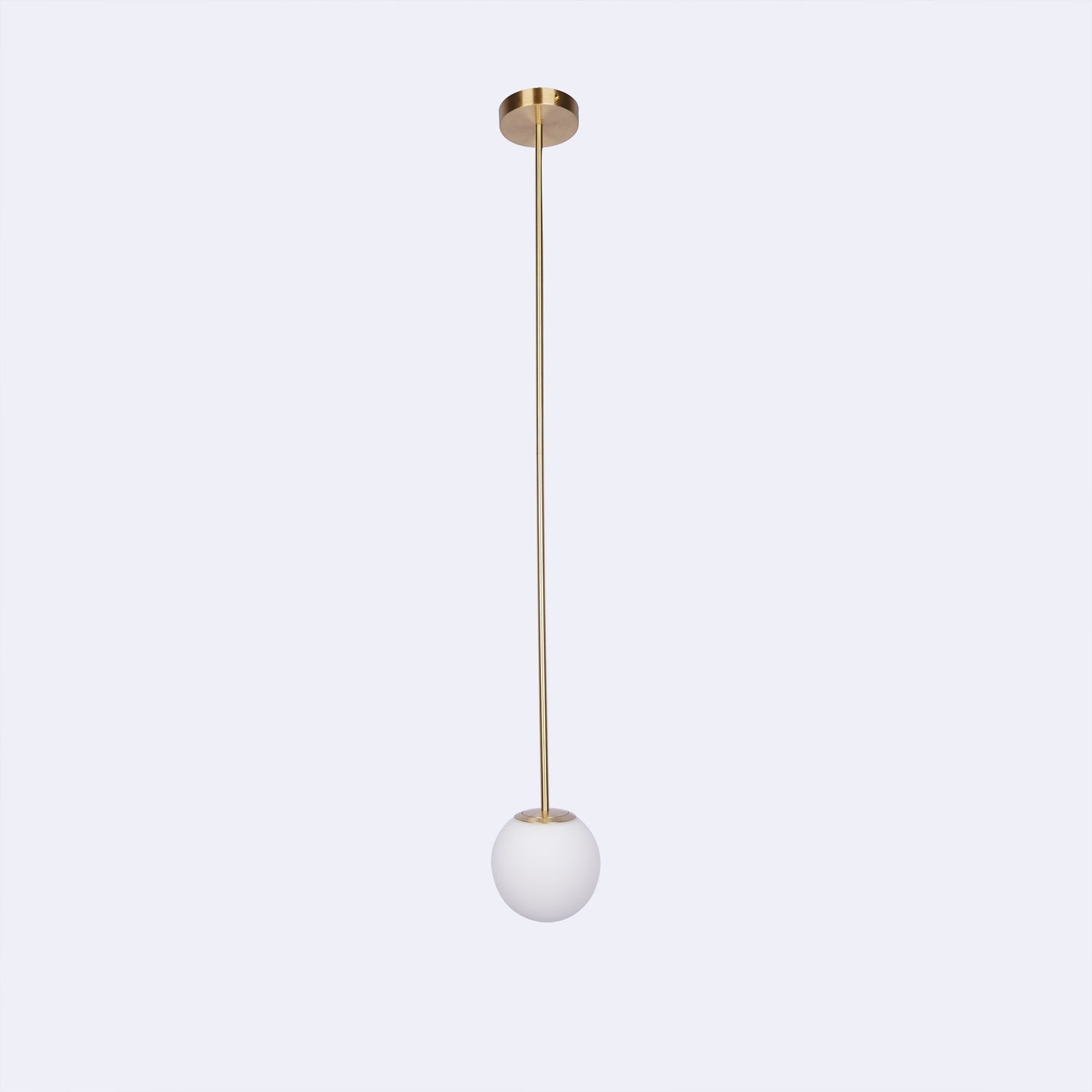 The Brass Architectural Pendant Light features a spherical pendant suspended on a slim brass rod. A modern and elegant hanging light, the globe is made of mouth-blown opal glass which comes in 7 different sizes.