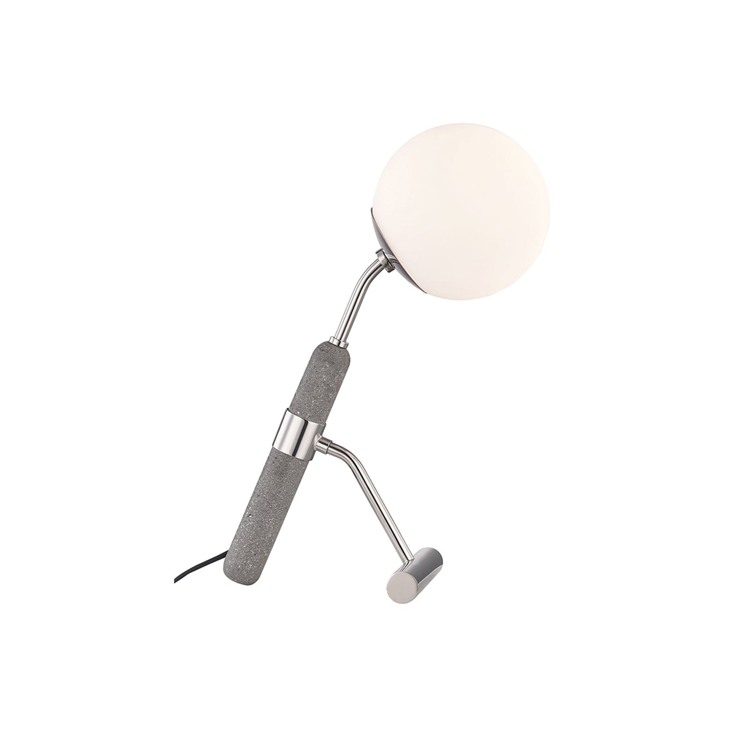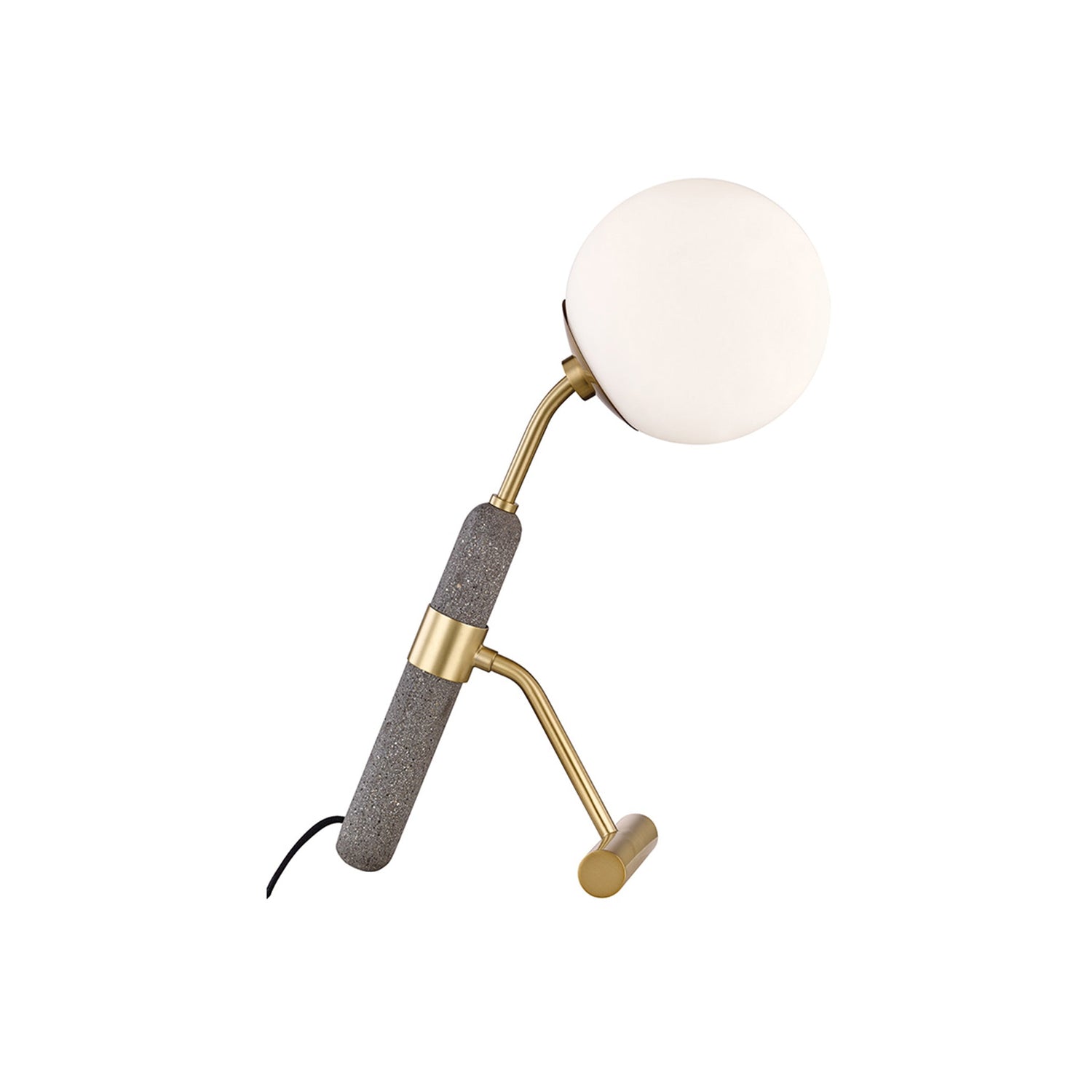 Brielle brings concrete to the party. Grey and a bit rough with heterogeneous flecks, the material introduces instant textural intrigue to a space. Classic white shades and metal cuffs around the cylindrical body contrast the concrete and give it an elegant, contemporary feel.