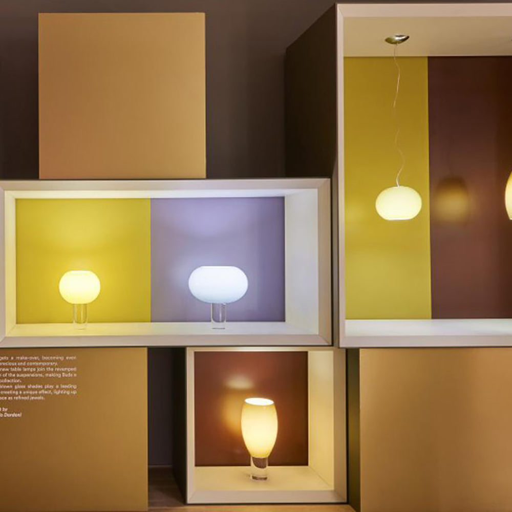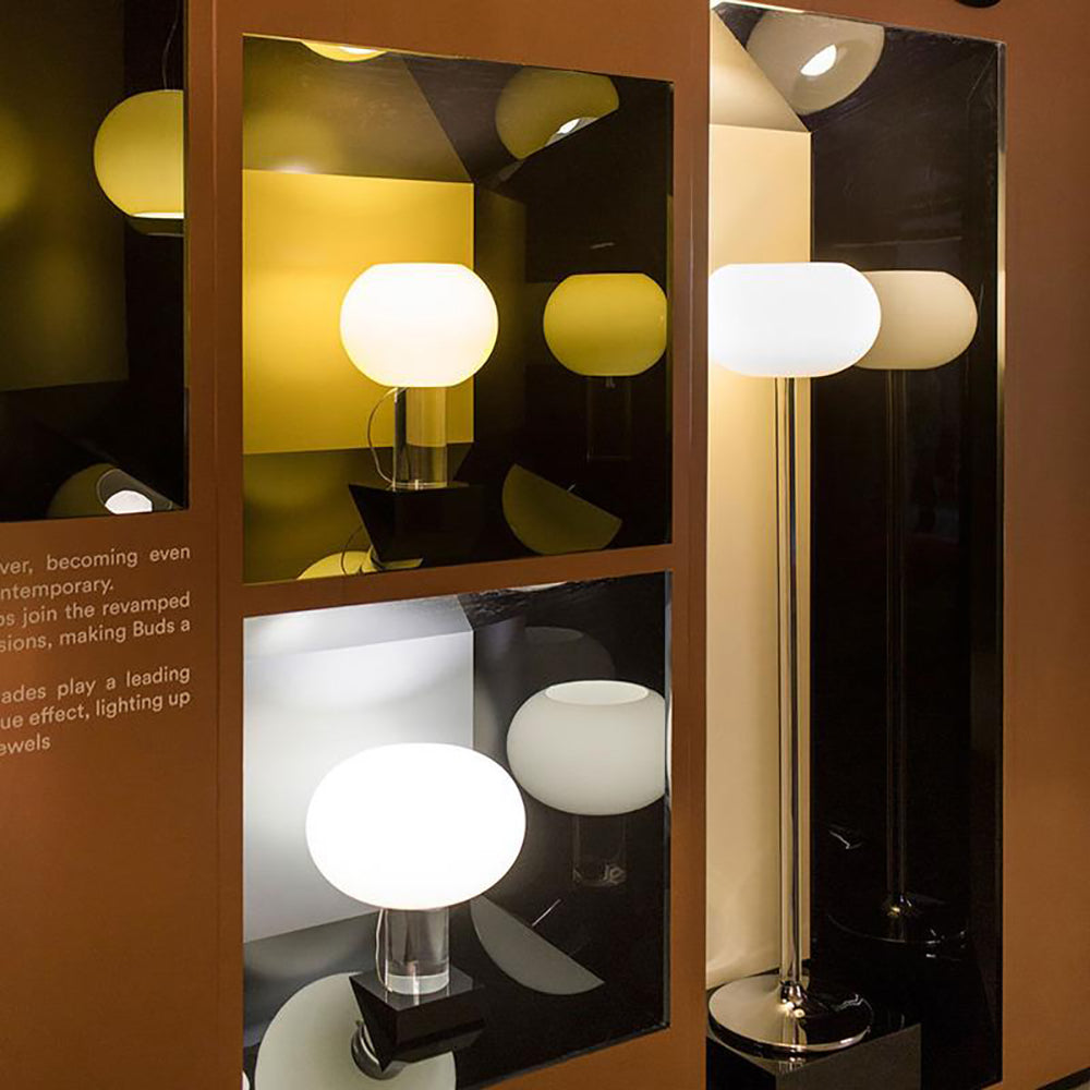 In the 1990s, Rodolfo Dordoni designed a collection of table, floor and suspension lamps for Foscarini in brightly colored blown glass, named after the natural elements: Fruits, Blossom and Buds. Today, Buds has been restyled again, interpreting contemporary taste with a sophisticated wealth and focus on materials. The star of the design remains blown-glass, with a five-layer hand-crafted process, which is immediately evident thanks to the larger cut of the diffuser.