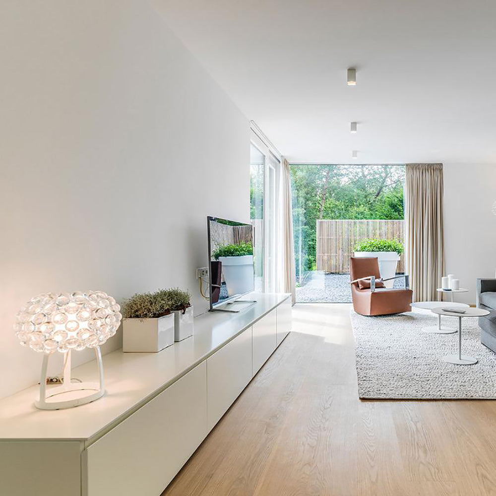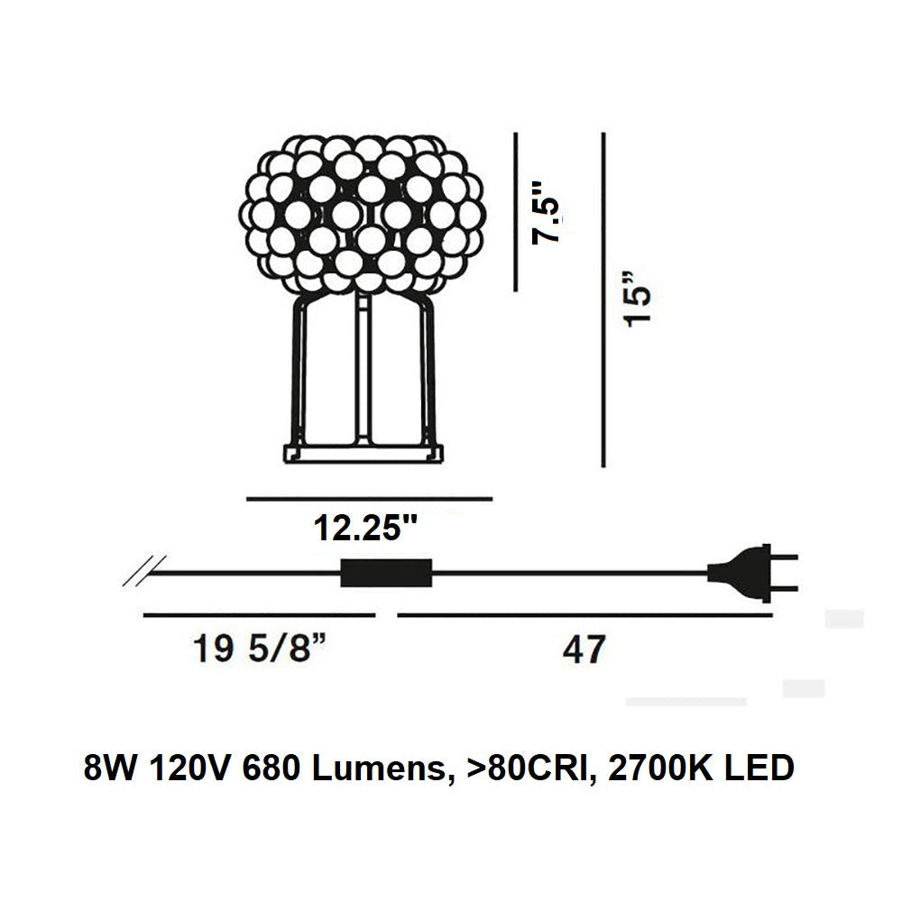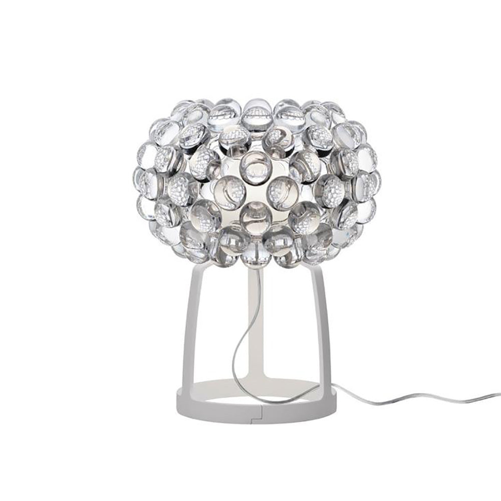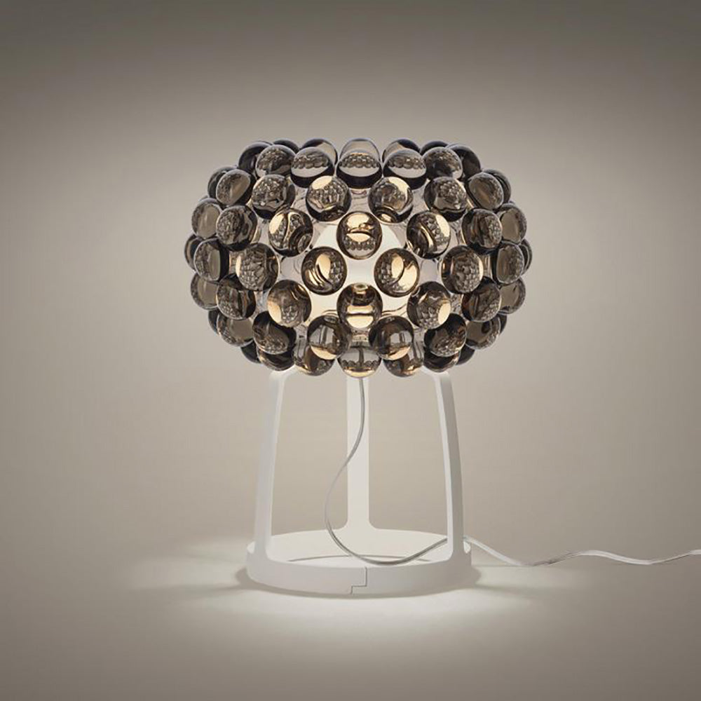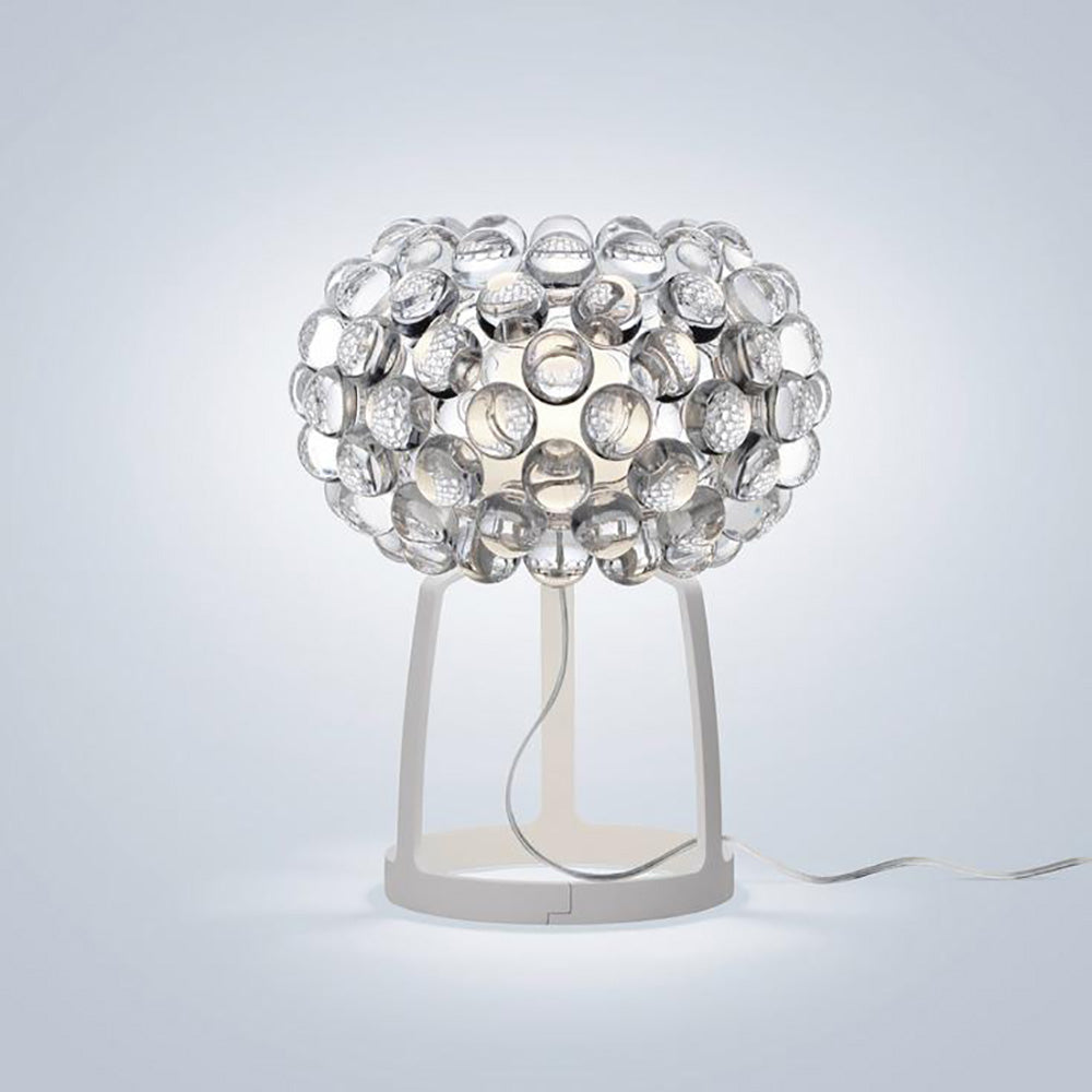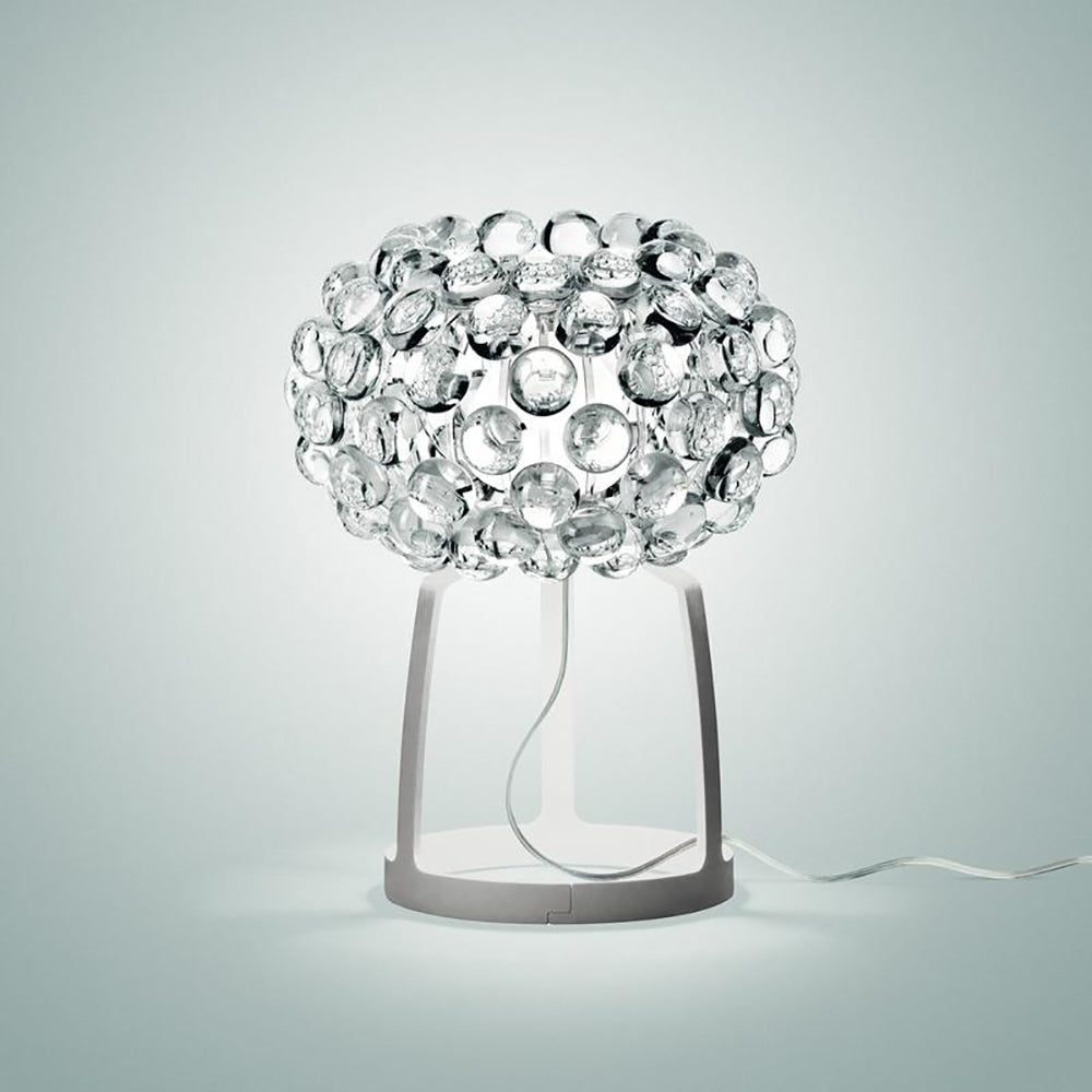 Rich, bright and sophisticated, the Caboche lamp is a mosaic of refraction, a perfect fusion of different personalities in one form, coming together to create the body and light effect of the lamp. When it is turned on, the light diffuses from inside the spheres like lots of bright crystals, providing 360¡ã lighting of the surrounding environment and guaranteeing an illuminated underlying surface. Caboche table is a small jewel of creativity and technology, available in transparent version. The original design of the stem is created by the three supports that join together to form the round base, recalling the spherical form of the diffuser, and thus guaranteeing a combination of coherence, originality and lightness. Table lamp composed by spheres of polymetylmetacrylate, transparent. A screen in white satinized blown glass guarantees maximum diffusion of light and prevents glare. A solid base is provided by the original design of the stem. Caboche is the perfect protagonist for homes or public areas, uniting visual impact with lightness, decorative value and functionality.