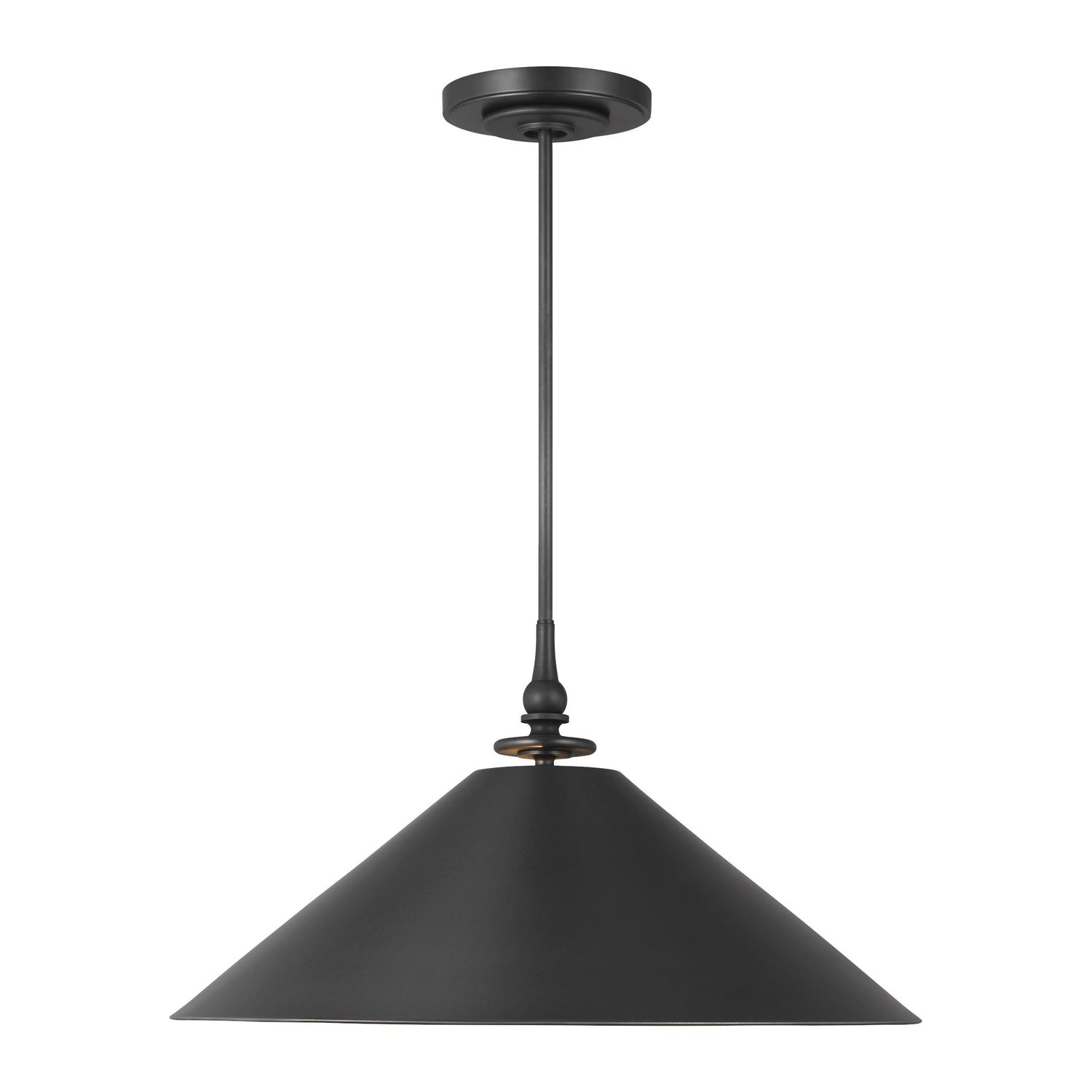 The Thomas O'Brien Capri Pendant has a classic look that allows it to be used in many types of interiors. It features a conical steel shade suspended from a straight stem and set into a round canopy. Includes one 6 inch and four 12 inch down rods. Capri also includes chandeliers with large scale arms welded into the hub, tapered and globe pendants with milk glass shades, sconces and lamps.