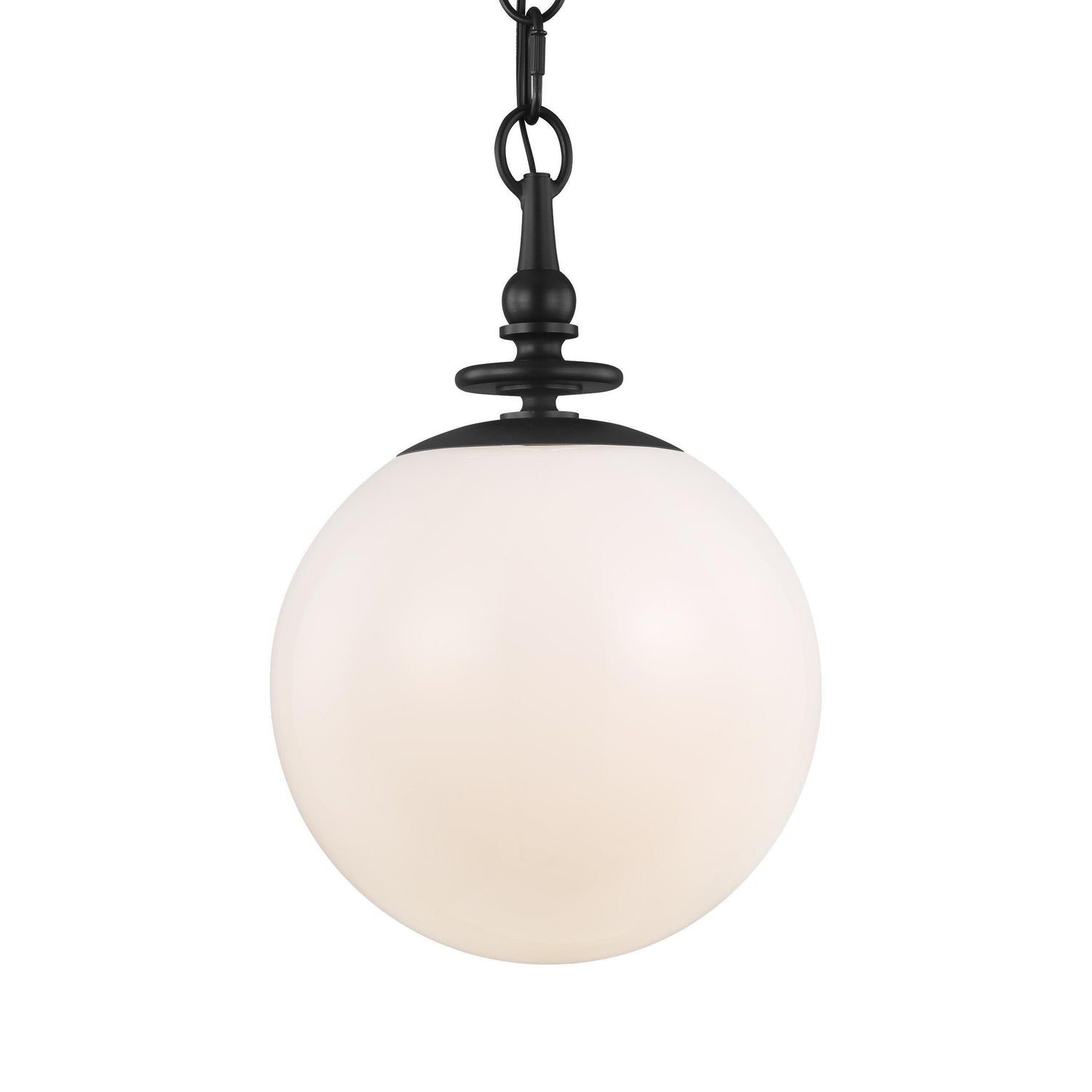 The Thomas O'Brien Capri Pendant in aged iron features a Milk White glass globe shade set into an Aged Iron cap and suspended from a matching chain and round canopy. Also available in Polished Nickel, the Capri by TOB globe pendant comes in two sizes and is safety rated for damp locations.