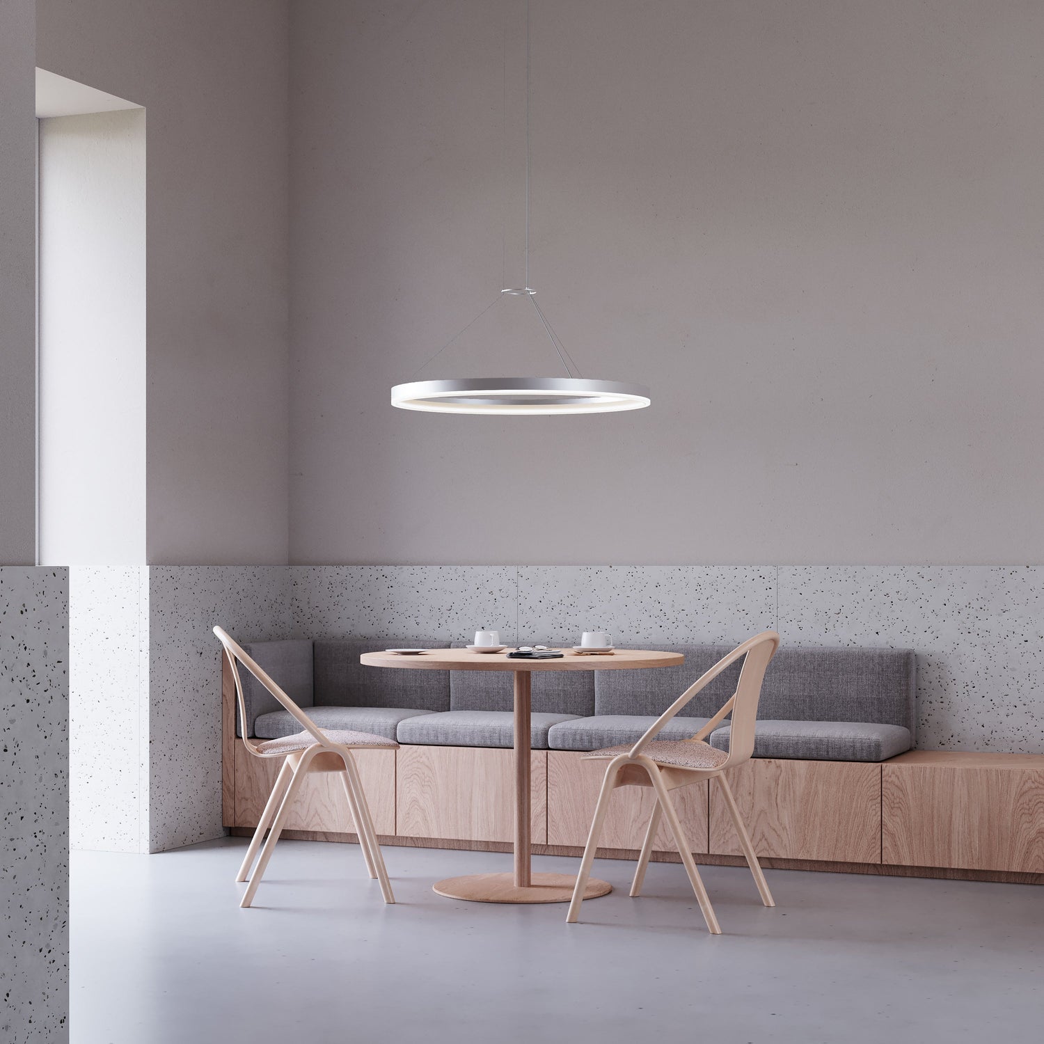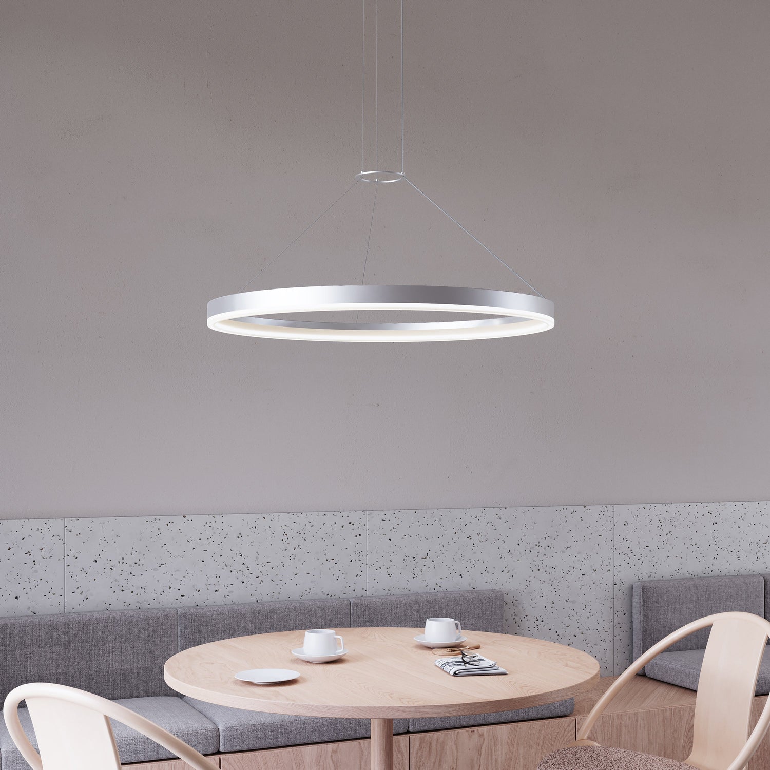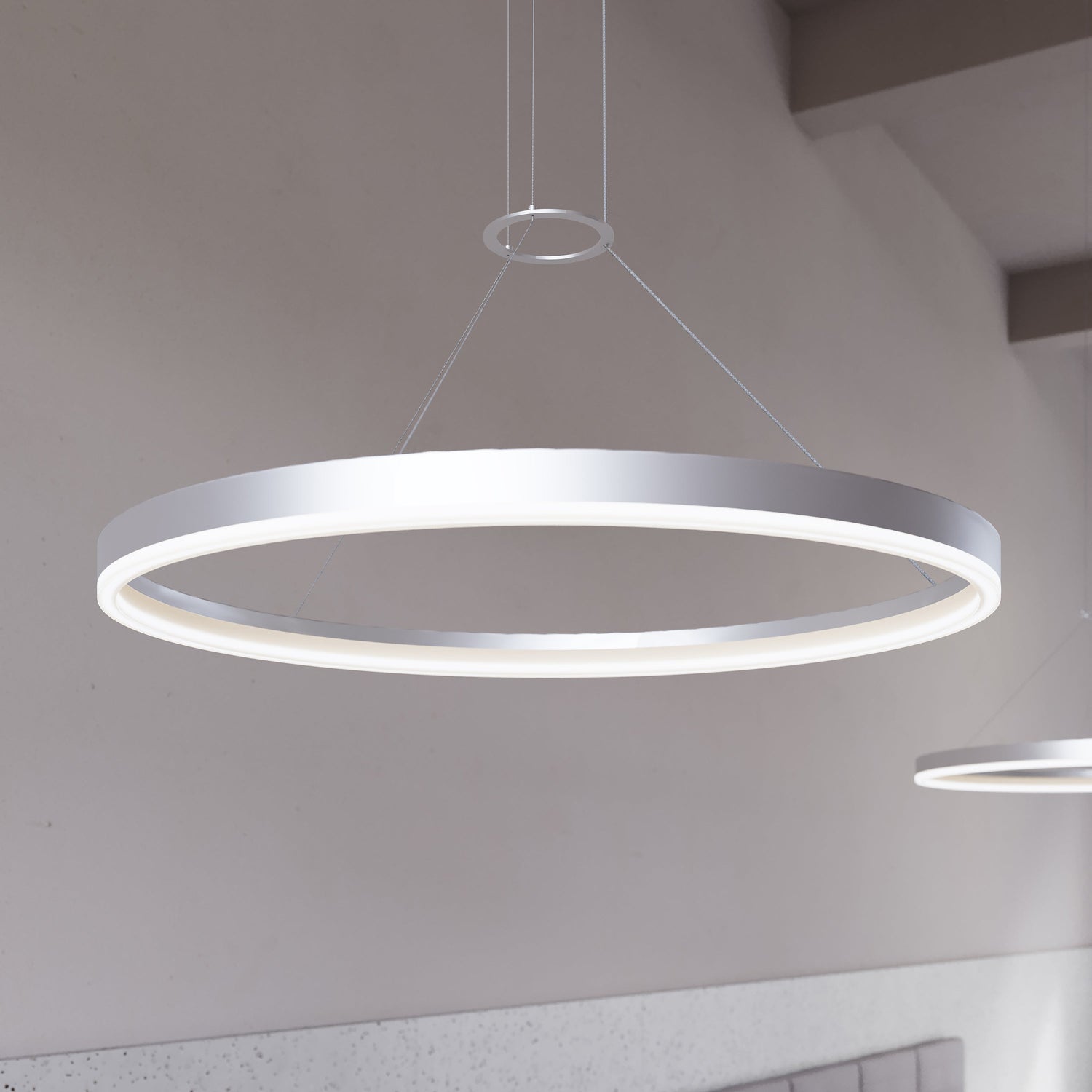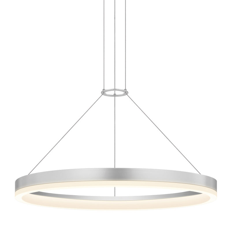 A circular pendant appears to float in SONNEMAN's illustrious Corona Rings Pendant. Designed by Robert Sonneman, the ring is equipped with an internally focused LED, and is suspended by wire. With the use of space, light, and geometry, this contemporary pendant will command the room with its stunning design. Perfect as a focal point in a living room, this unforgettable pendant will make a statement. It's available in a range of finishes and sizes.