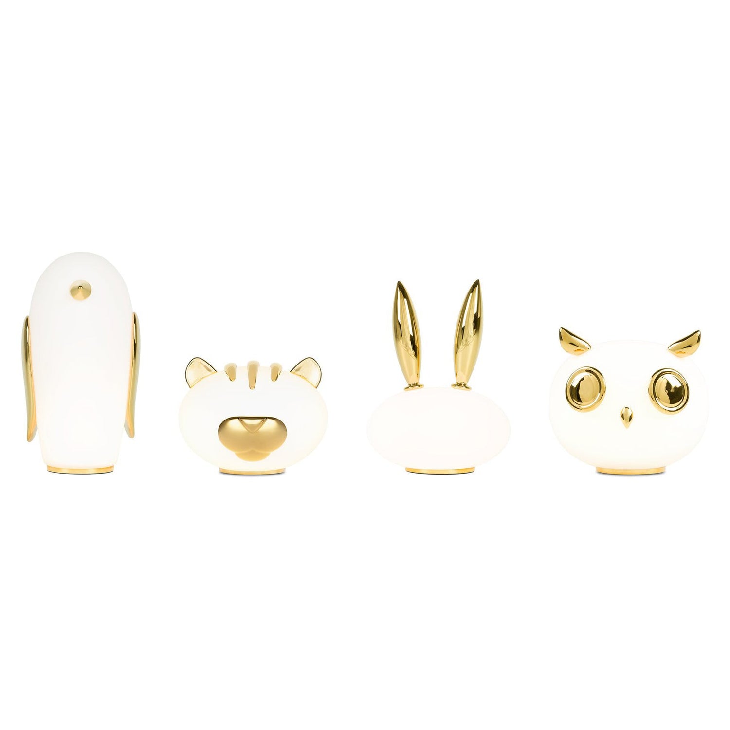 Uhuh, Purr, Noot Noot, & Grwoww are a series of table lamps by Marcel Wanders studio. Each pet has its very own personality and characteristics, but they're all rounded, endearing and elegant. The CU Pet Lights find their place in any kind of interior and space. With frosted glass bodies and heads decorated with touches of ceramic gold, they emit a heart-warming glow you can dim to match the hour of the day. Choose your favourite character, penguin, rabbit, tiger and an owl, and enjoy a glowing pet with heaps of charm!