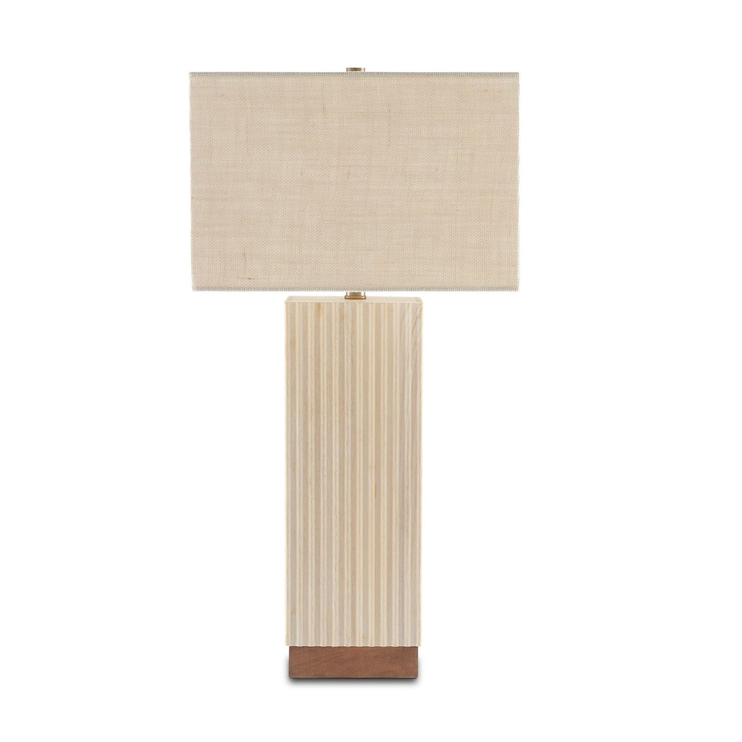 The Dalmeny Table lamp is made of whitewashed rattan that looks both sleek and modern. The warmth of the natural wood base is an attractive counterpoint to the pale striated column of the beige table lamp that is topped with a Marshmallow Burlap shade.