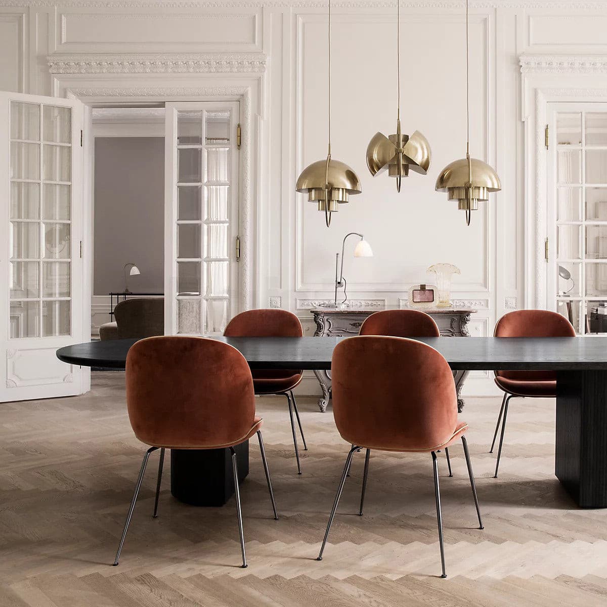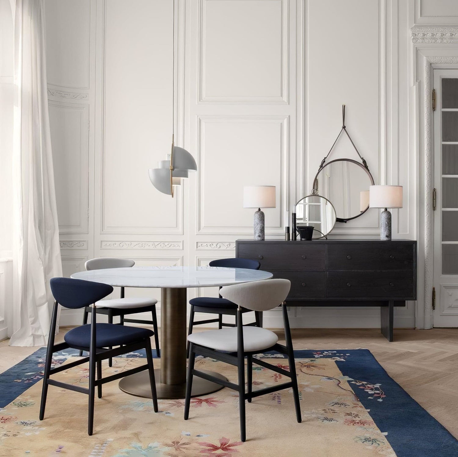 Turn both halves downwards and the light will illuminate the ceiling and create a cozy atmosphere. By positioning the halves upwards, downward light is generated which, for example, illuminates the dining table. If the halves are moved opposite one another, the light is indirectly dispersed and the lampshade looks like a sculptural work of art.