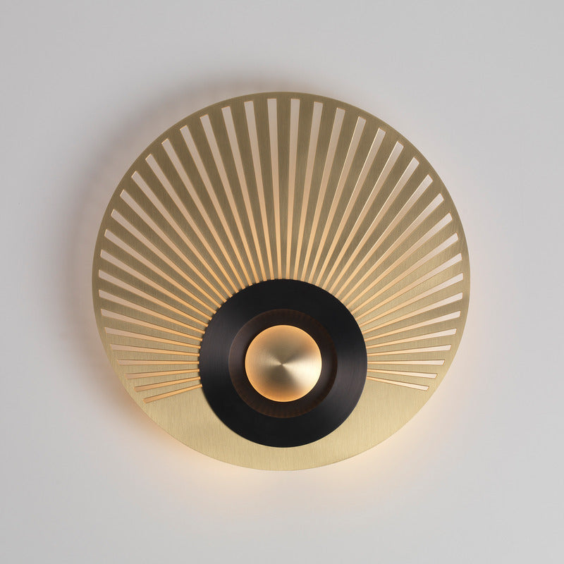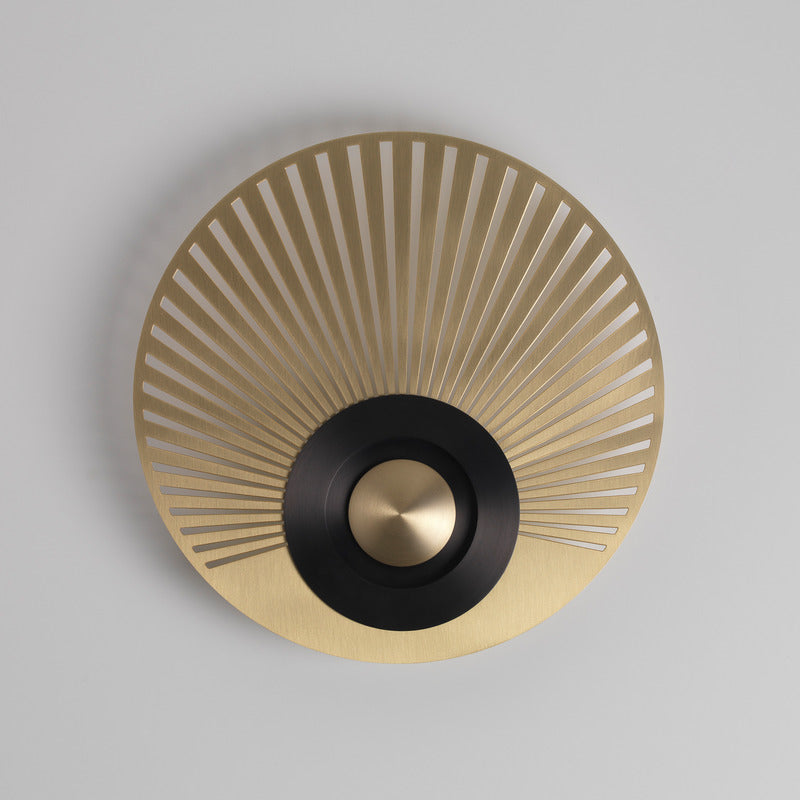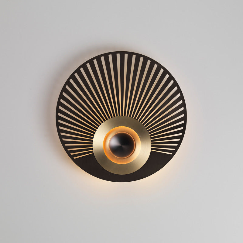 This wall light, with an illuminated center, assembled with an extremely fine openwork or a fully covered piece of metal gives this collection an Art deco style. From semi-darkness to a patterned light source, arrangements can vary.