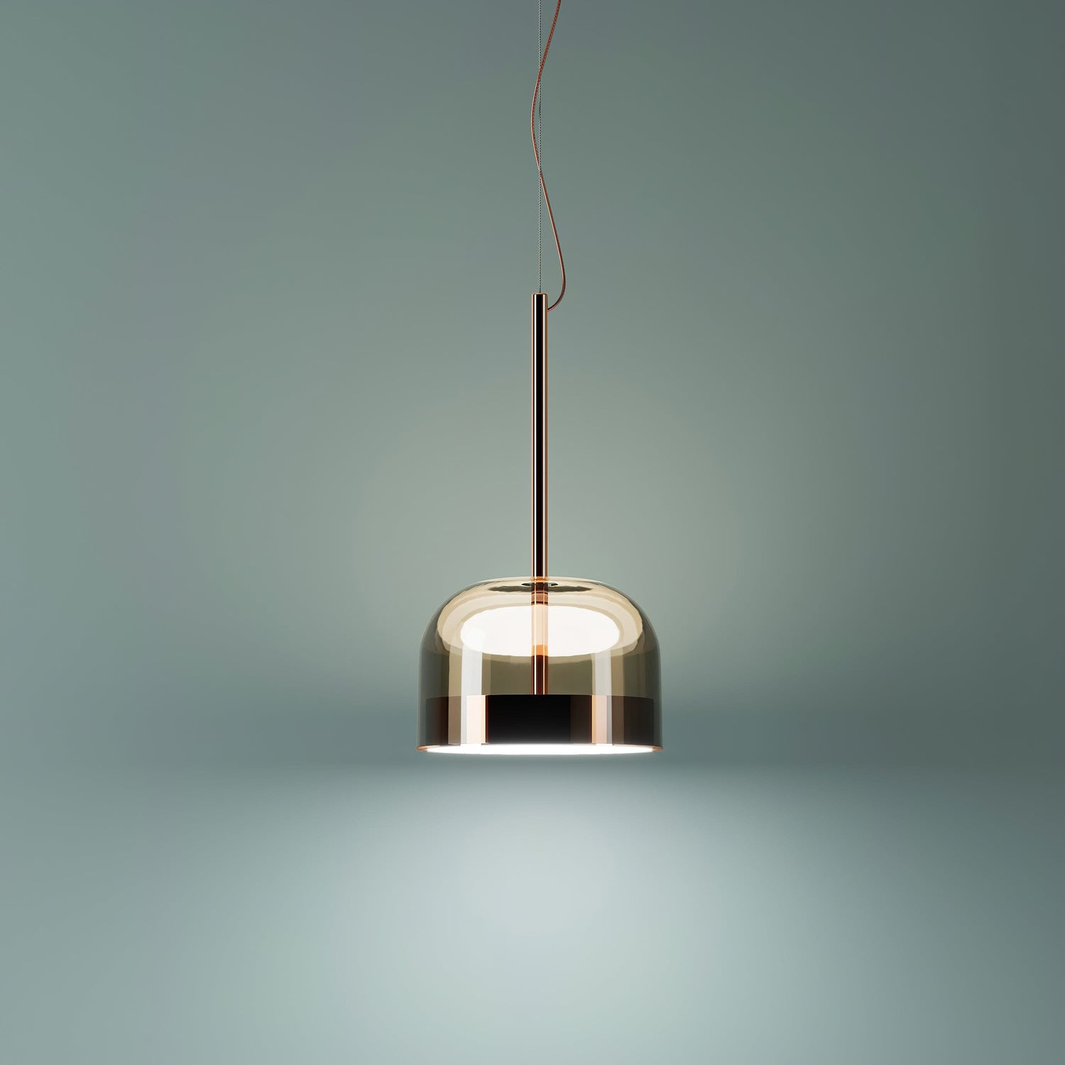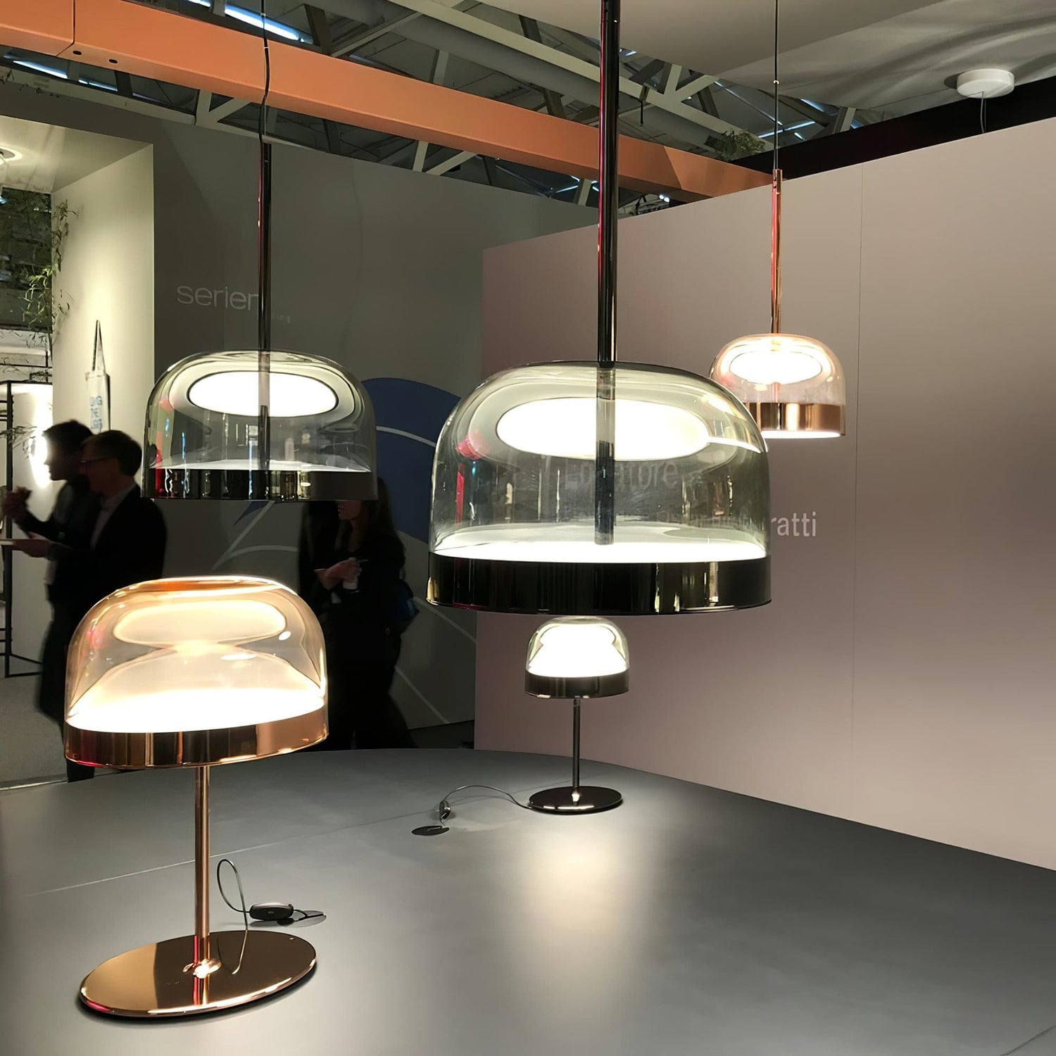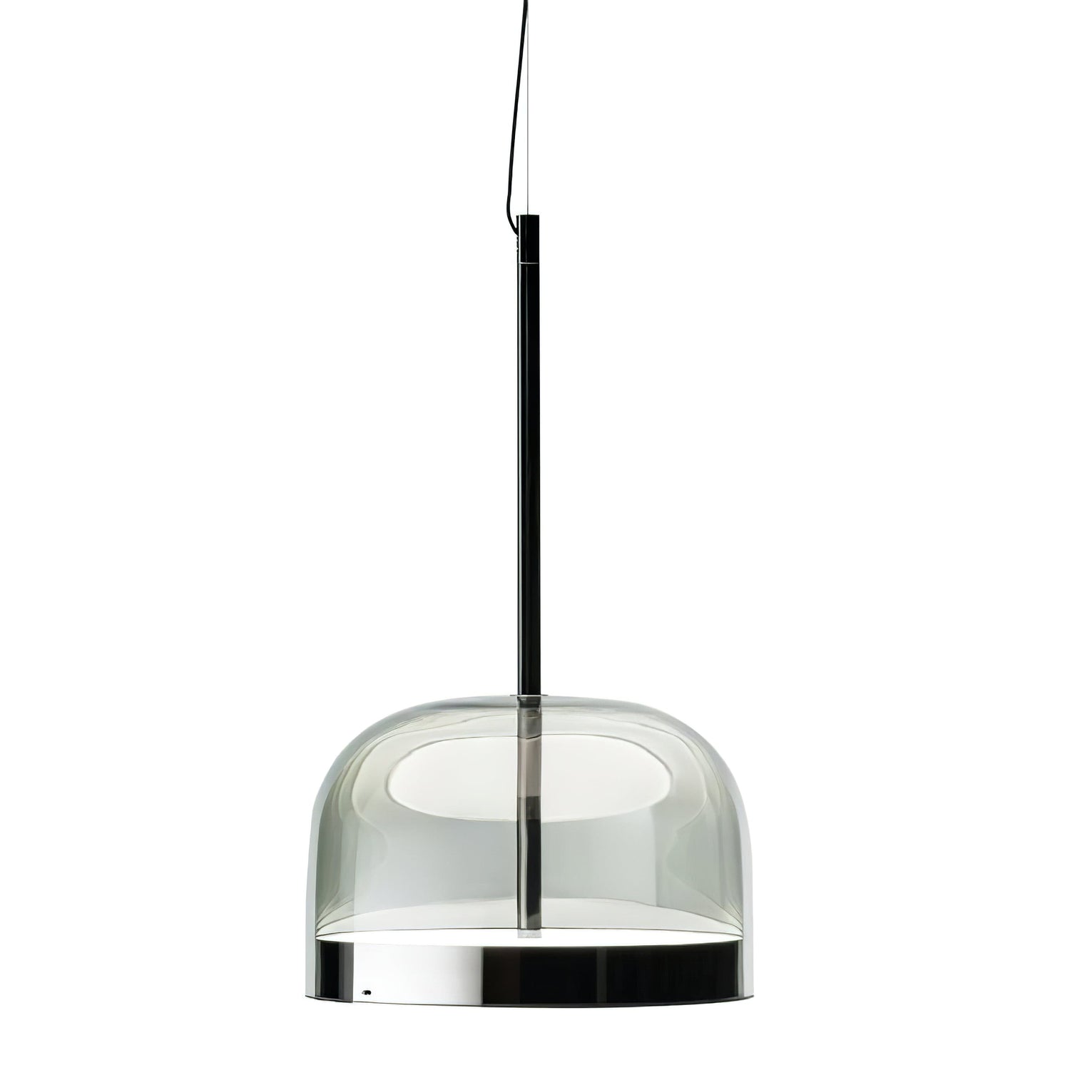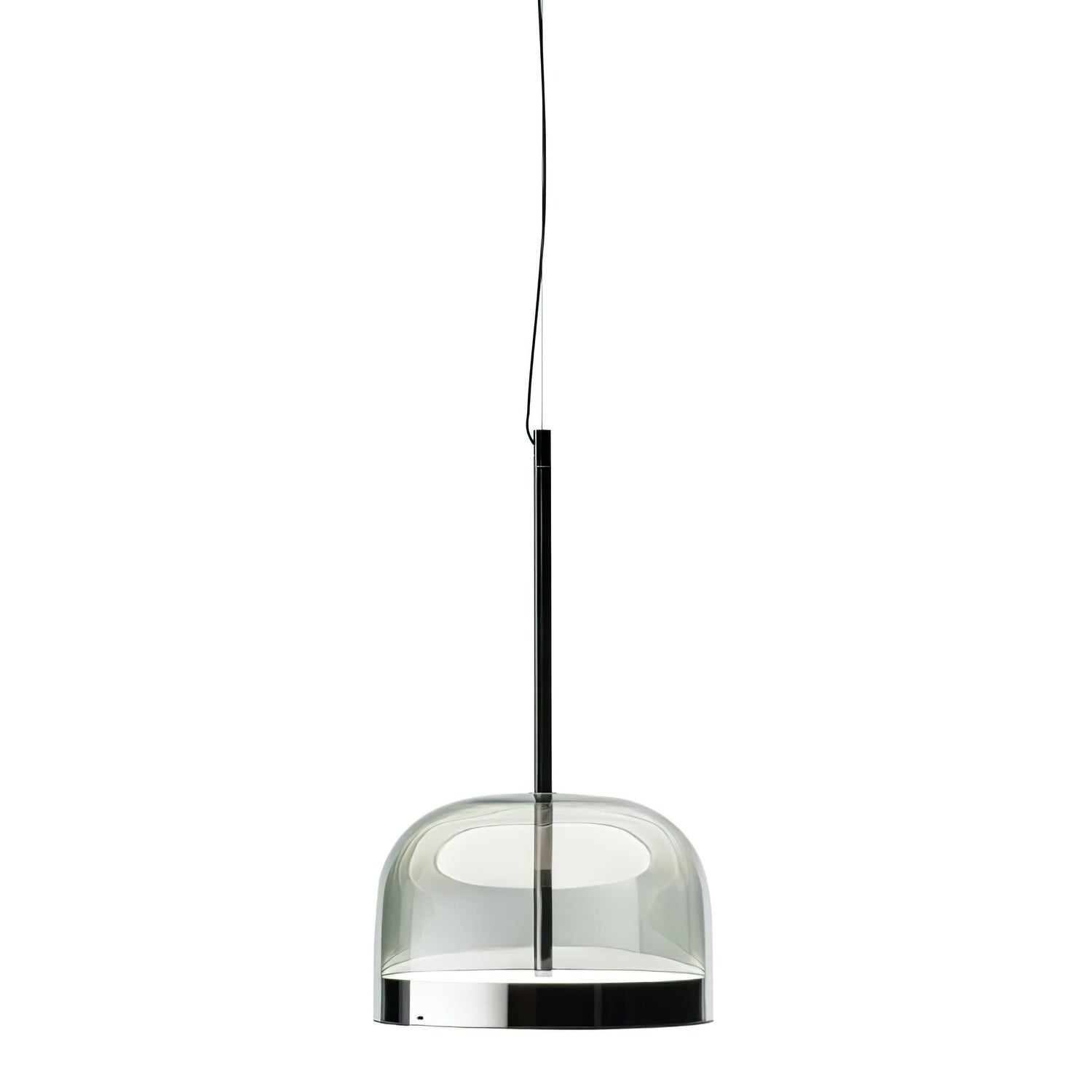 The Equator Pendant takes a classic silhouette and reinterprets it with a sleek glass shade and a seemingly empty interior, with light being emitted by two luminous discs placed inside a central metal band visible on the shade to create the equator. The lower disks provide downward lighting and the upper disc illuminates the glass shade to create a soft, diffused light.