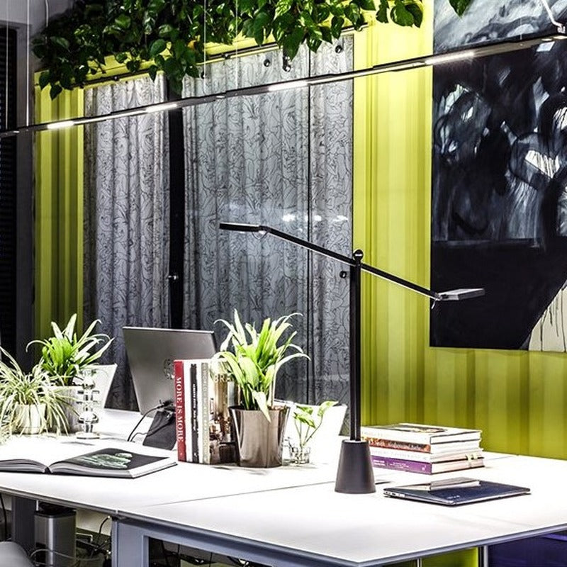 Resembling a high-tech traffic light, Equilibrist balances 2 different LED light sources like the weights of a scale. The diffuser heads rotate around a vertical axis, emitting non-symmetrical light and operate separately with dimmer switches. Made of black metal, the Equilibrist table lamp was awarded a Wallpaper Design Award in 2015.
