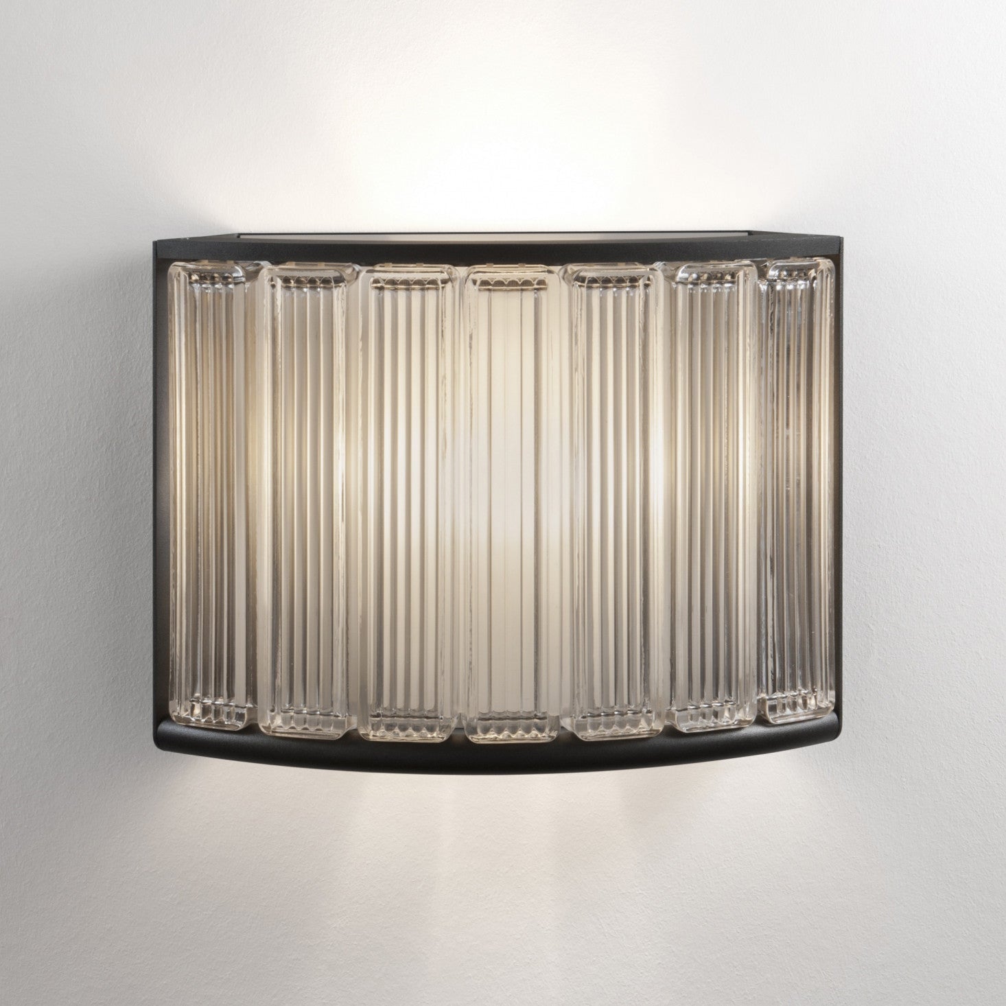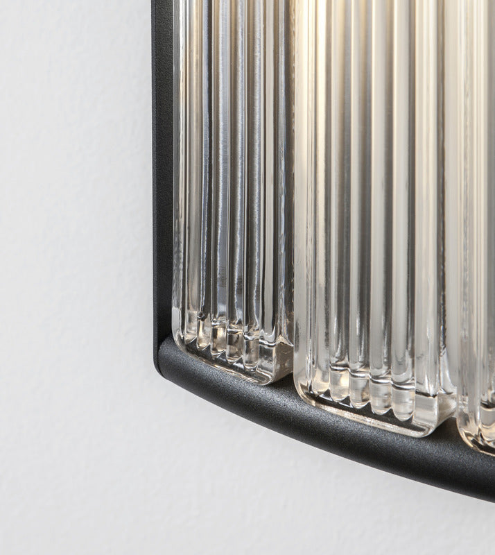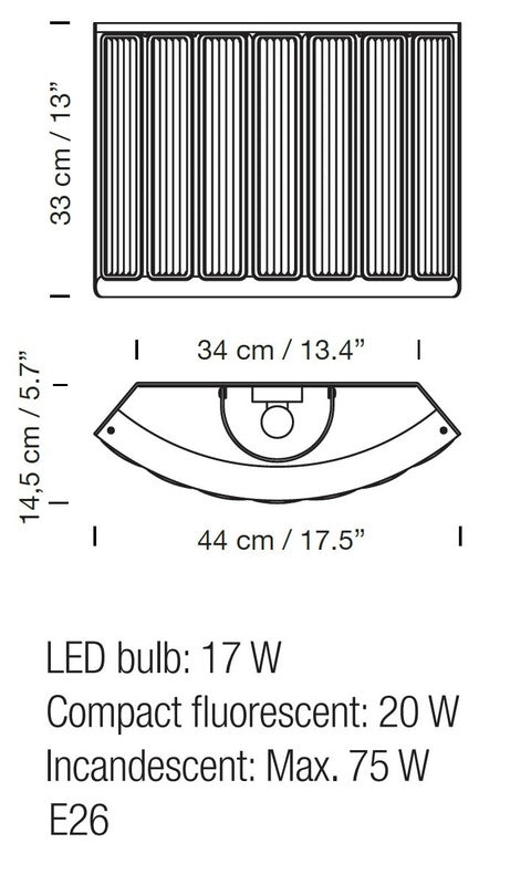 New wall version of the famous Estadio lamp. A circular section with the same Herculean solidity of the metal structure which holds the glass blocks that filter its inner light, providing ideal lighting for large spaces.