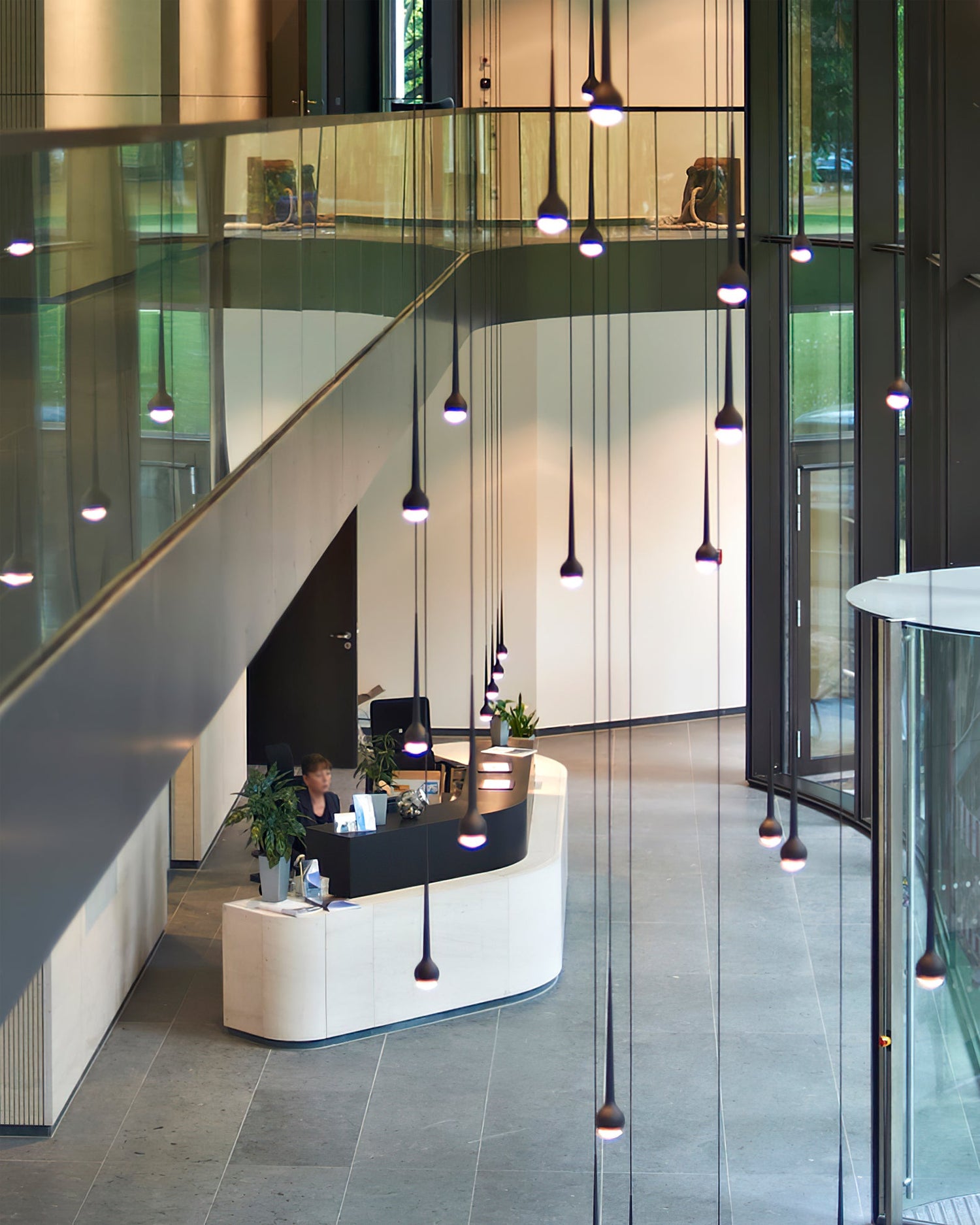 The pendulums of Falling Water seem to drip like water from the ceiling. The soft, dynamic shape of the lampshades gives the LED luminaire elegant character. Each is equipped with a special optical lens, which reflects the light brilliantly and with natural coloring. Because its surface reflects the surroundings and seems to blend in with the luminous diffuser.