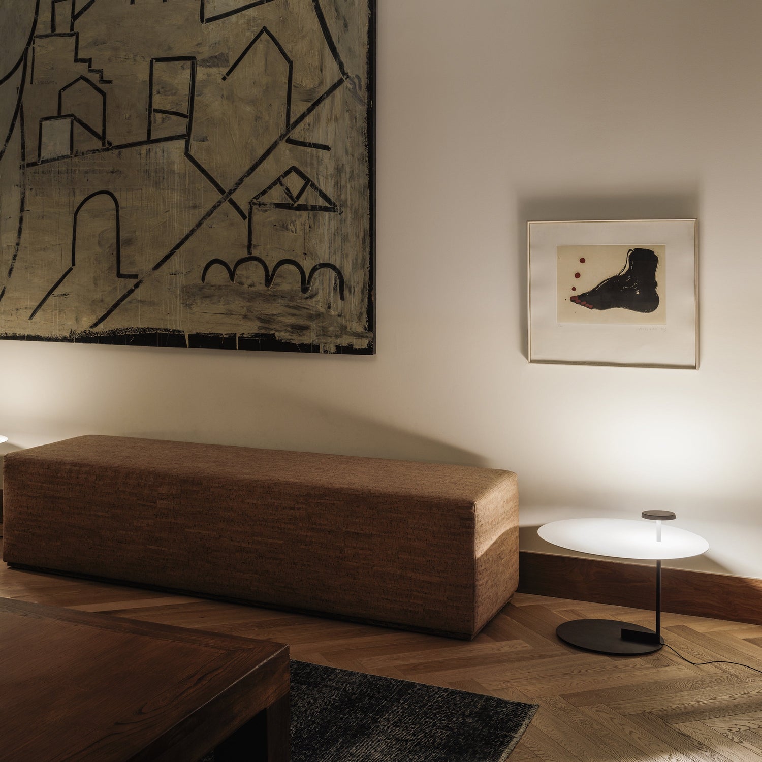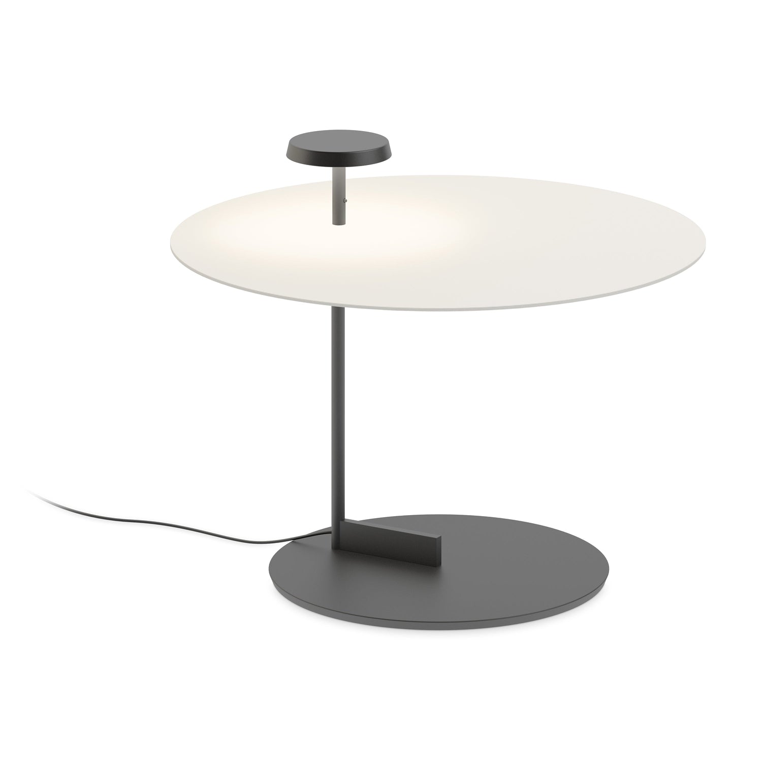 The Flat Side Table / Single Floor Lamp offers multiple functionalities; material and light are integrated into a single body. When deployed in pairs, the smaller, complementary disc captures and reflects light back at the larger plate, creating pockets of soft, pooled indirect light that illuminate both space and the surface itself.