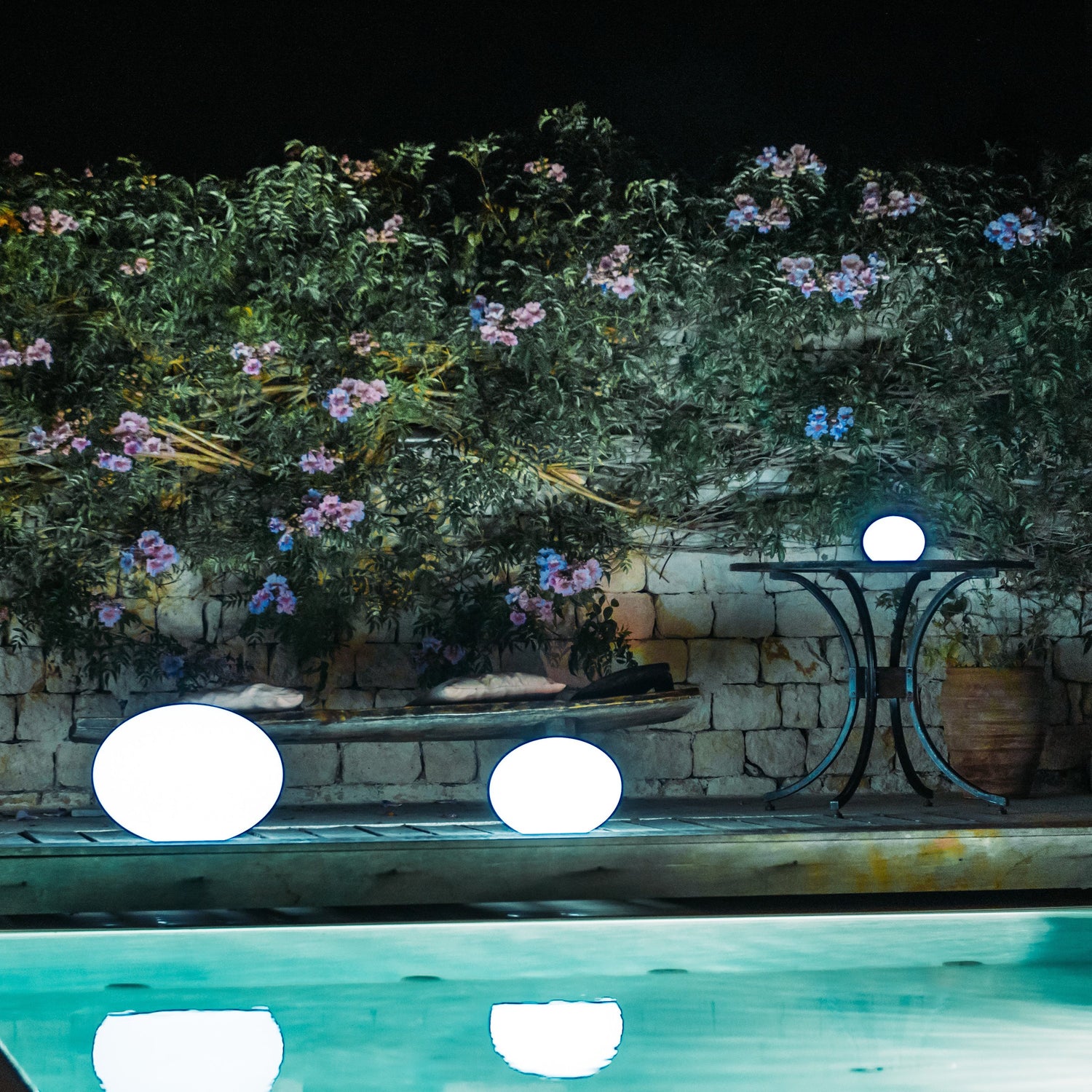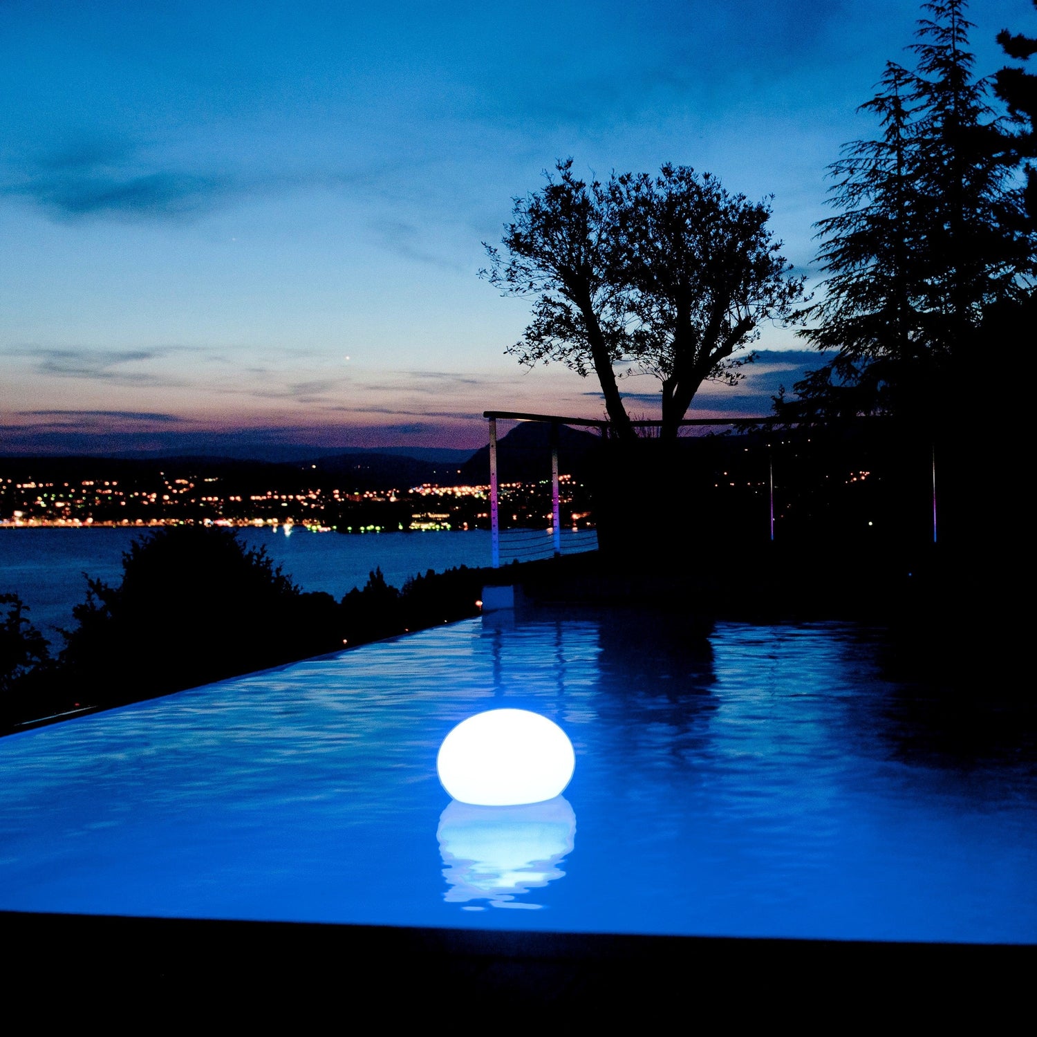 A flattened version of the classic design from Smart and Green, the Flatball Outdoor Bluetooth LED Lamp brings brilliant accented light to your favorite patio or poolside deck spaces. Crafted from polyethylene and wet rated for outdoor use, this ovalesque lamp is perfectly designed to fit all spaces and even float upon your pool's surface, providing a touch of elegant and modern style to your home. Outfitted with Bluetooth SmartMesh technology, the brightness and color of the lamp can be controlled from your smartphone or tablet. Station around your pool deck or cluster multiple together to create a unique lighting design and bring an illuminated touch to all of your light night outdoor activities and fun.