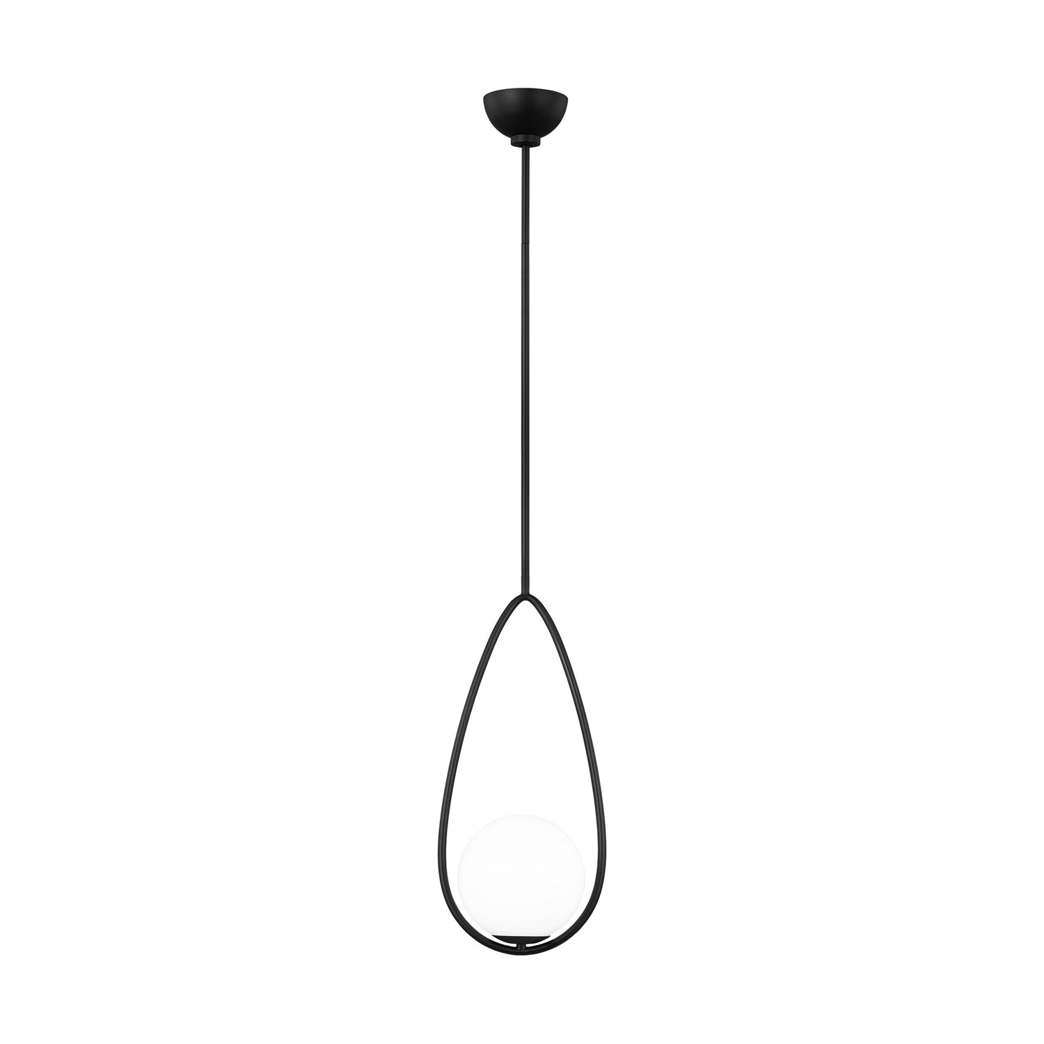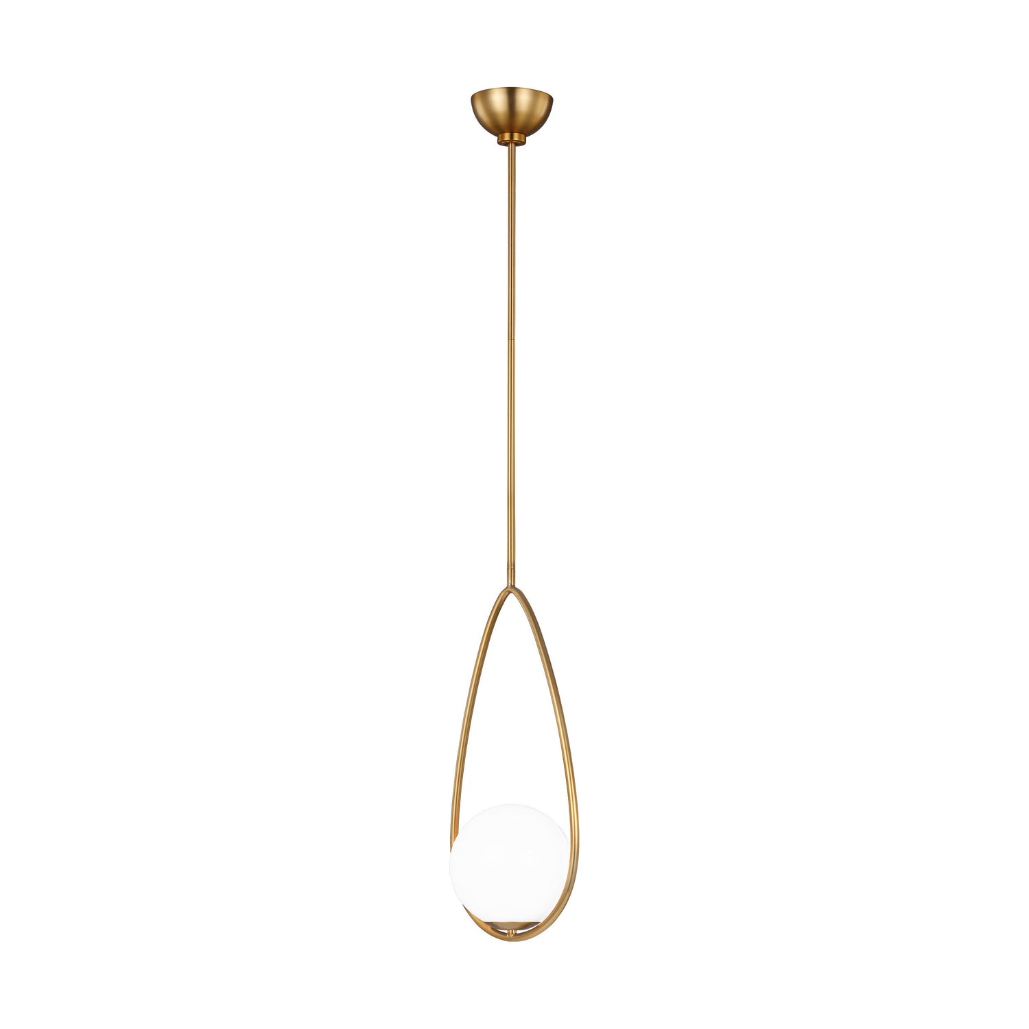 The Aerin Galassia one light single-tier chandelier by AERIN in burnished brass and midnight black balances glass globes on an elongated frame, which gives it a contemporary look. The white glass casts a soft, welcoming glow, while the elongated frameworks particularly well in large, high-ceiling rooms.