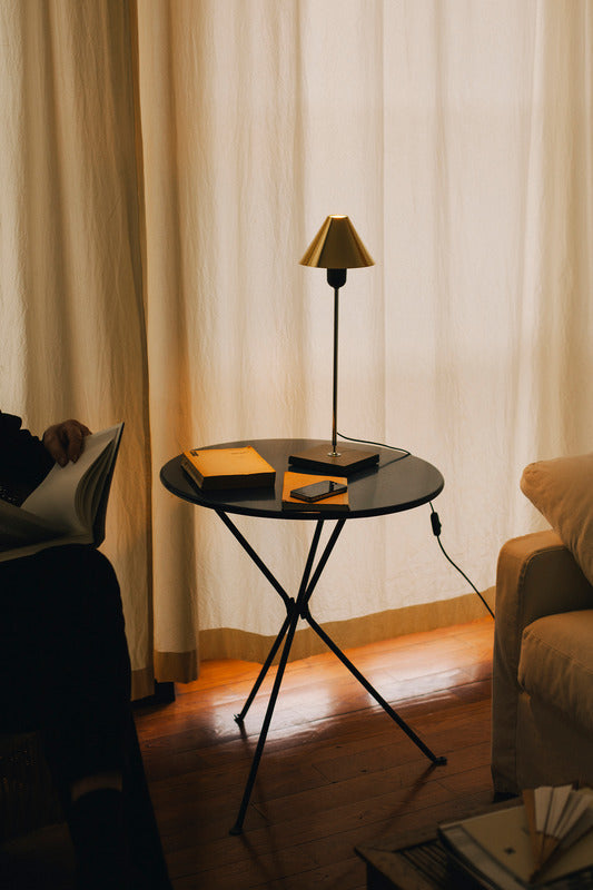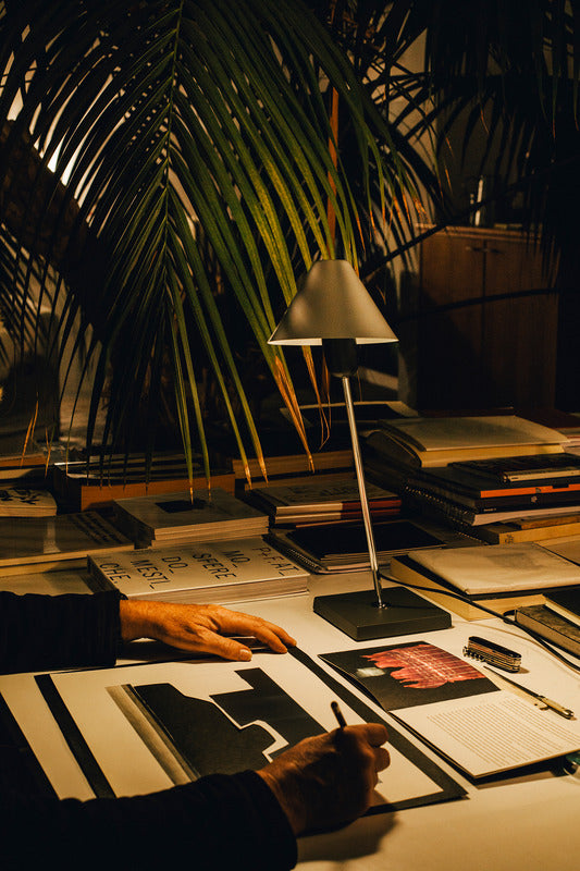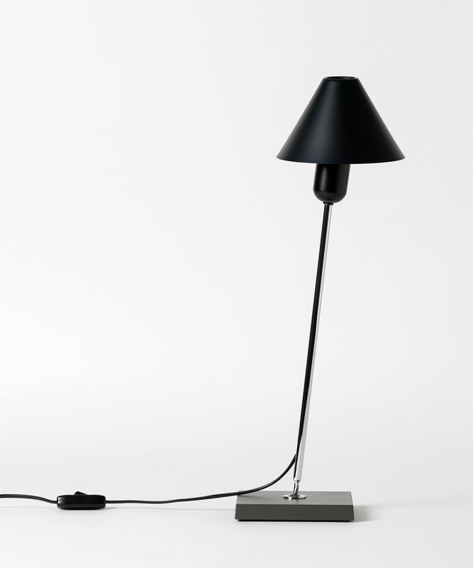 A base, an arm, a shade; a square, a line, a cone; steel, brass, aluminum; and light. Gira sums up the basic components of a lamp. Based on the study of the traditional flexo, these components have been re-configured in order to endow the lamp with greater flexibility of movement. The shapes lend the light prominence. It is a discrete, versatile lamp: the arm may be rotated and the shade may be positioned to form localized spots of light for working, reading or writing, whether in a room, a hotel lobby or an office.