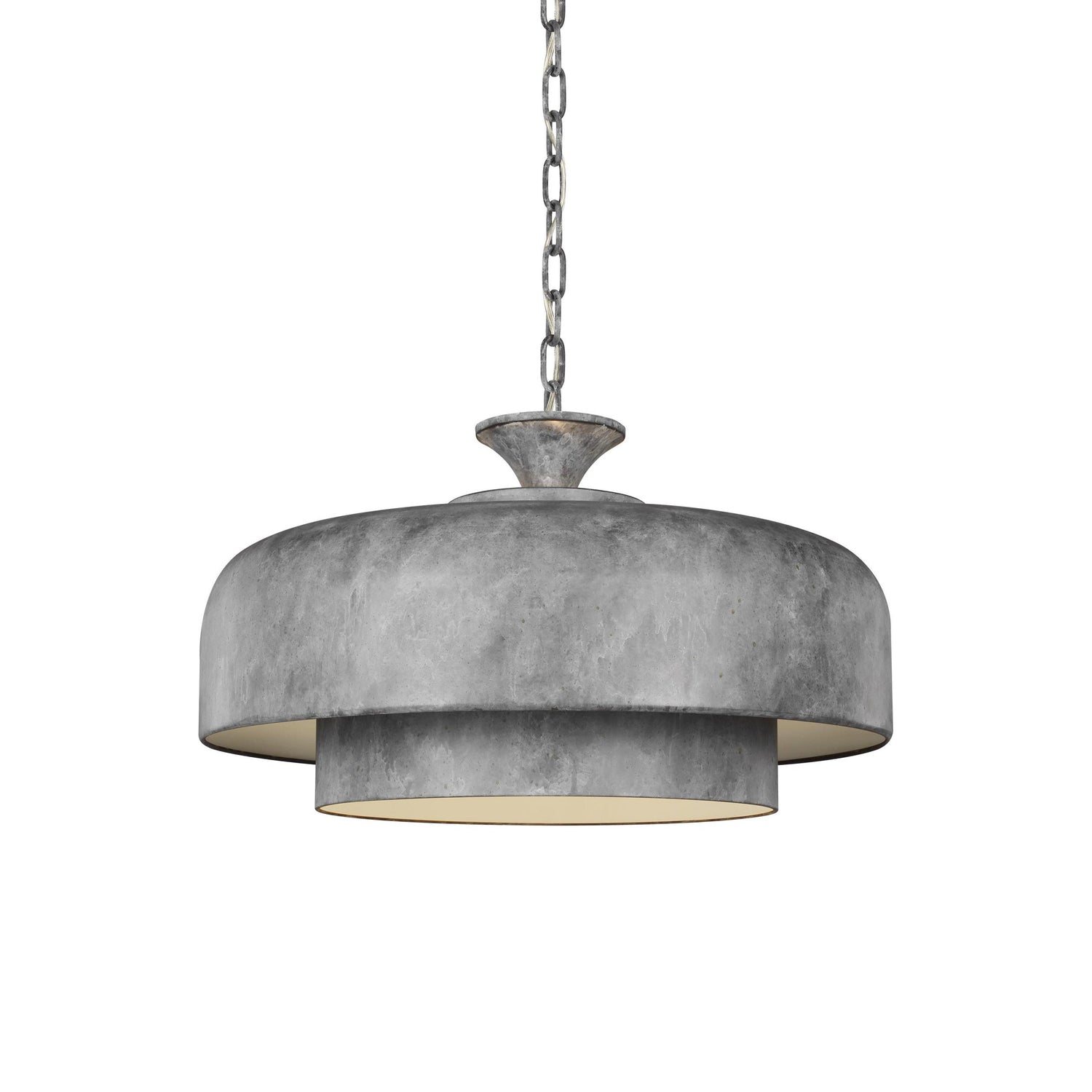 The ED Ellen DeGeneres Haymarket one light pendant in weathered galvanized features mid-century design with touches of rustic and industrial. Layered concentric tiers constructed of cast metal add depth and dimension while a painted white interior catches the light. The artisanal hand-applied Weathered Galvanized finish recreates the authenticity of vintage industrial fixtures.