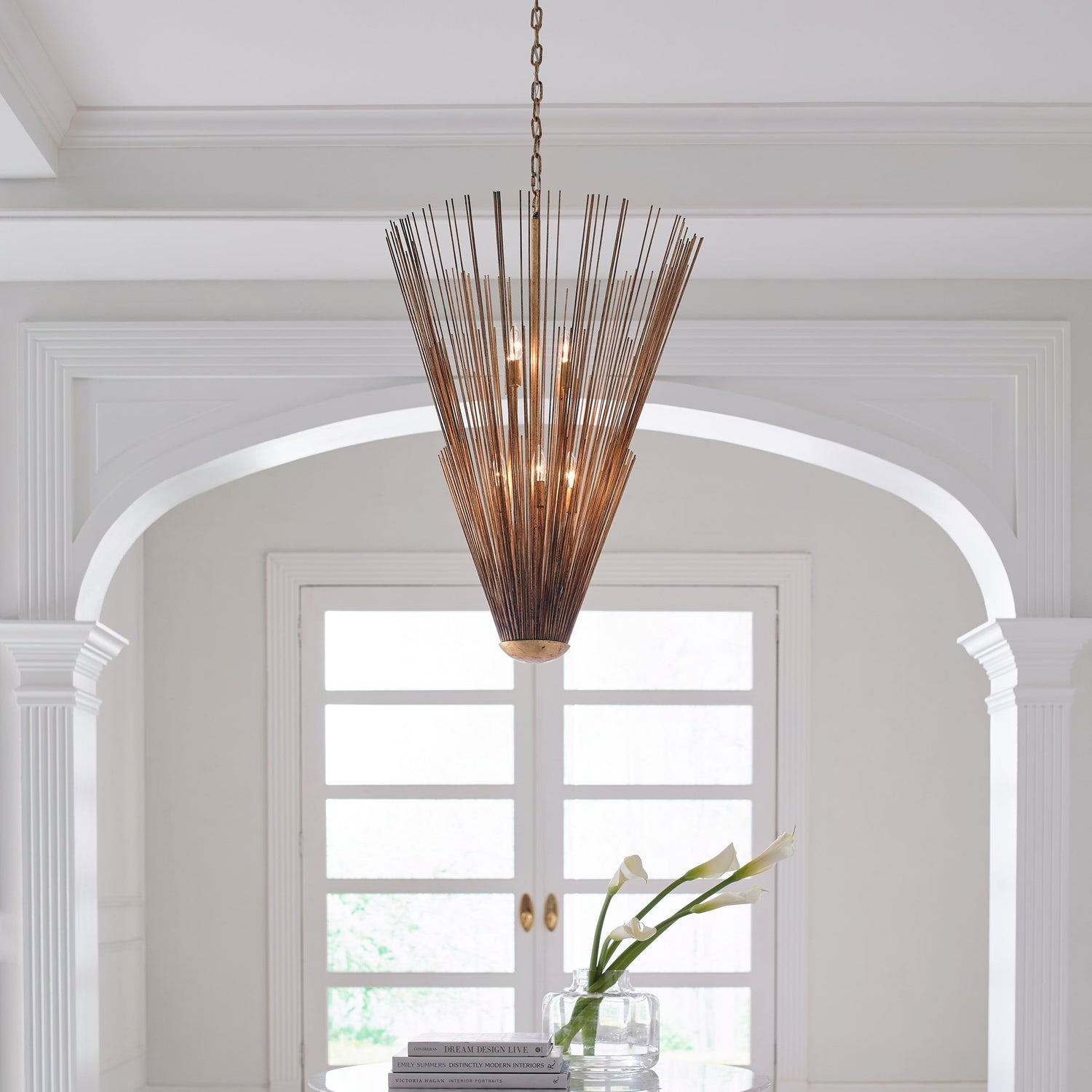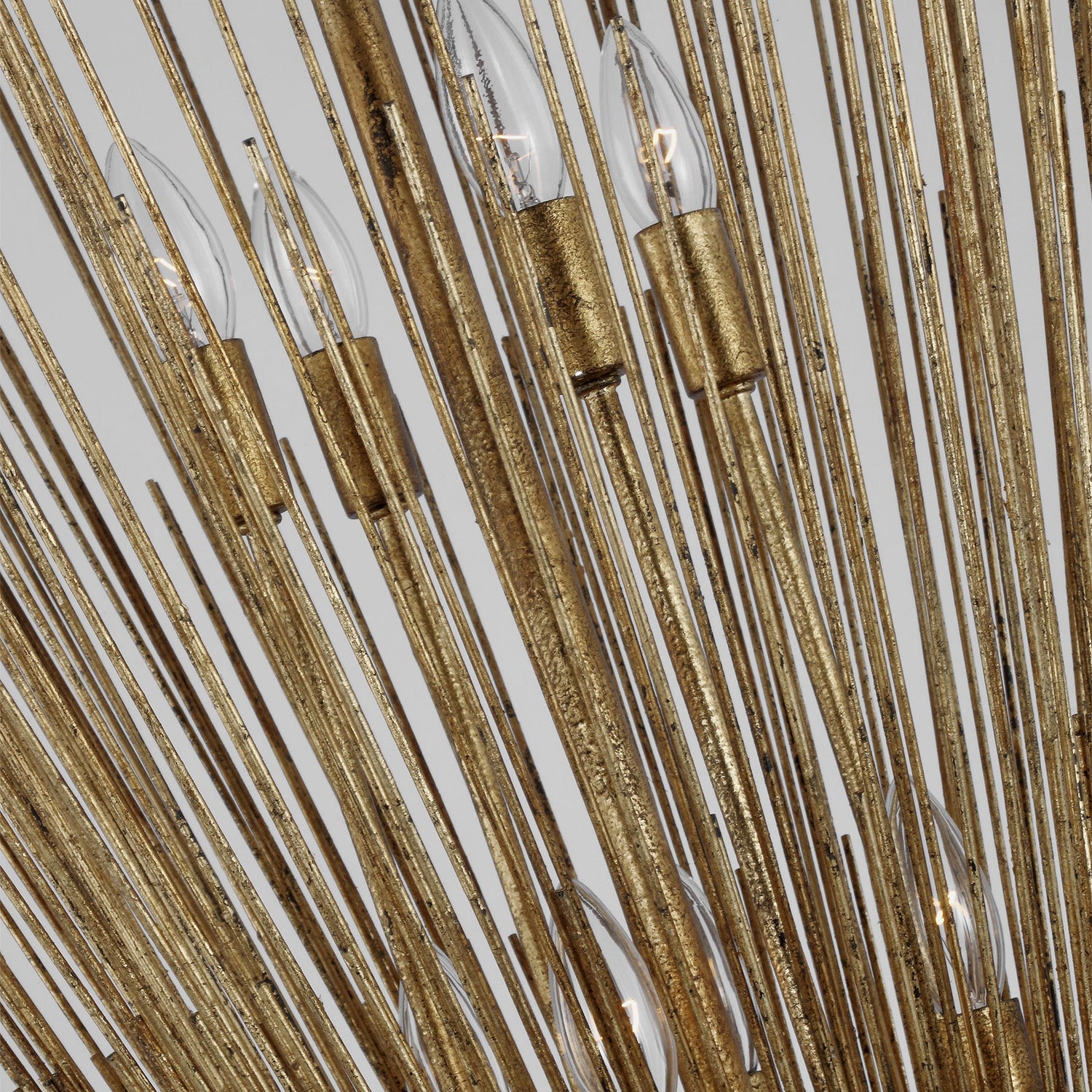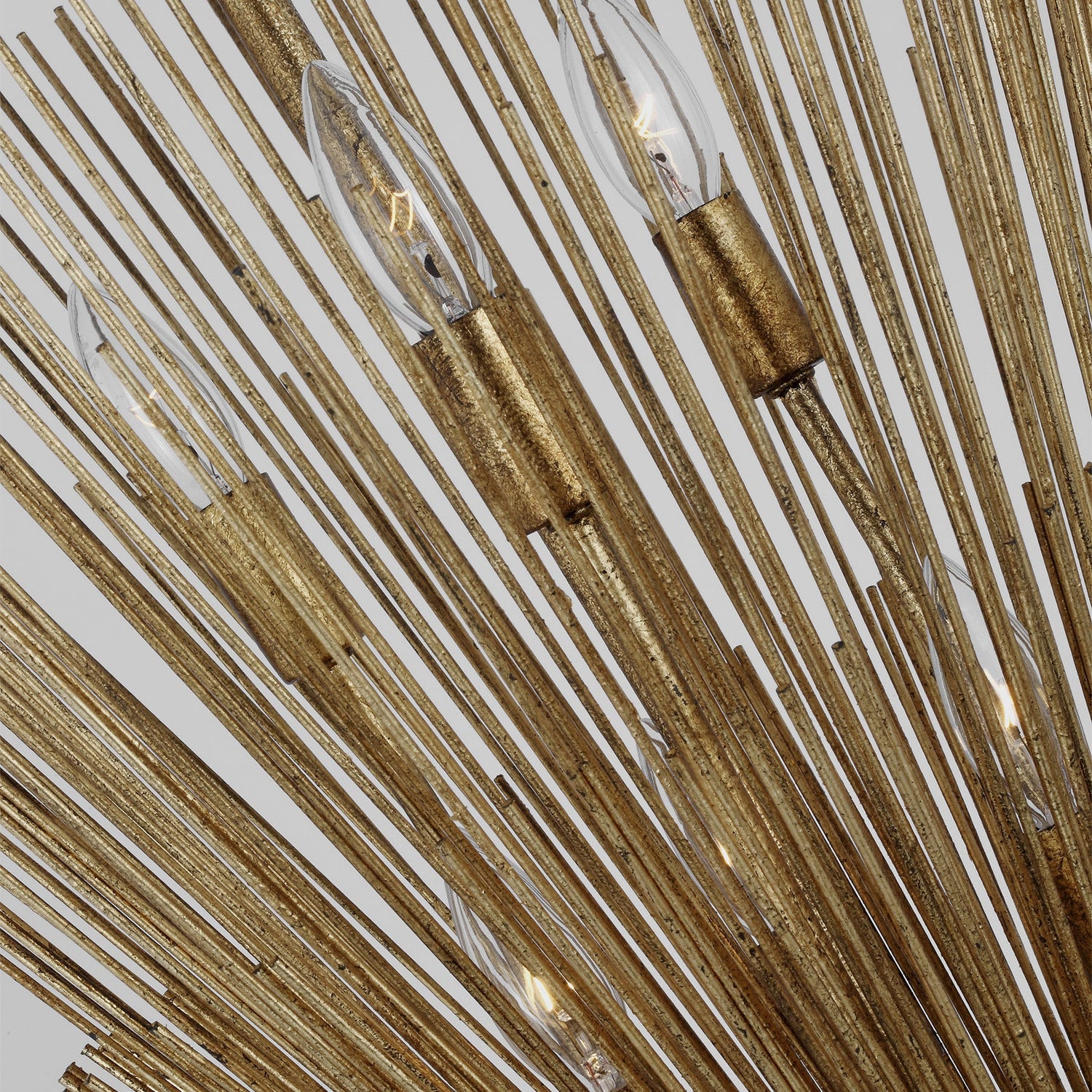 Named after the Greek God of the Sun, the AH Alexa Hampton Helios pendant in Antique Gild is made with hand applied gold leaf and then hand distressed. This Mid-Century Modern fixture takes the shape of its name, with up-flowing stems resting elegantly on a round metal canopy. Straw-like brass layers of hand cut, hand welded metal rods form the shade of this textural fixture. The Alexa Hampton Helios pendant features a dynamically cut, sun-like form and gilded iron finish. This stunning piece is an eruption of light and brings a stylish presence to any aspect of your space. The assortment includes a four-light wide pendant, six-light small pendant, eight-light tall pendant, three-light semi-flush and one-light pocket sconce. Alexa Hampton is an industry force who honors tradition and commits to the future, providing smart, stylish, design-rich solutions for every aspect of the home. Alexa Hampton joins the Generation Lighting family with her new AH Alexa Hampton Collection that features fresh takes on traditional looks, beautiful and unique hand applied finishes, and stunning thoughtful inspired pieces.