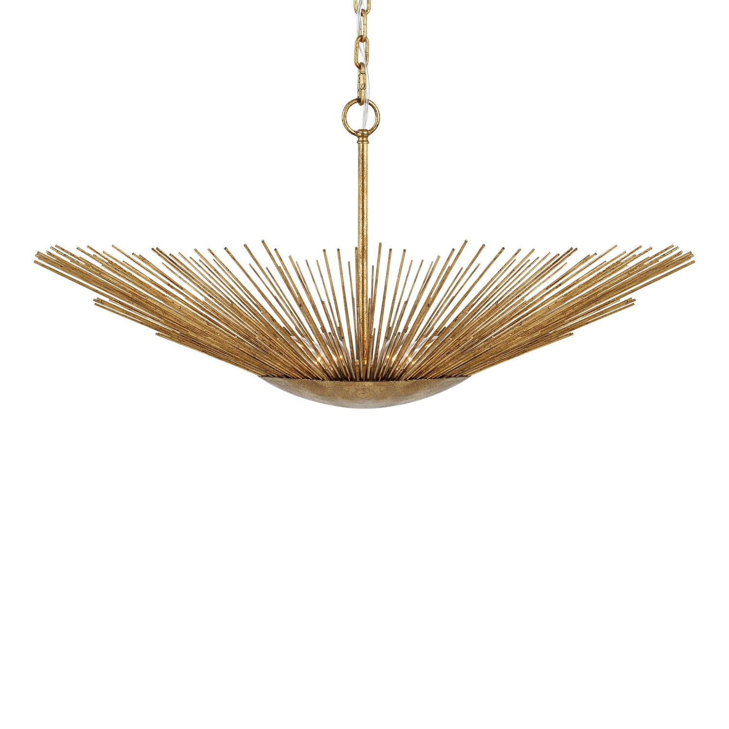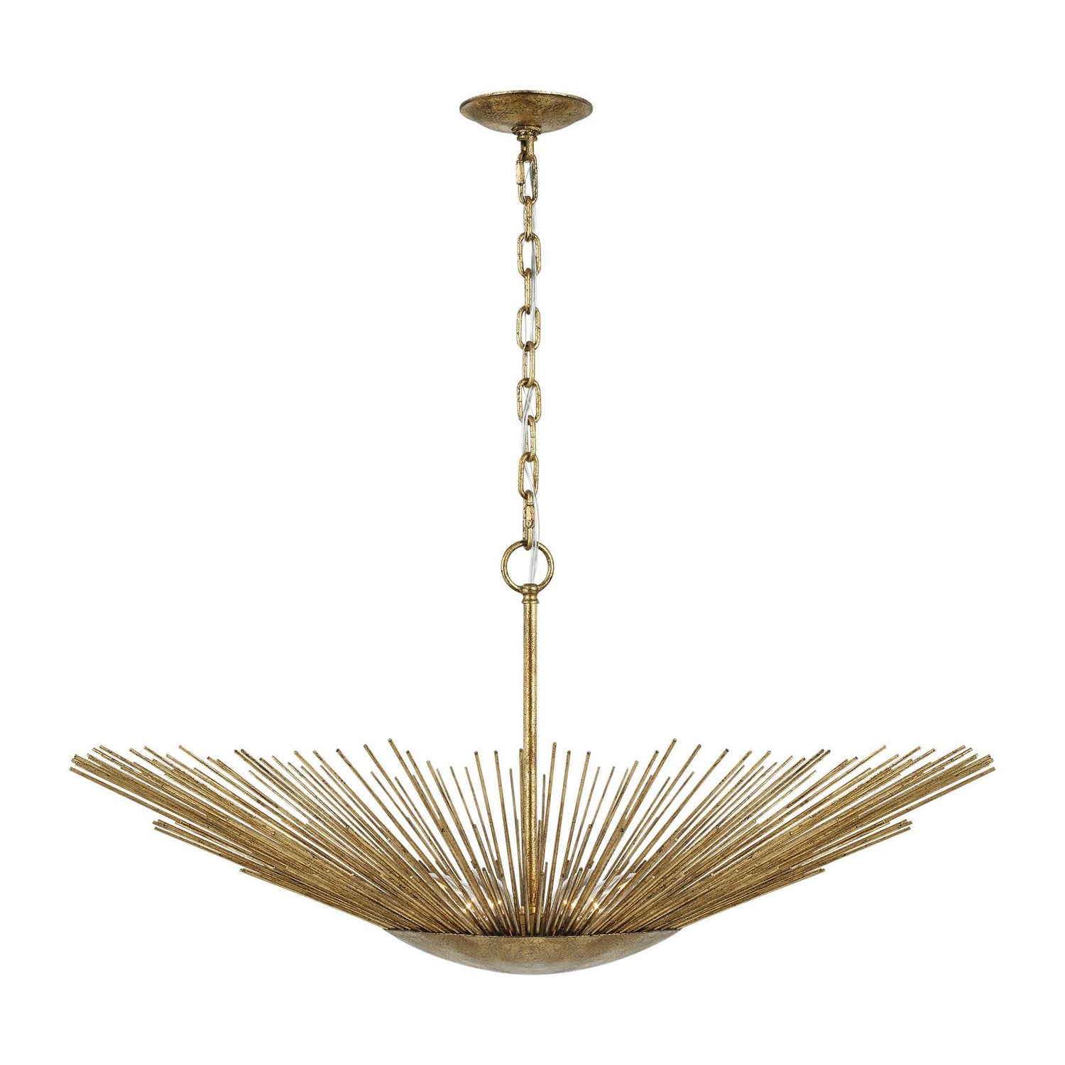 Named after the Greek God of the Sun, the AH Alexa Hampton Helios wide pendant in Antique Gild is made with hand applied gold leaf and then hand distressed. This Mid-Century Modern fixture takes the shape of its name, with up-flowing stems resting elegantly on a round metal canopy. Straw-like brass layers of hand cut, hand welded metal rods form the shade of this textural fixture. The Alexa Hampton Helios pendant features a dynamically cut, sun-like form and gilded iron finish. This stunning piece is an eruption of light and brings a stylish presence to any aspect of your space. The assortment includes a four-light wide pendant, six-light small pendant, eight-light tall pendant, three-light semi-flush and one-light pocket sconce. Alexa Hampton is an industry force who honors tradition and commits to the future, providing smart, stylish, design-rich solutions for every aspect of the home. Alexa Hampton joins the Generation Lighting family with her new AH Alexa Hampton Collection that features fresh takes on traditional looks, beautiful and unique hand applied finishes, and stunning thoughtful inspired pieces.