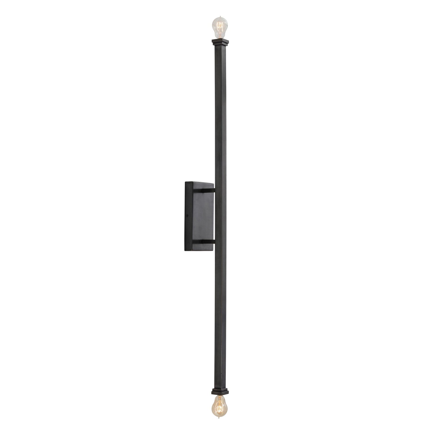 The bronzed two-light sconce is a truly minimalist expression of traditional ironwork, consisting of a single hand-forged stem and dual Edison-style candelabra bulbs. Use it in pairs for classical symmetry, or in numbers to line a foyer or hallway. Shown with a nostalgic loop bulb.